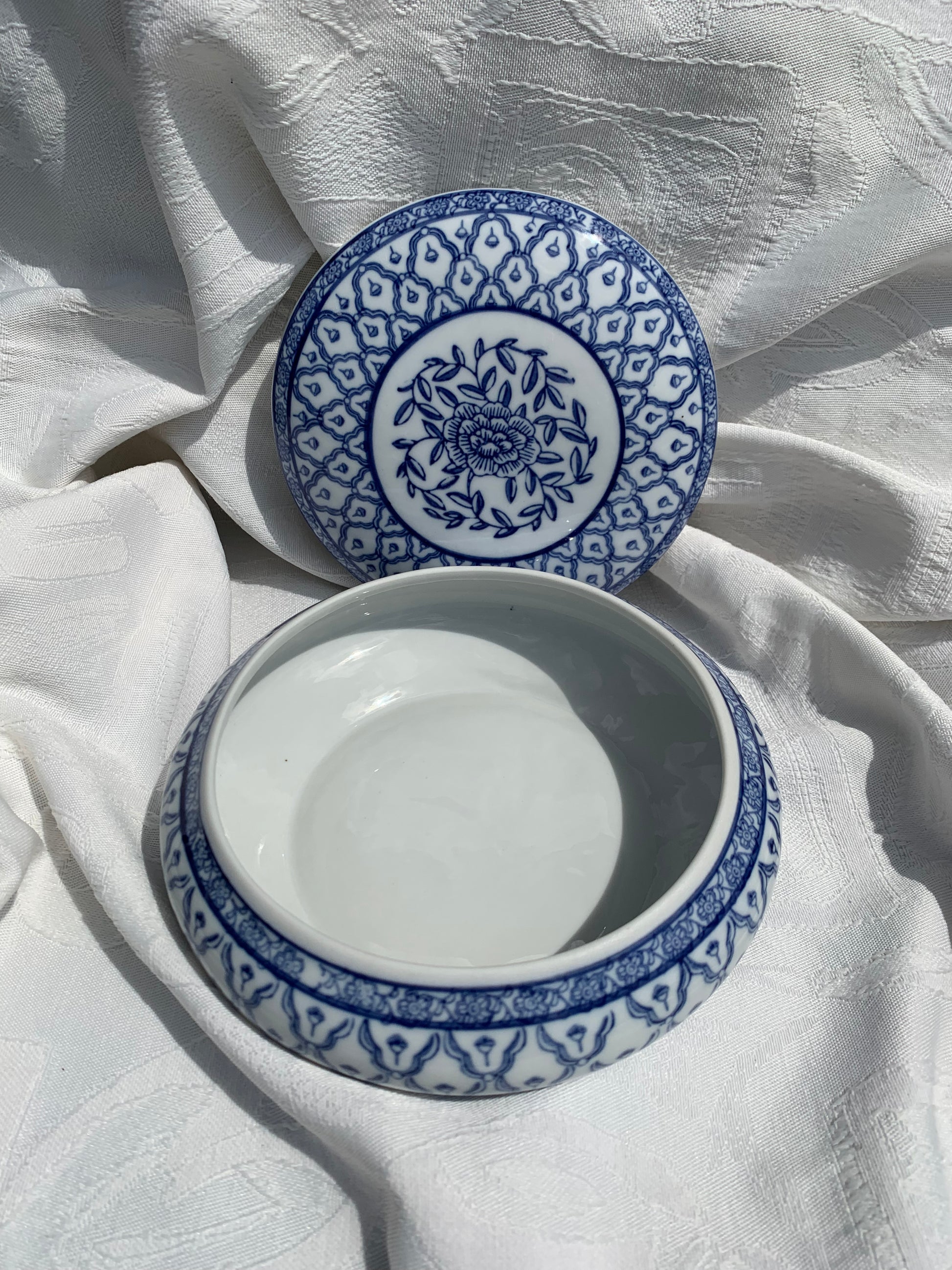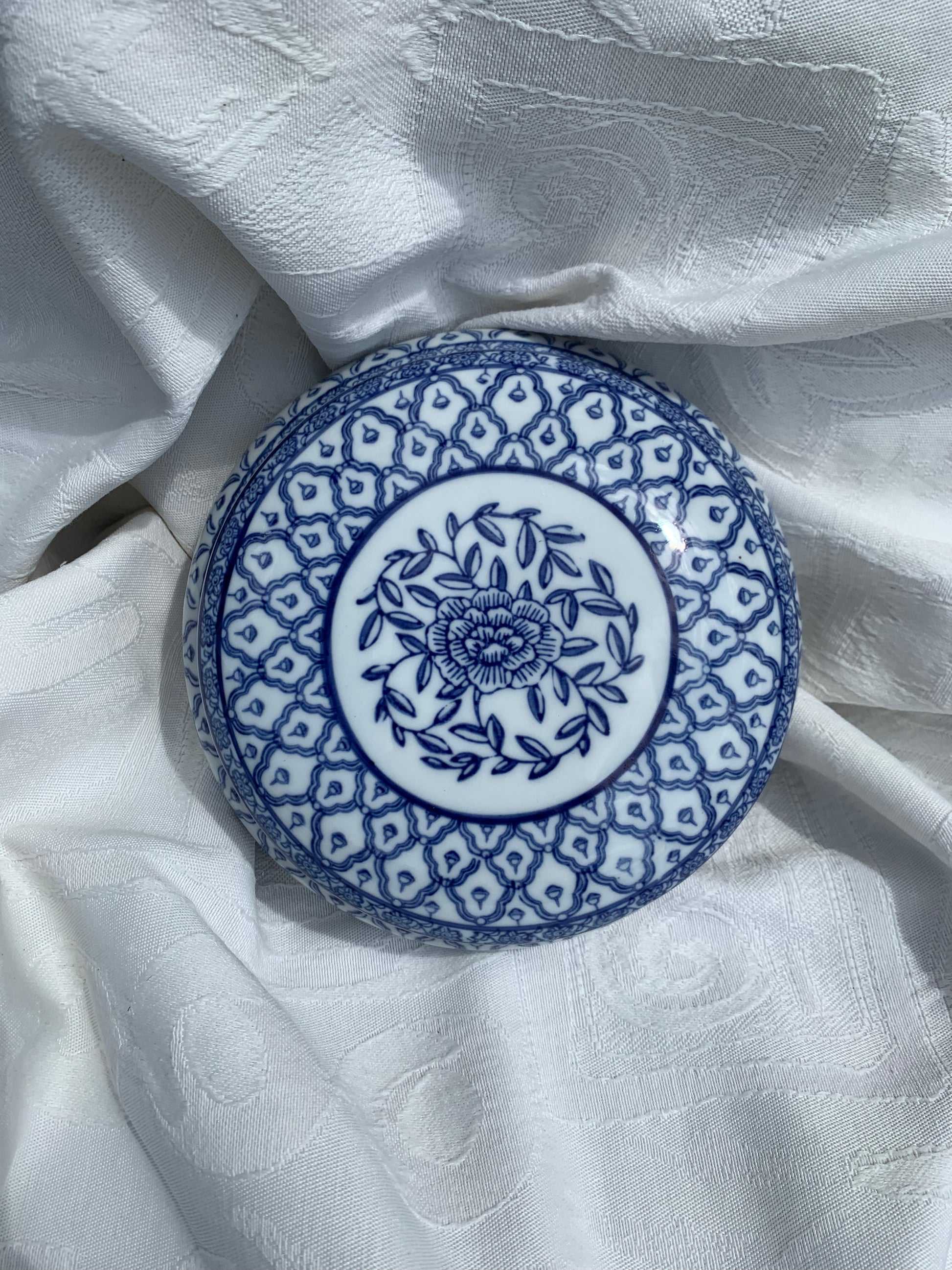 Magnifique boîte ronde en porcelaine minutieusement peinte à la main. Idéale pour ranger vos bijoux, sachets de thé ou toutes autres choses qui vous sont précieuses !