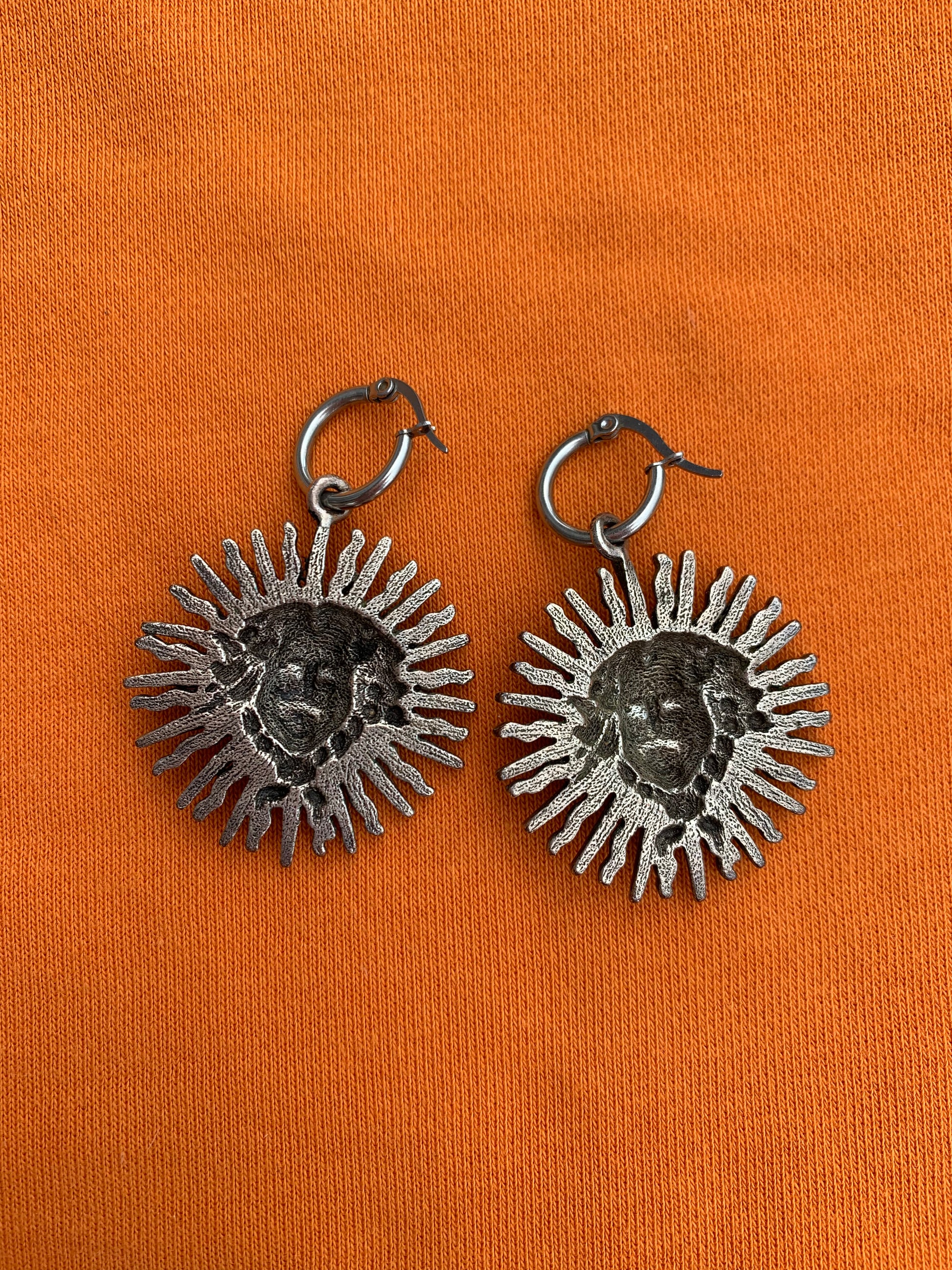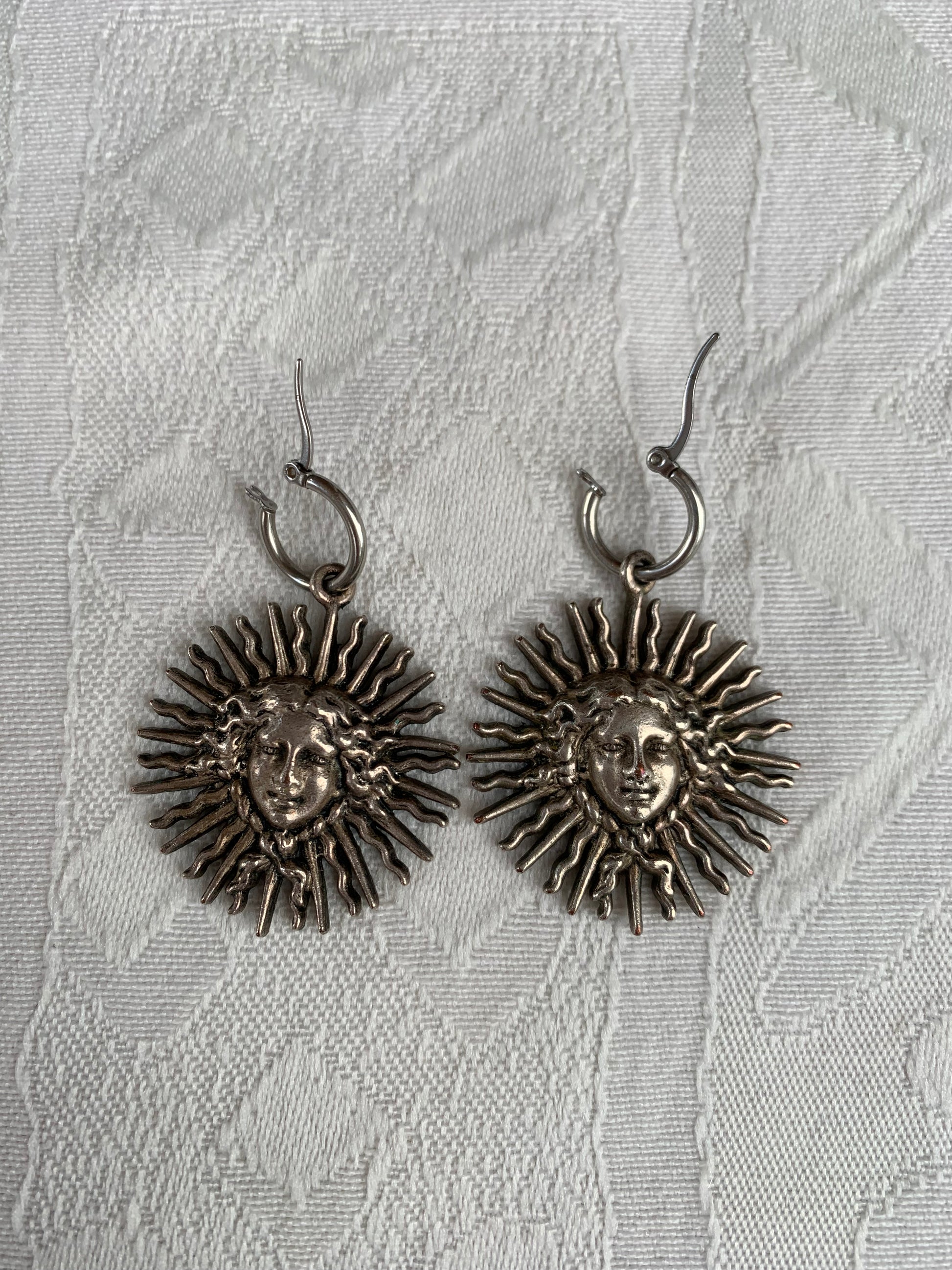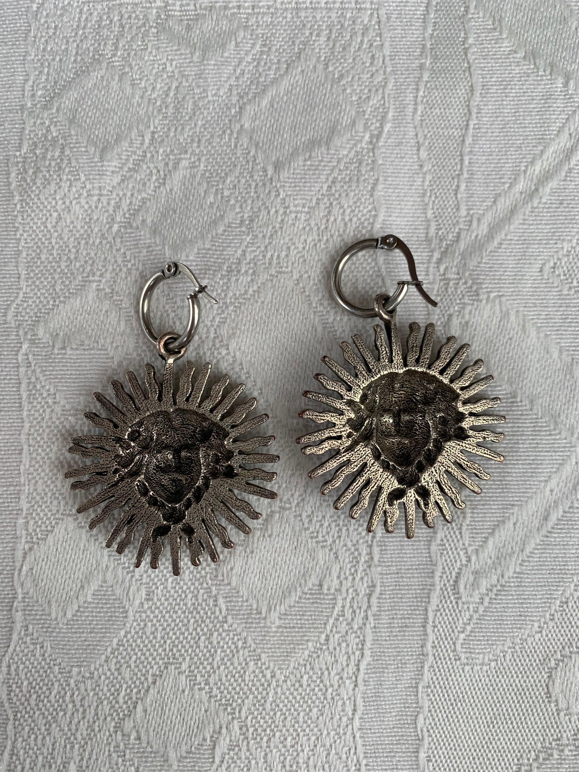Magnifique boucles d'oreilles en forme de soleil, en excellent état. Elles sont relativement lourdes, une boucle d'oreille pèse 13,5g. Les fermoirs sont solides.