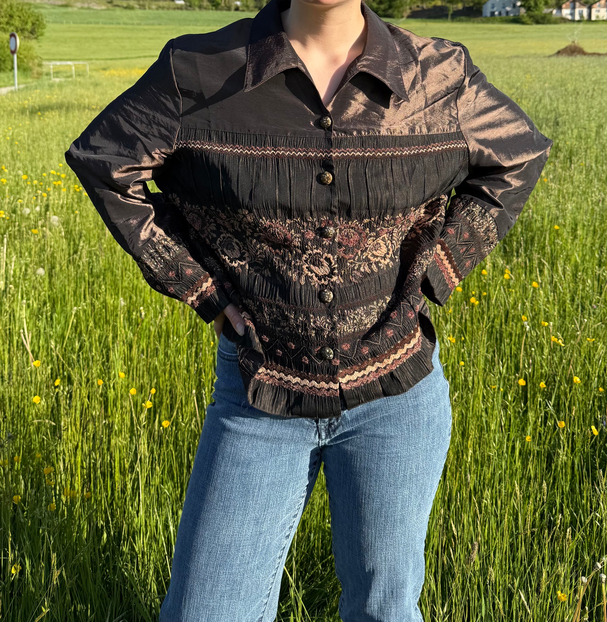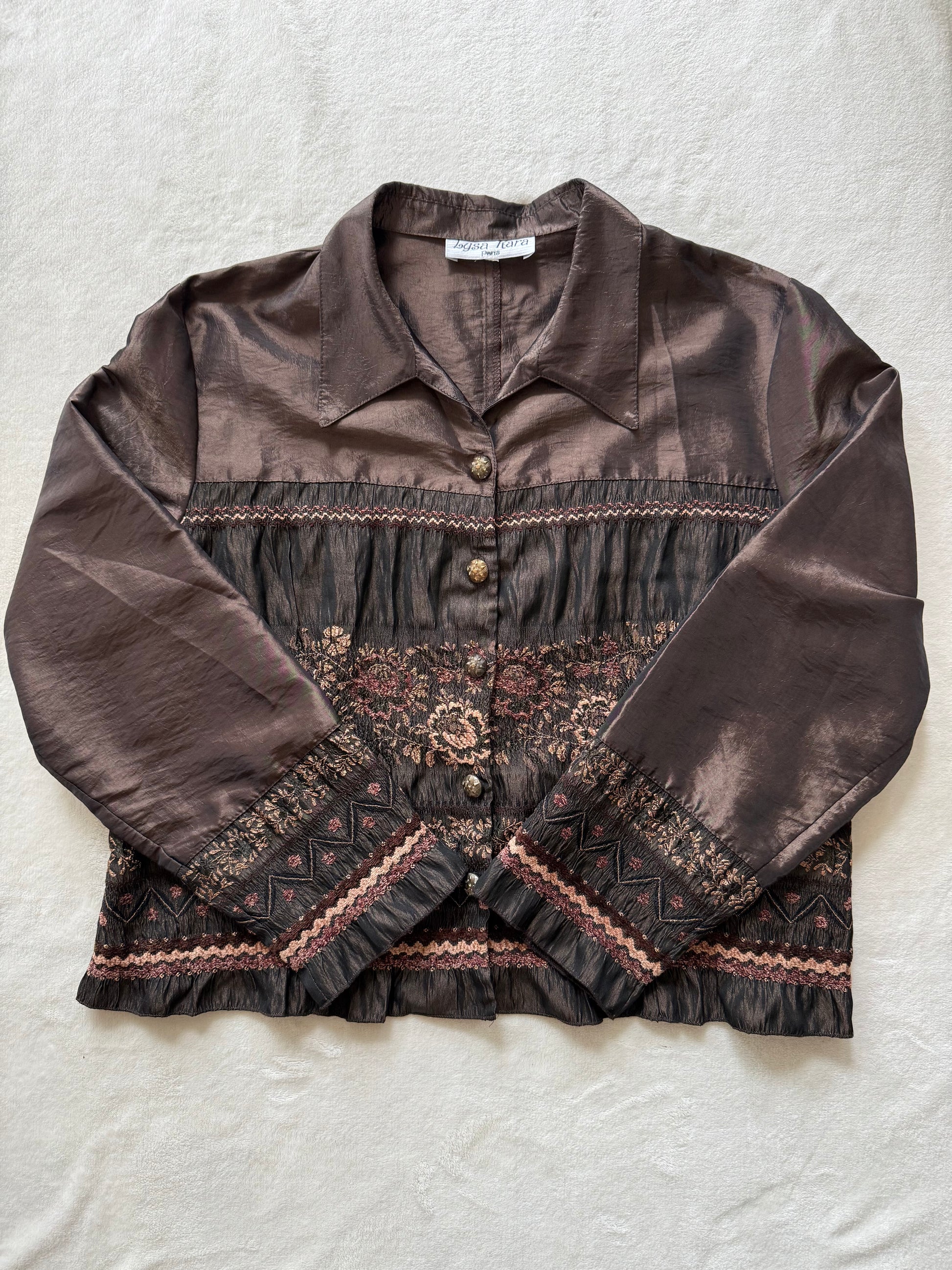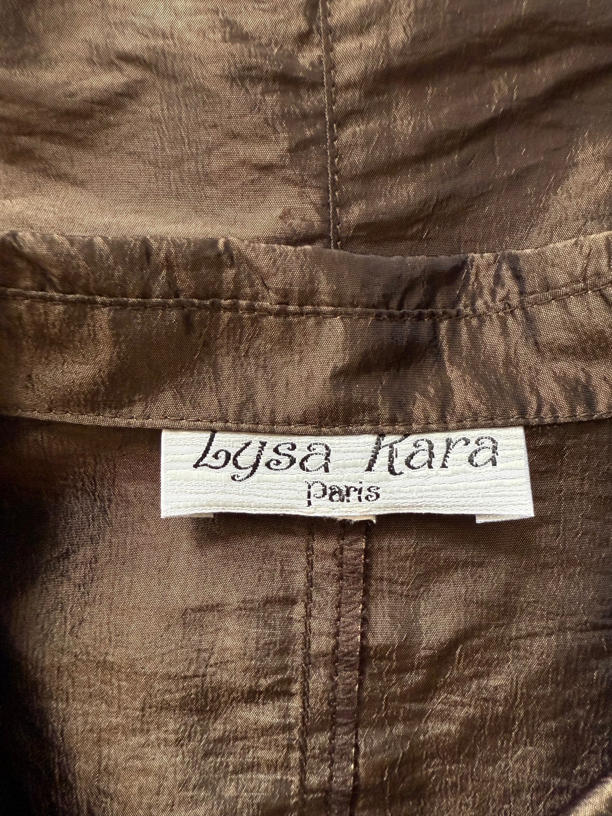 Très joli chemisier Lysa Kara Paris taille M voir L, fabriqué en France. Sur l'étiquette il y a indiqué lavage à la main, mais nous l'avons lavé à la machine et ça ne l'a pas du tout abîmé.