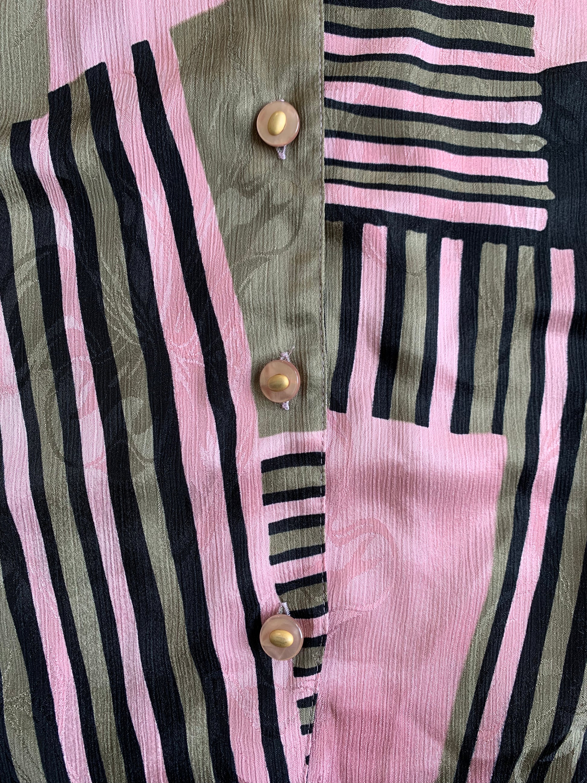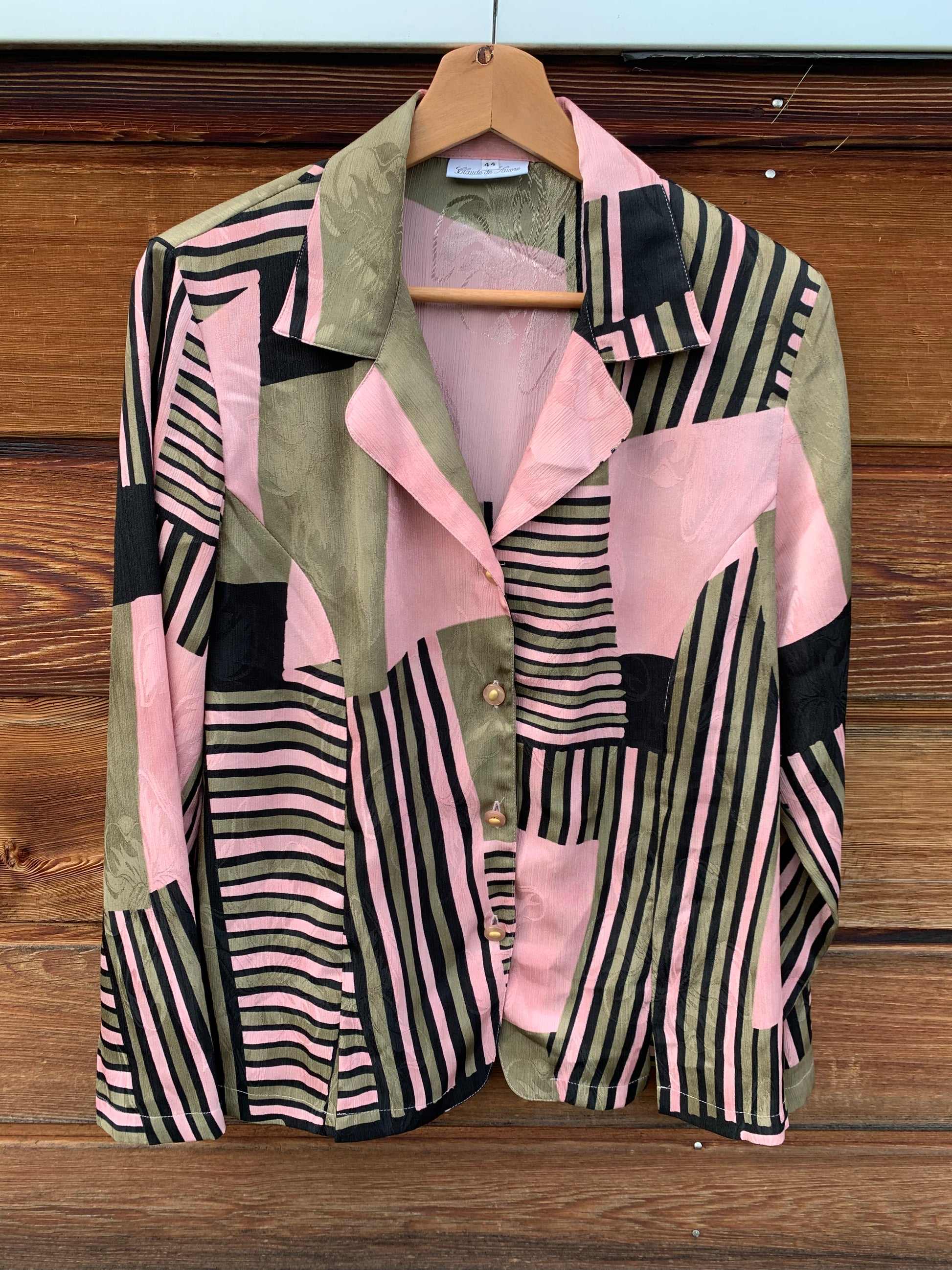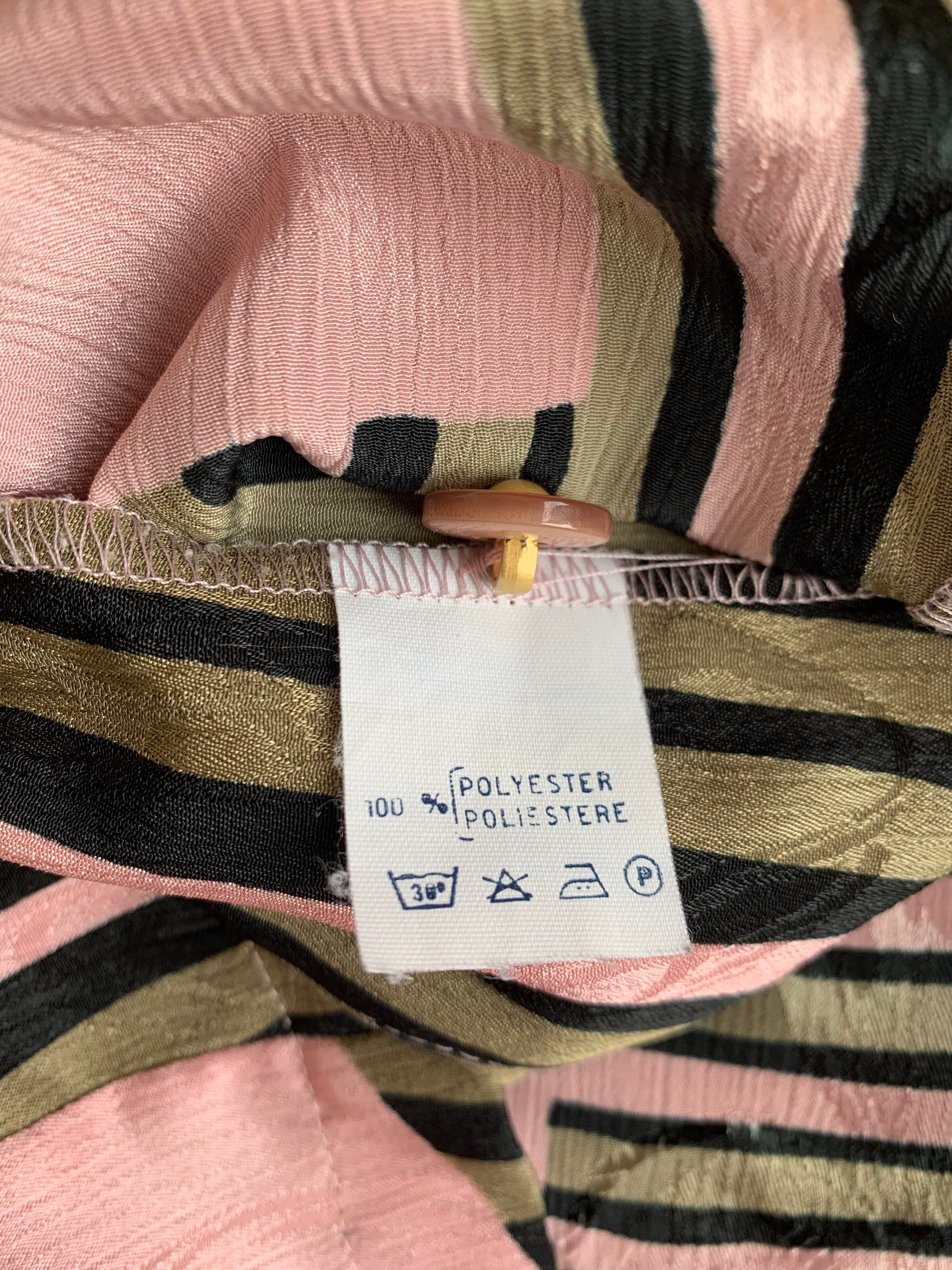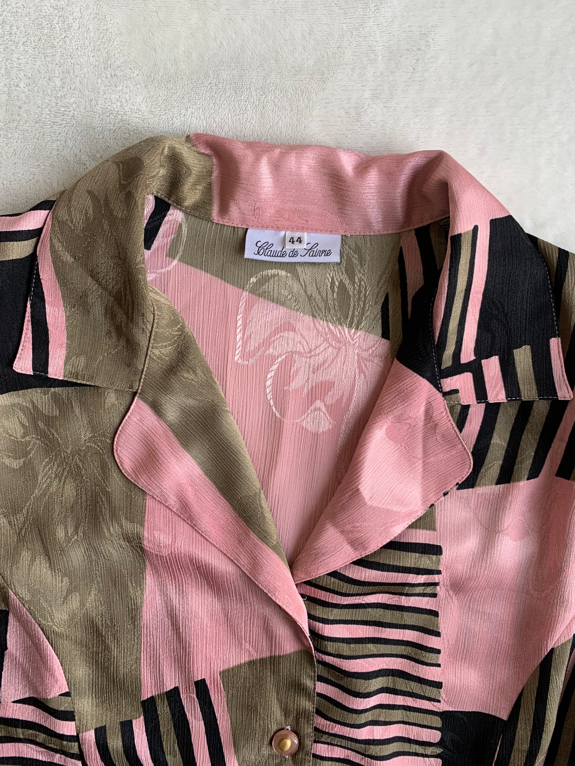 Chemisier aux motifs originaux de la marque Claude de Saivre. Il a des épaulettes qui peuvent facilement être retirées si besoin. Sur l'étiquette il est indiqué taille femme 44 mais ça correspond davantage à une taille M.
