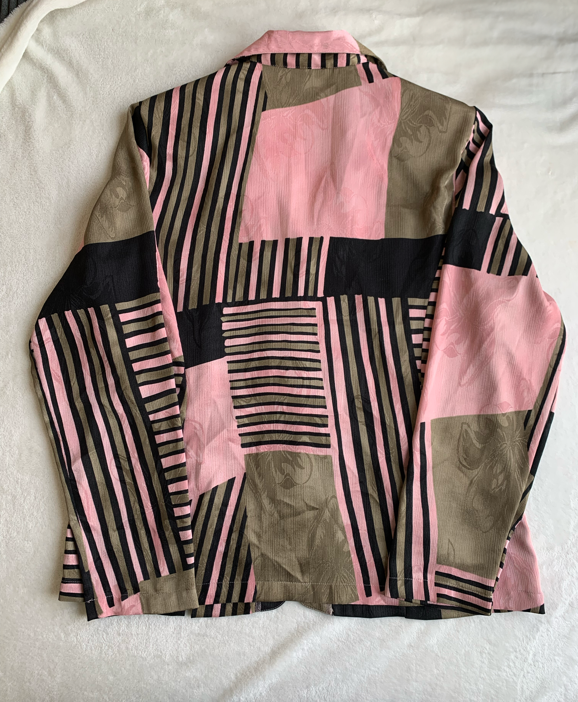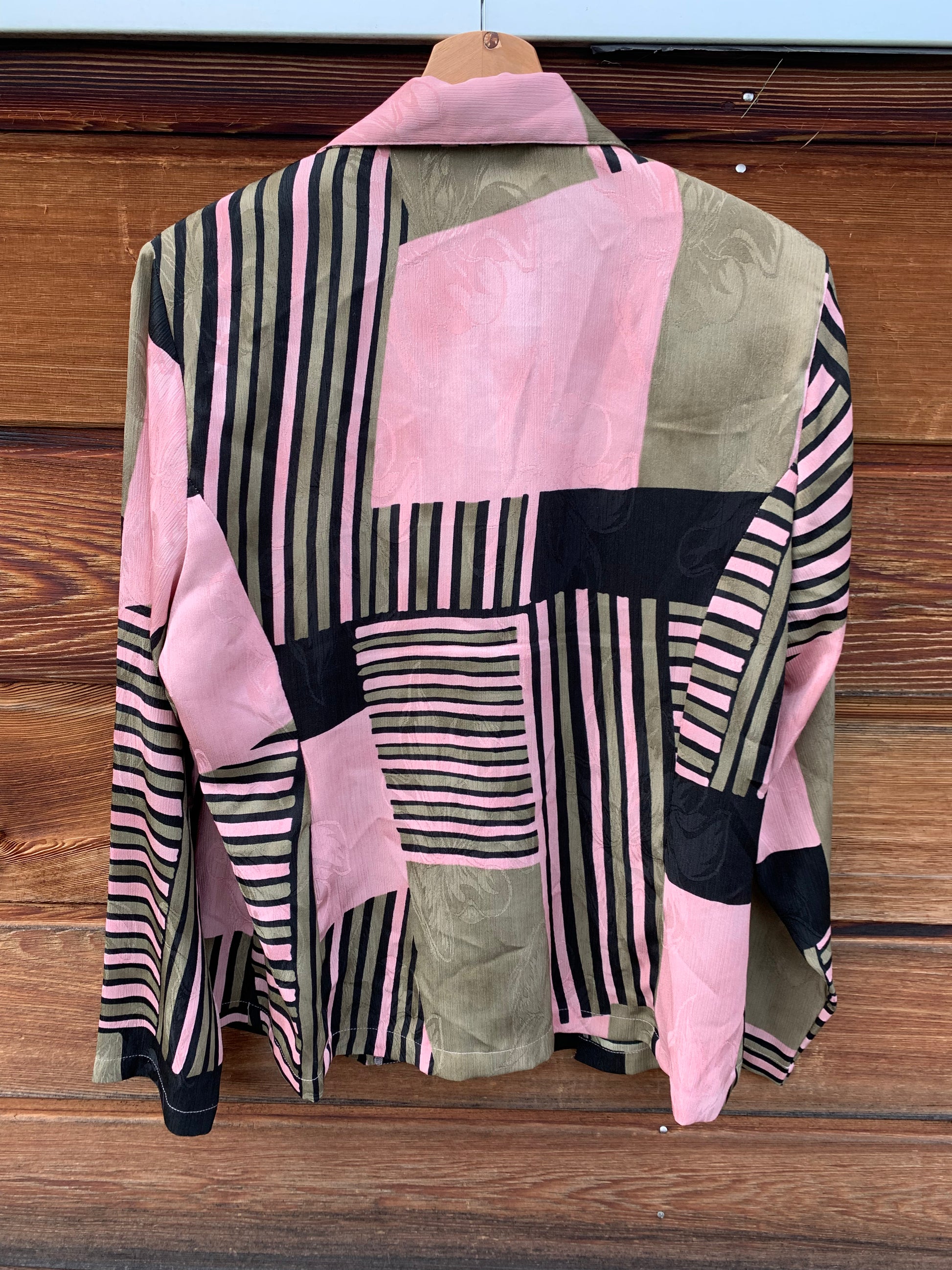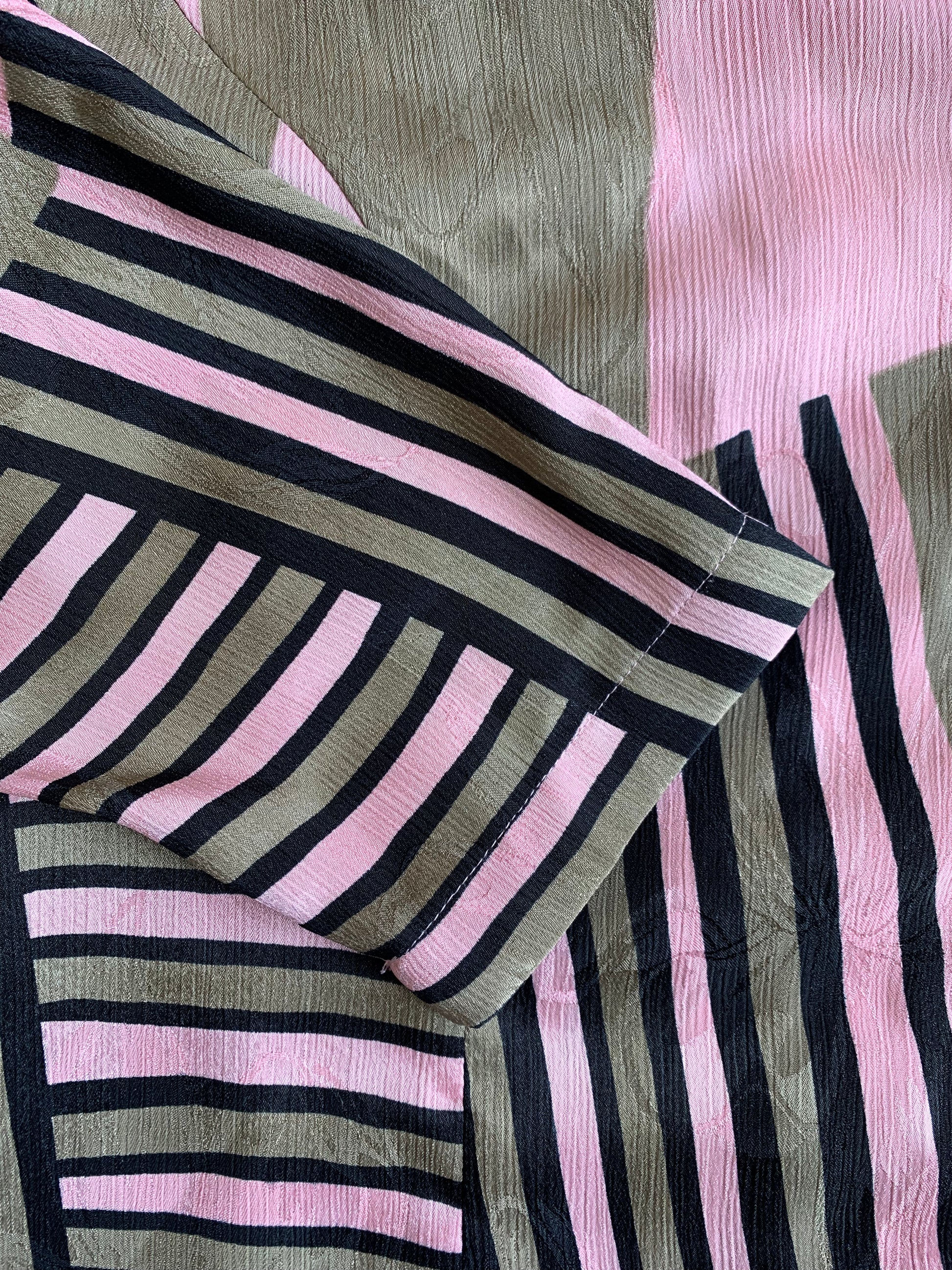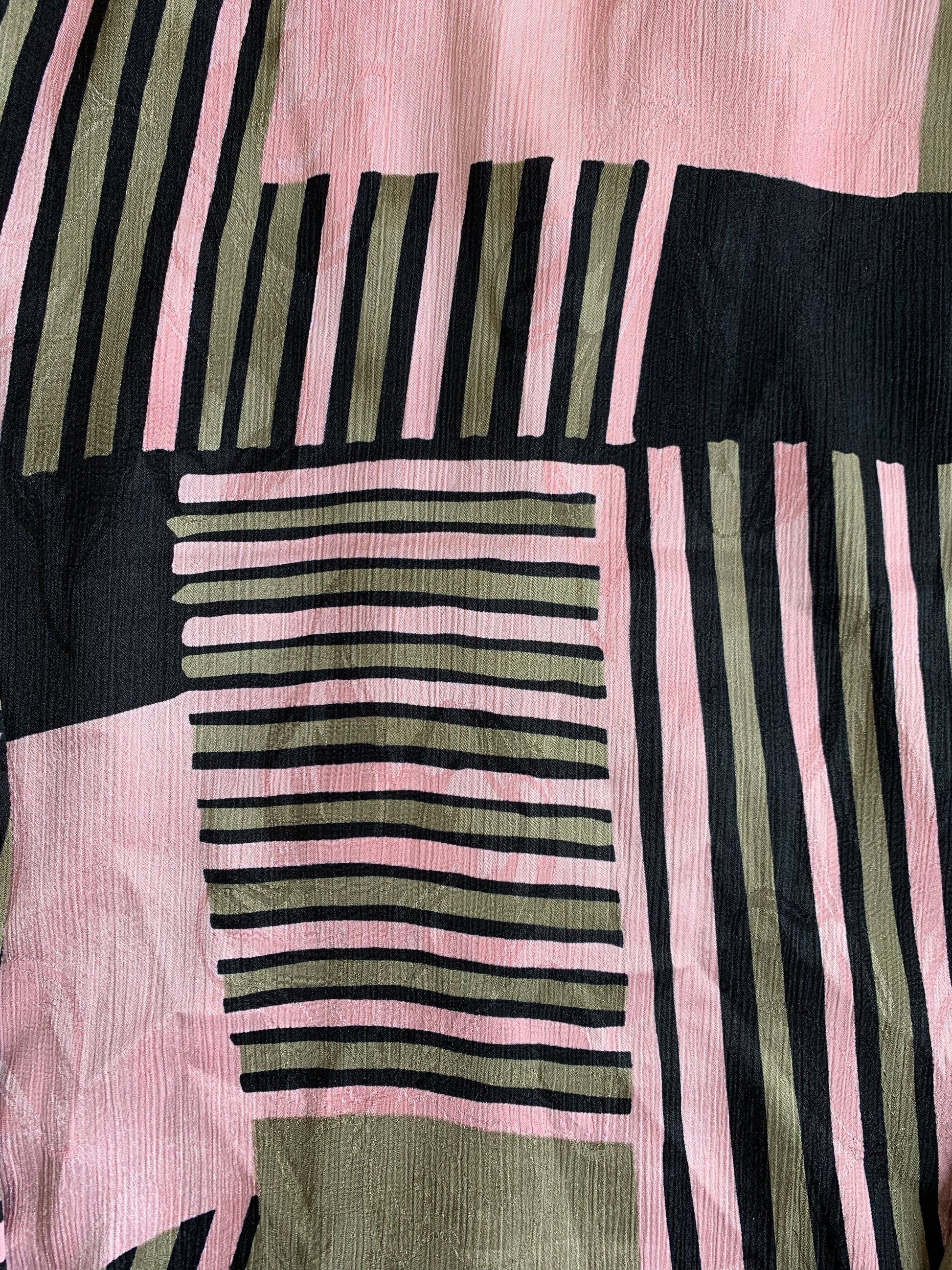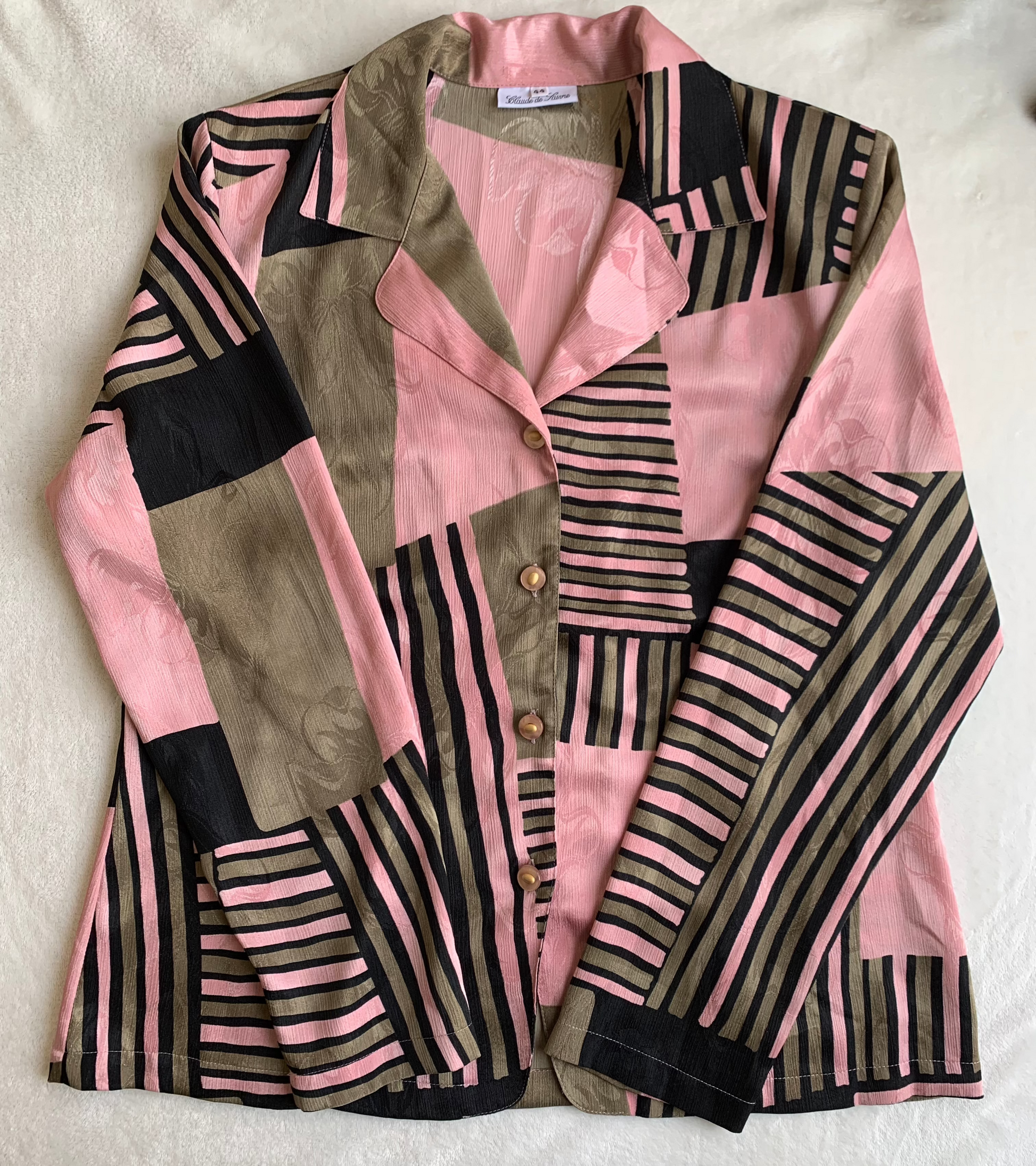 Chemisier aux motifs originaux de la marque Claude de Saivre. Il a des épaulettes qui peuvent facilement être retirées si besoin. Sur l'étiquette il est indiqué taille femme 44 mais ça correspond davantage à une taille M.