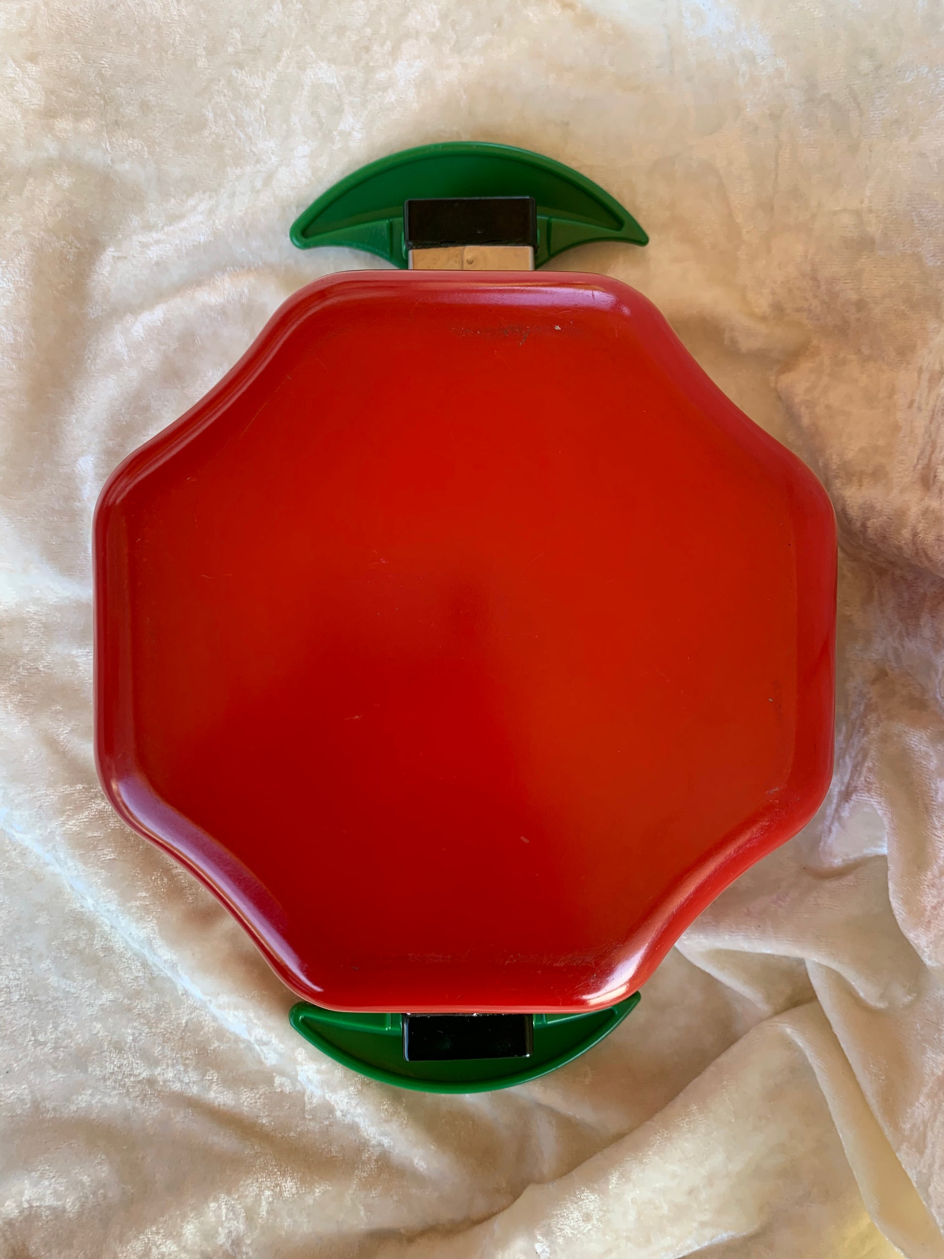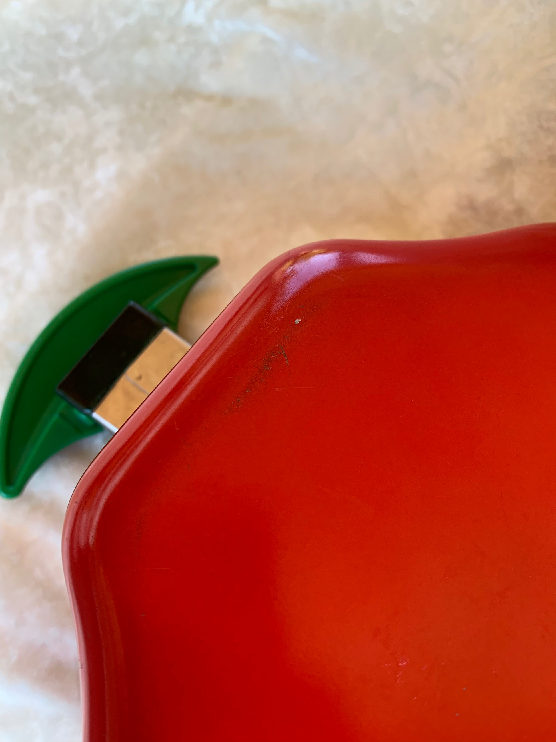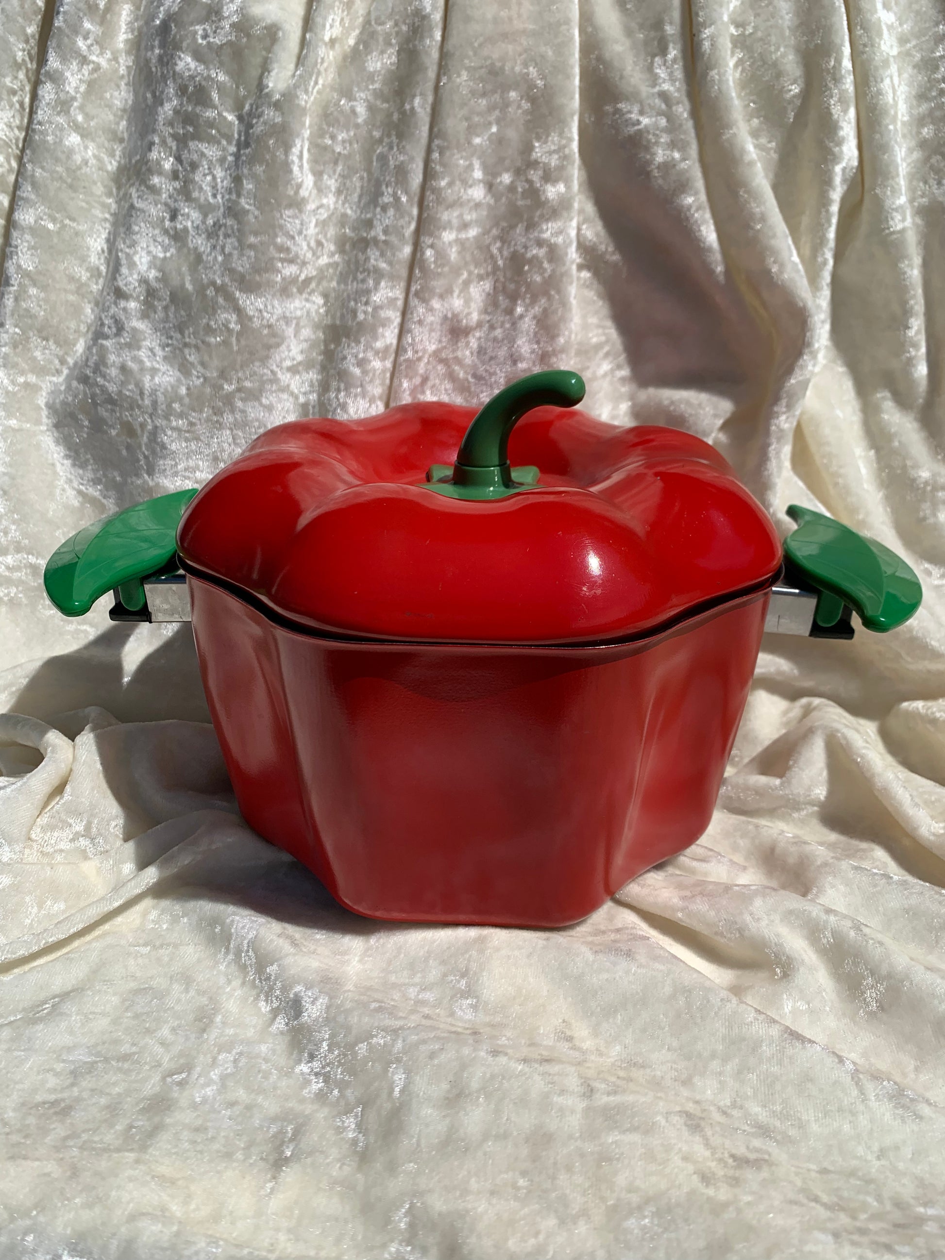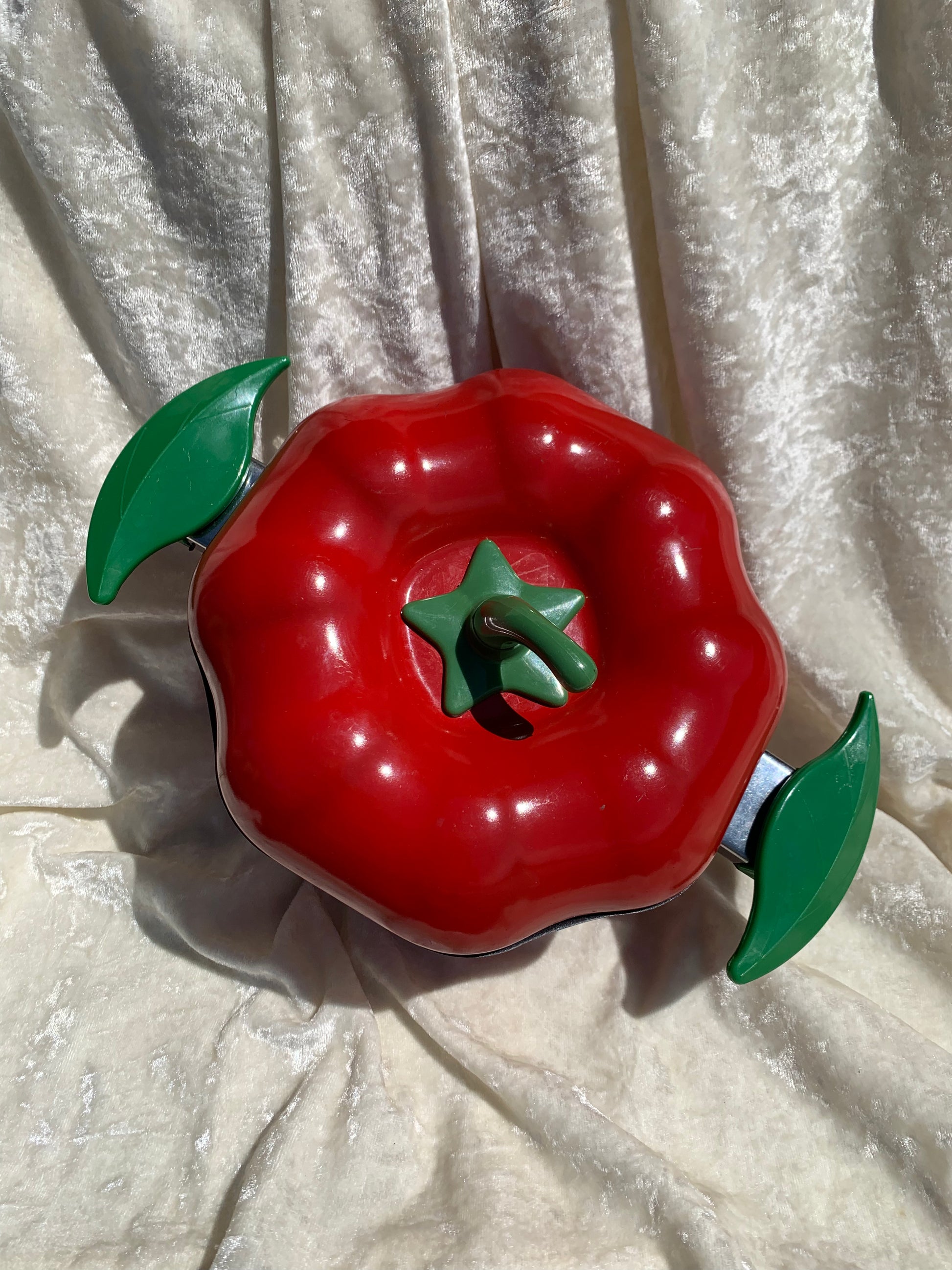 En forme de poivron ou de tomate, c'est comme vous voulez. L'accessoire vintage et original par excellence à avoir dans sa cuisine pour concocter de bons petits plats ! Les deux poignées vertes sur les côtés sont amovibles, elles peuvent se baisser.