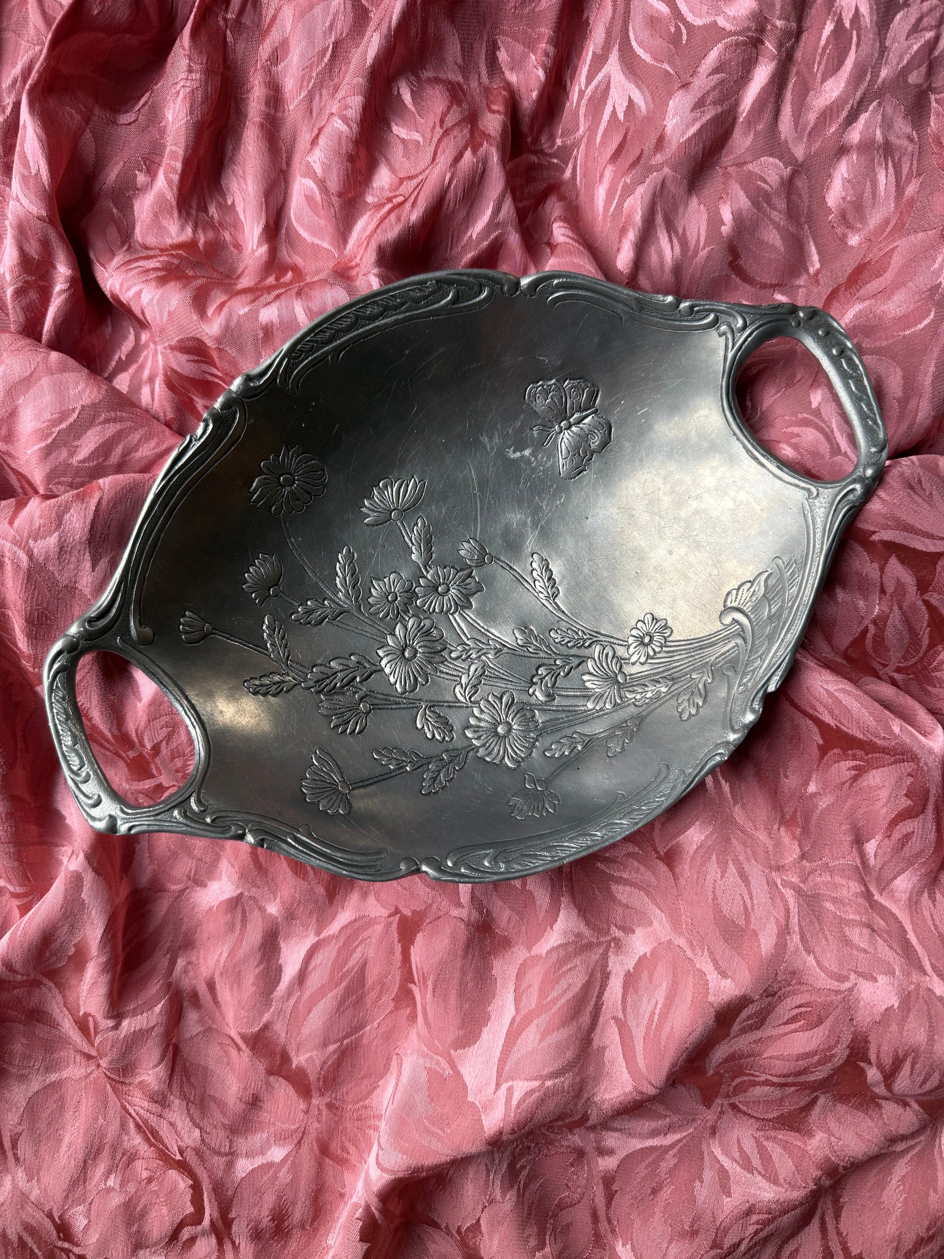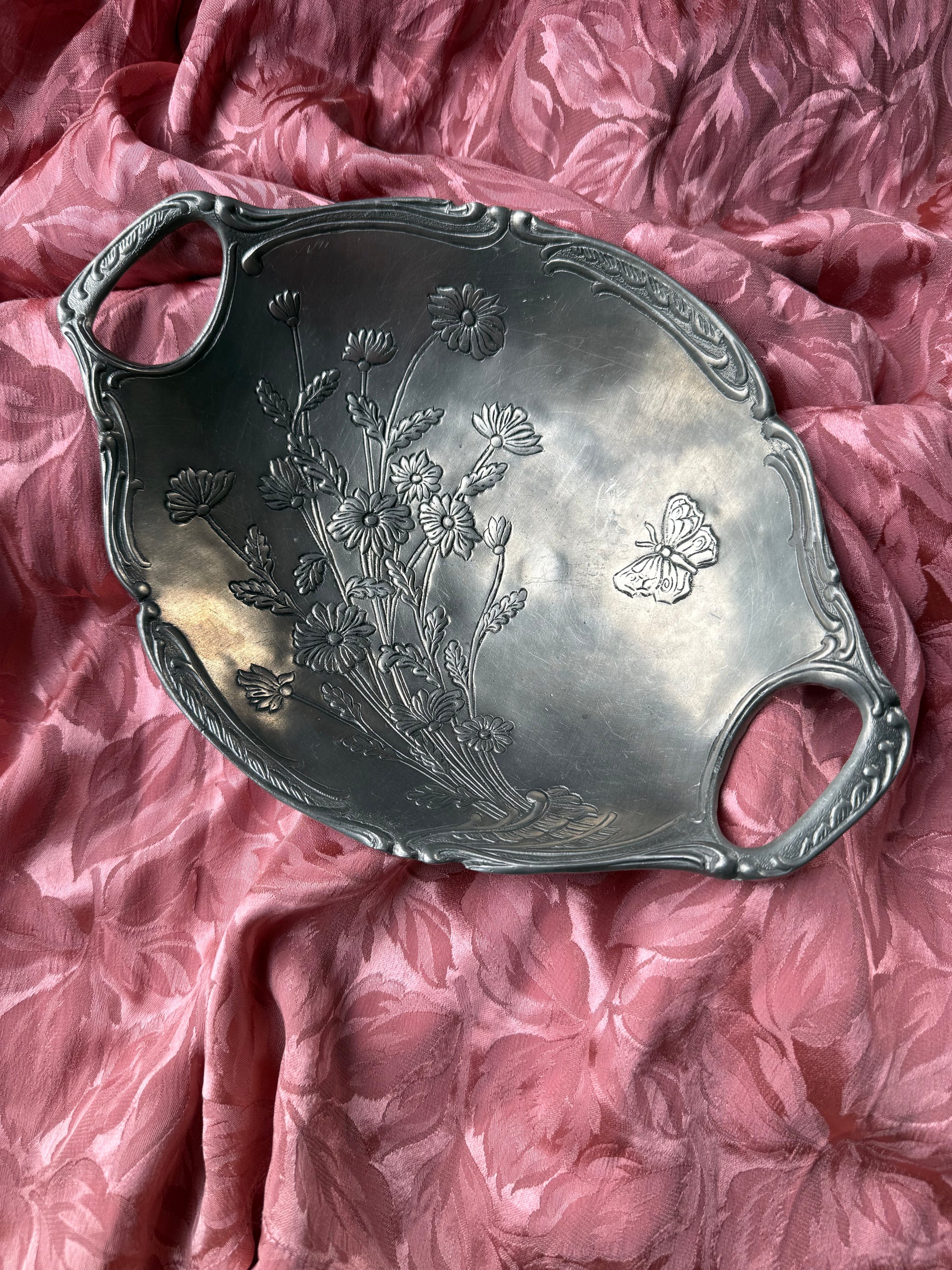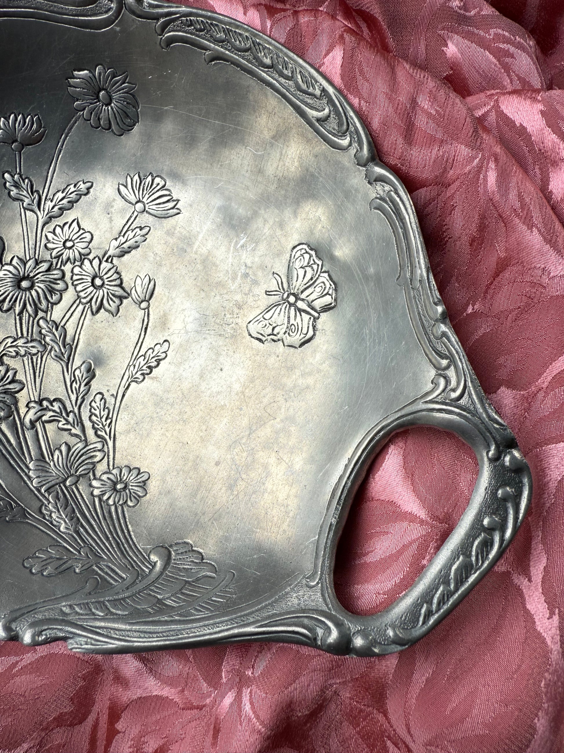 Très jolie coupe / plat en étain Gallo-Romaine exempt plomb avec des fleurs et un papillon gravés. Elle a des rayures et marques d'usure que vous pouvez apercevoir sur les photos mais elle est en très bon état général.