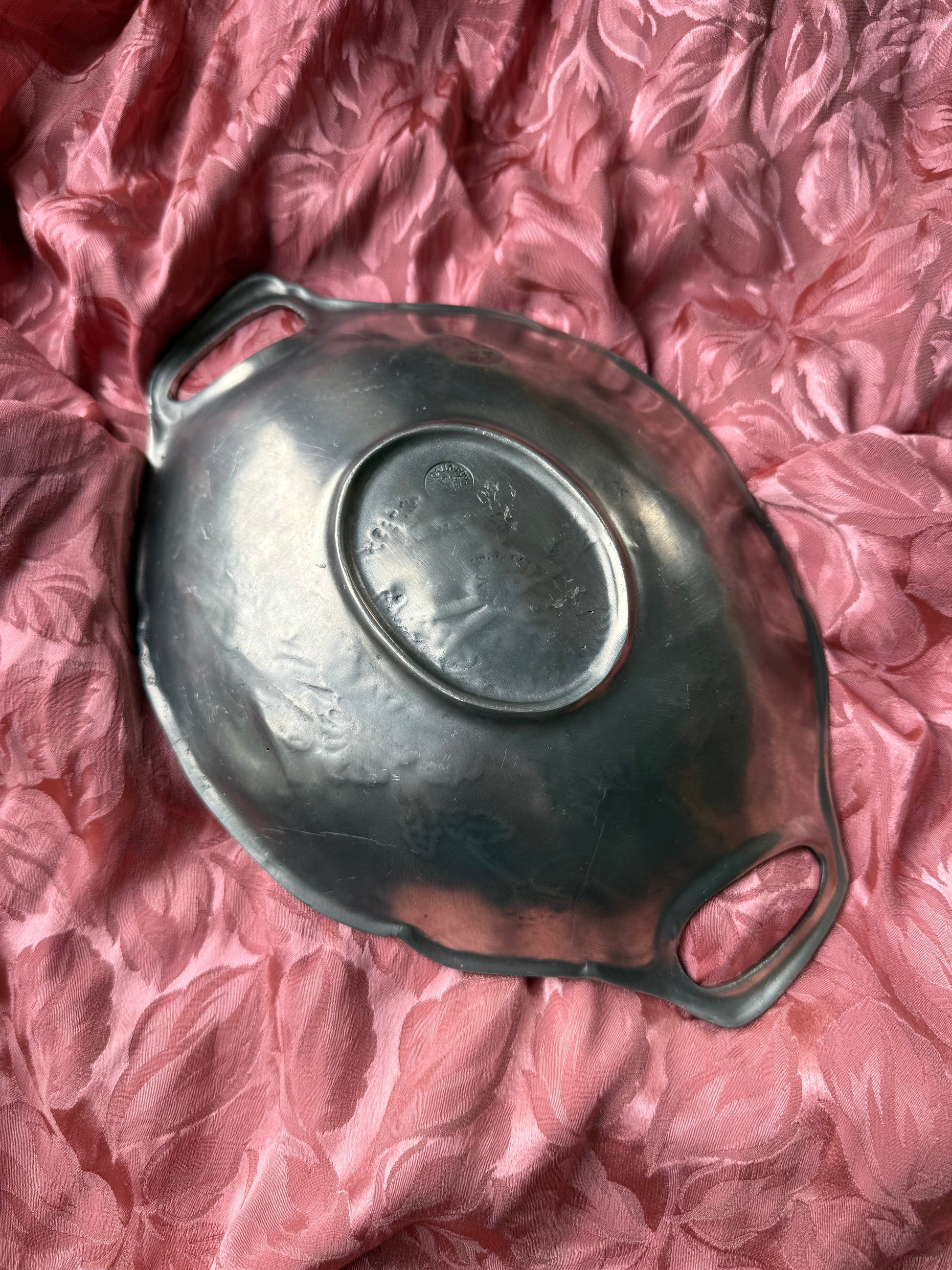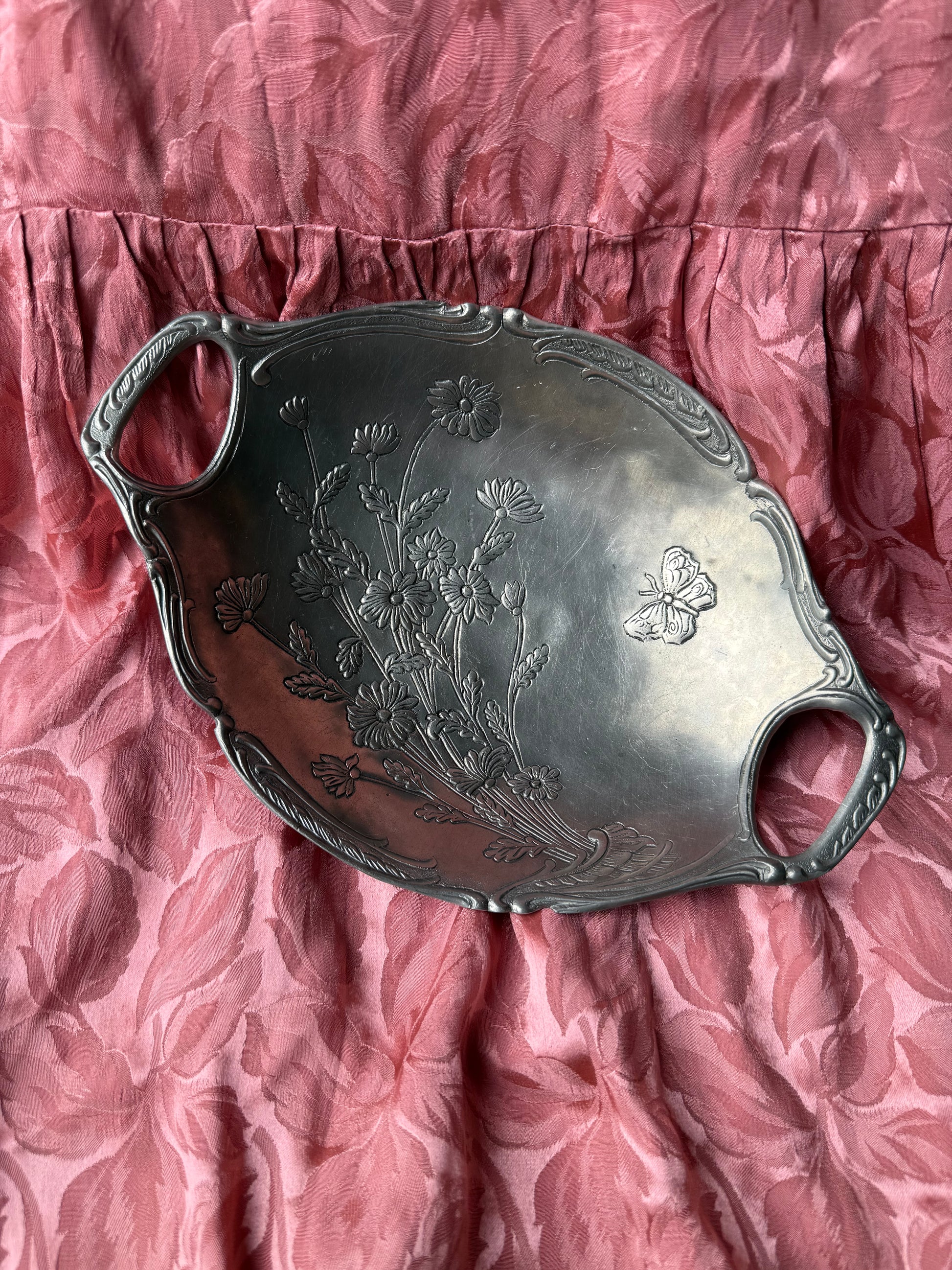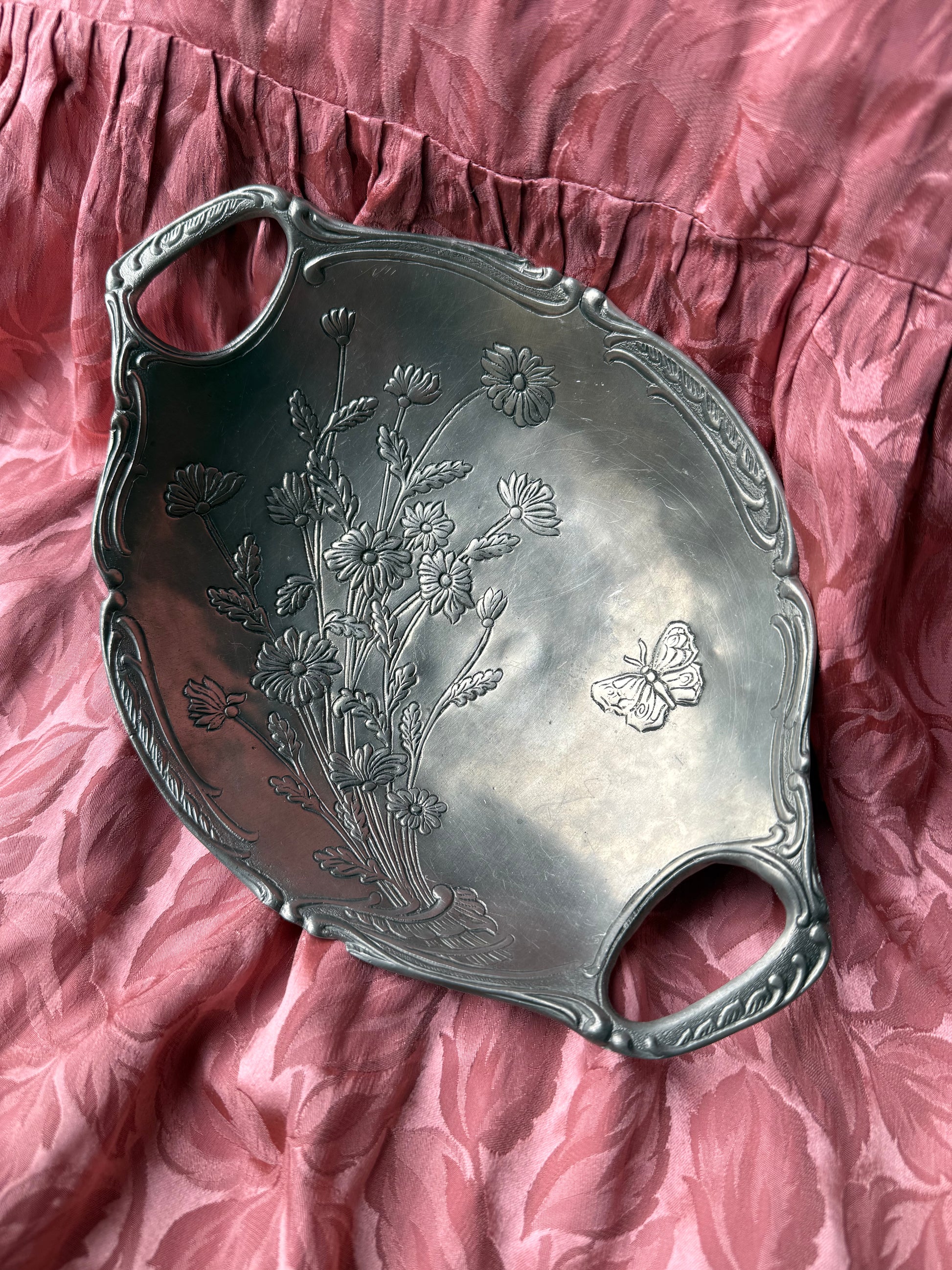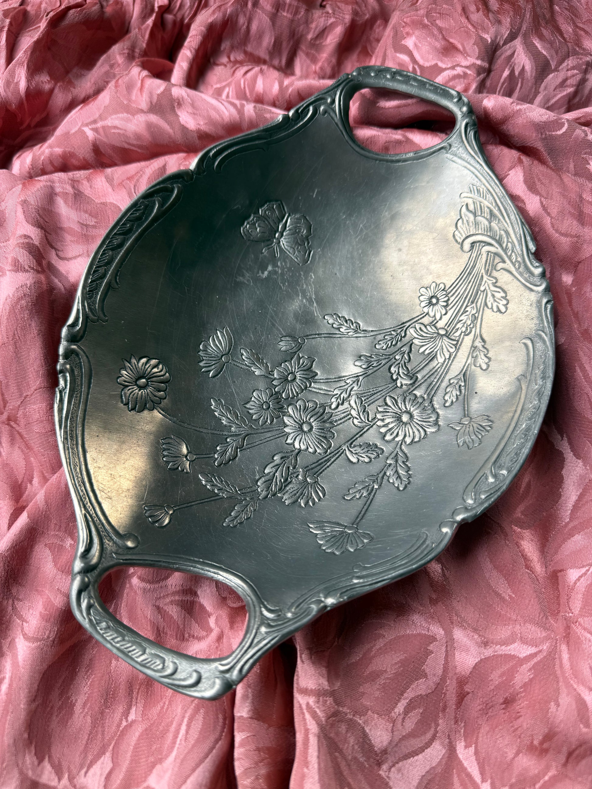 Très jolie coupe / plat en étain Gallo-Romaine exempt plomb avec des fleurs et un papillon gravés. Elle a des rayures et marques d'usure que vous pouvez apercevoir sur les photos mais elle est en très bon état général.