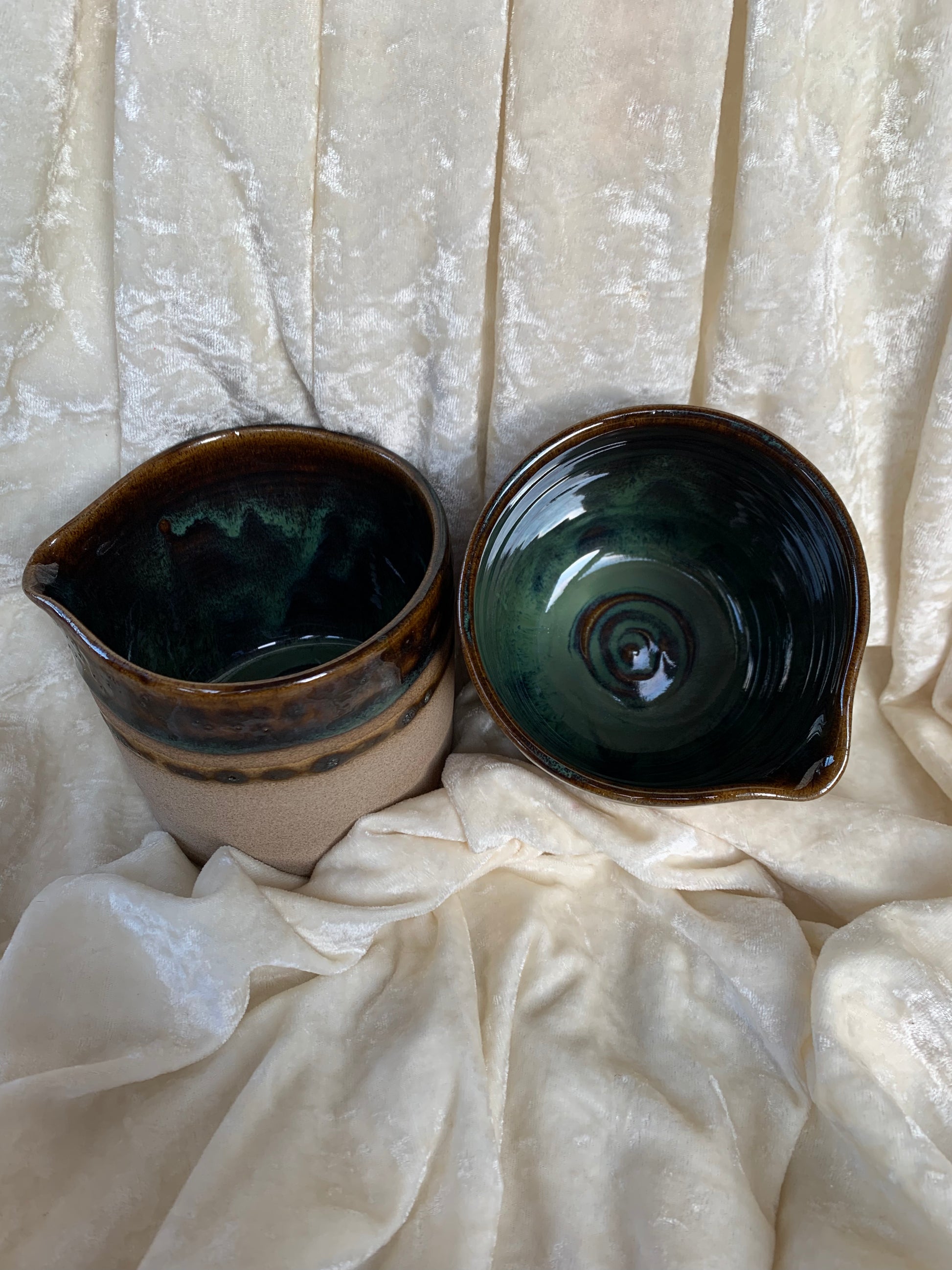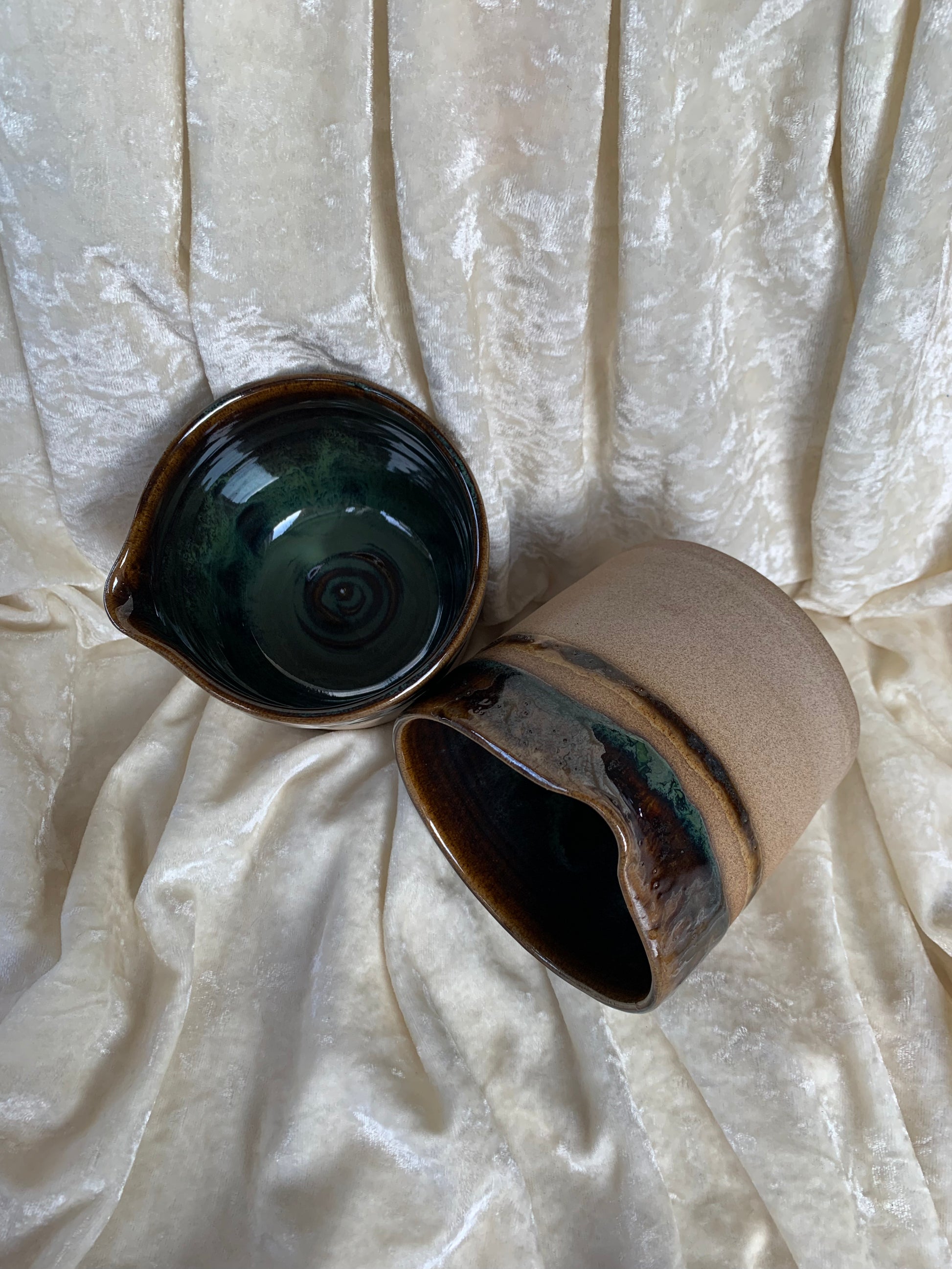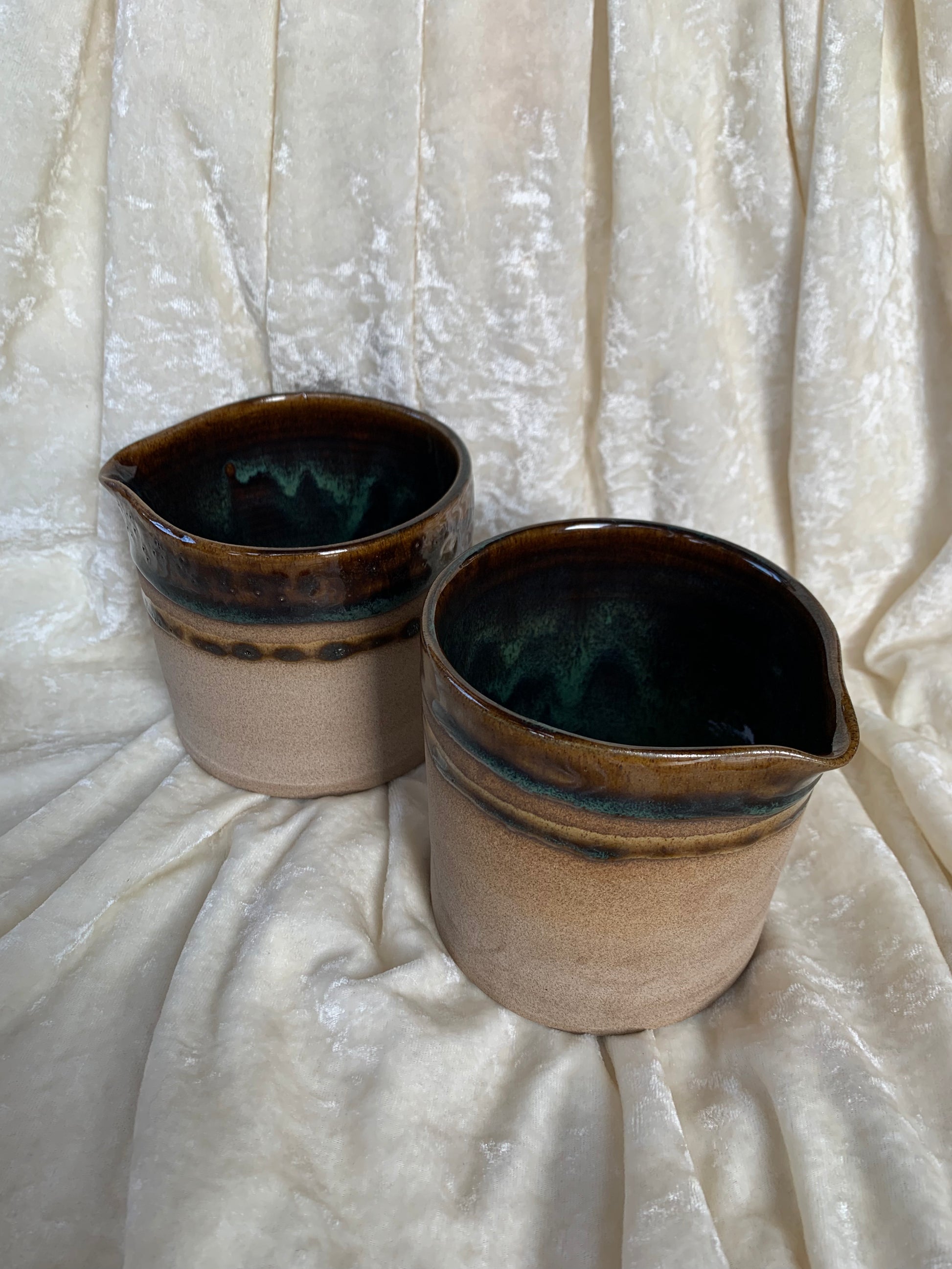 Deux magnifiques pots en grès émaillés avec bec verseur à utiliser en guise de vaisselle ou de déco (pot de fleurs par exemple), signés Isak.
