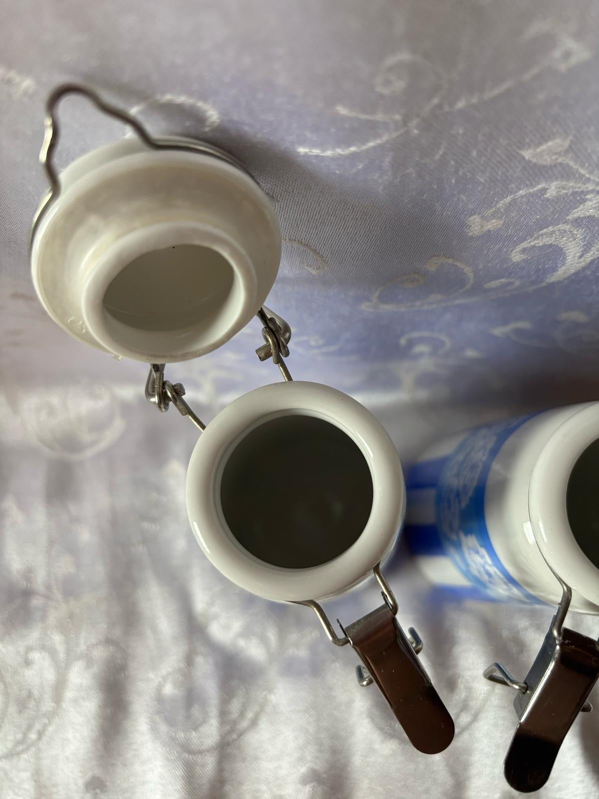 Duo salière et poivrière en céramique rayures et fleurs bleues et blanches DL