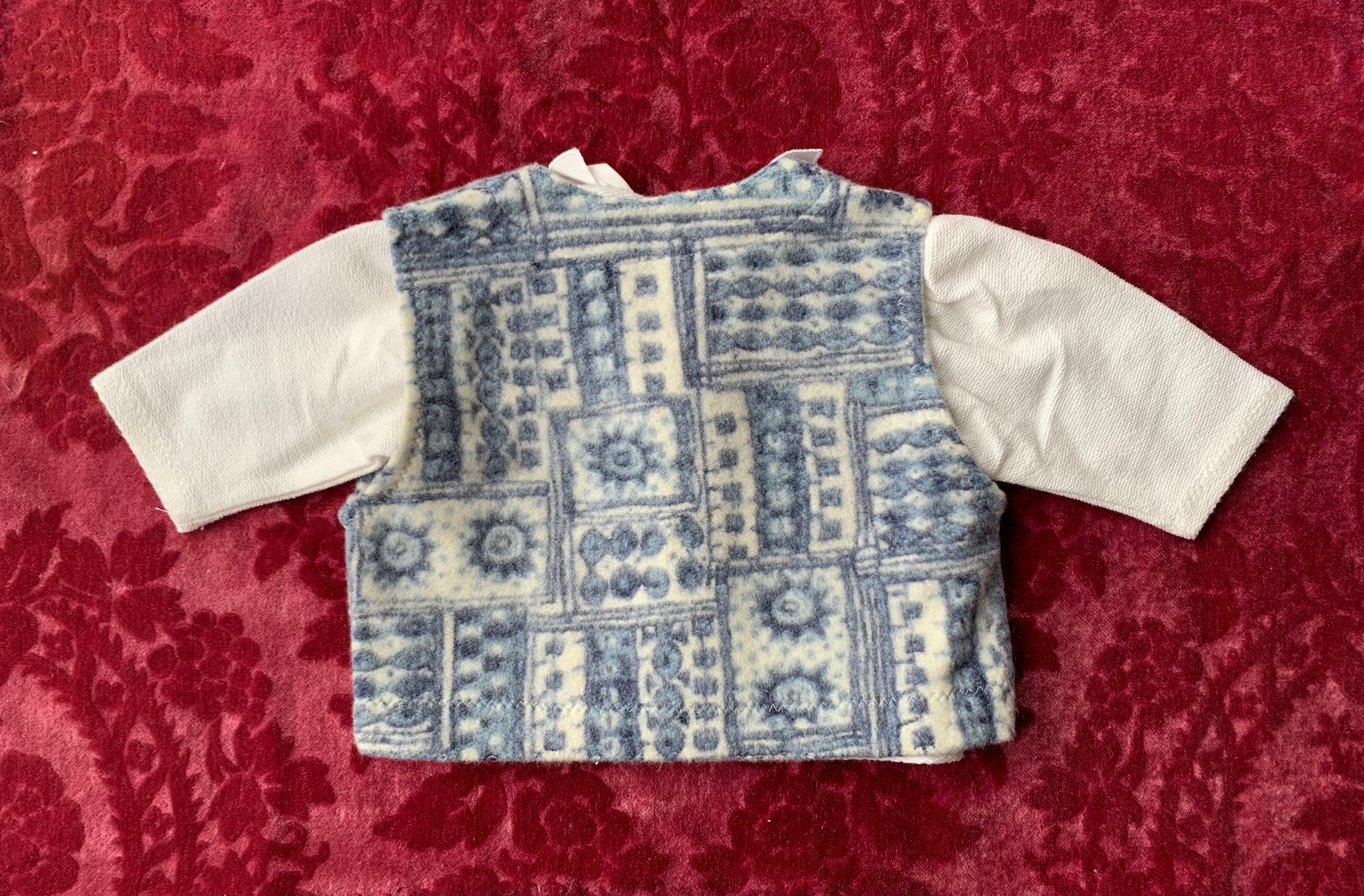 Petit ensemble haut + gilet qui nous fait fondre de mignonnerie. Les deux pièces peuvent être portées ensemble ou séparément. Ensemble de la marque 1000 câlins, 50% coton 50% acrylique, taille 1 à 3 mois.