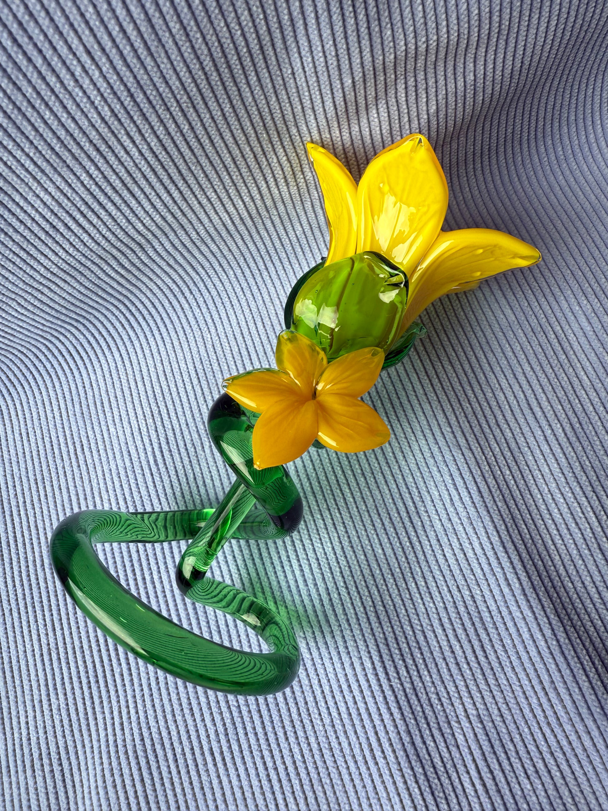 Fleur jaune en verre avec tige en spirale taille moyenne