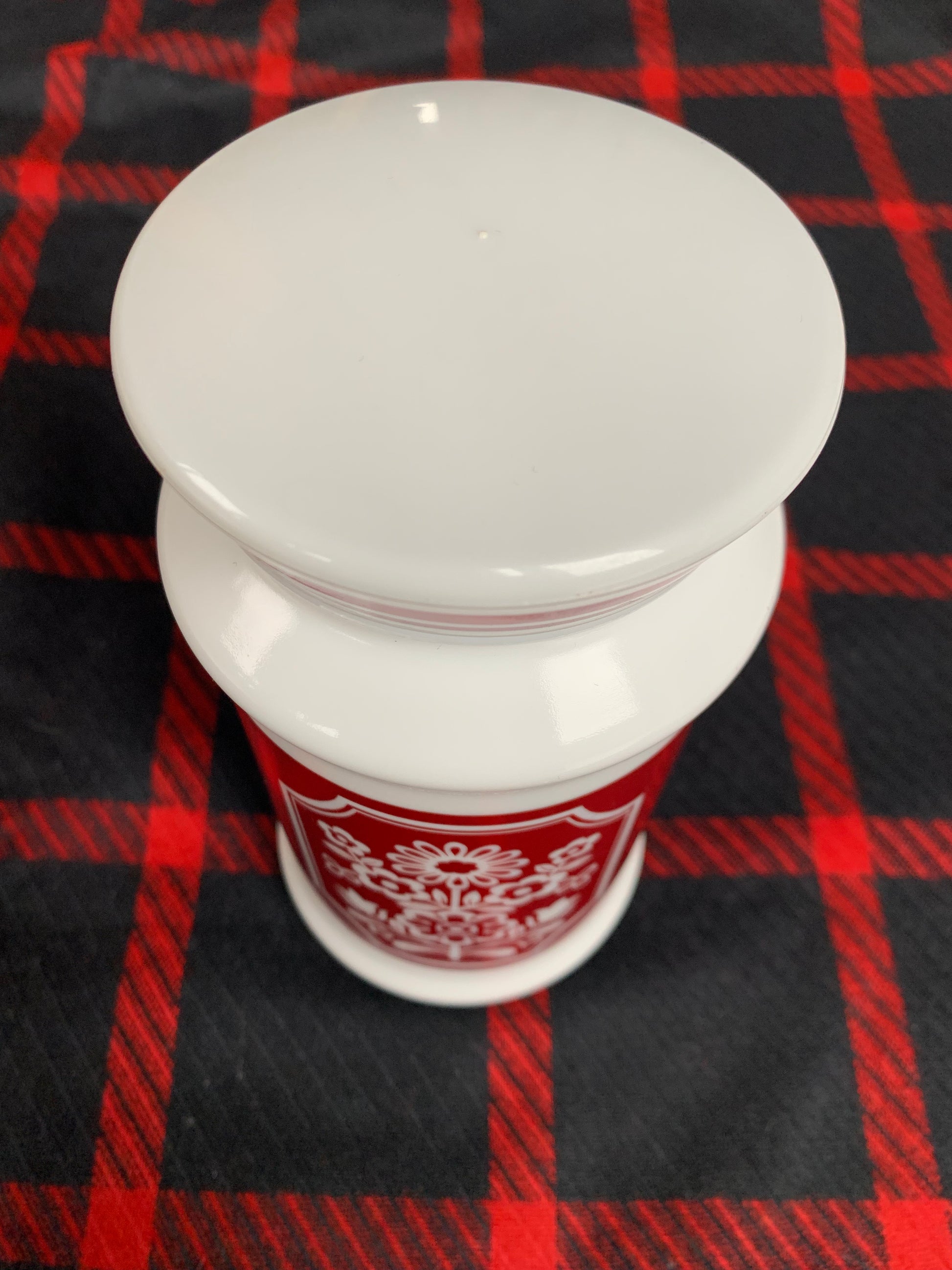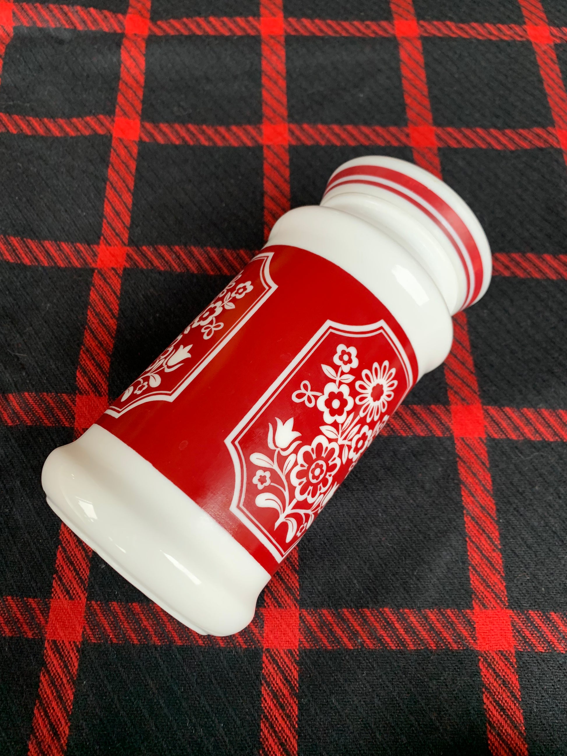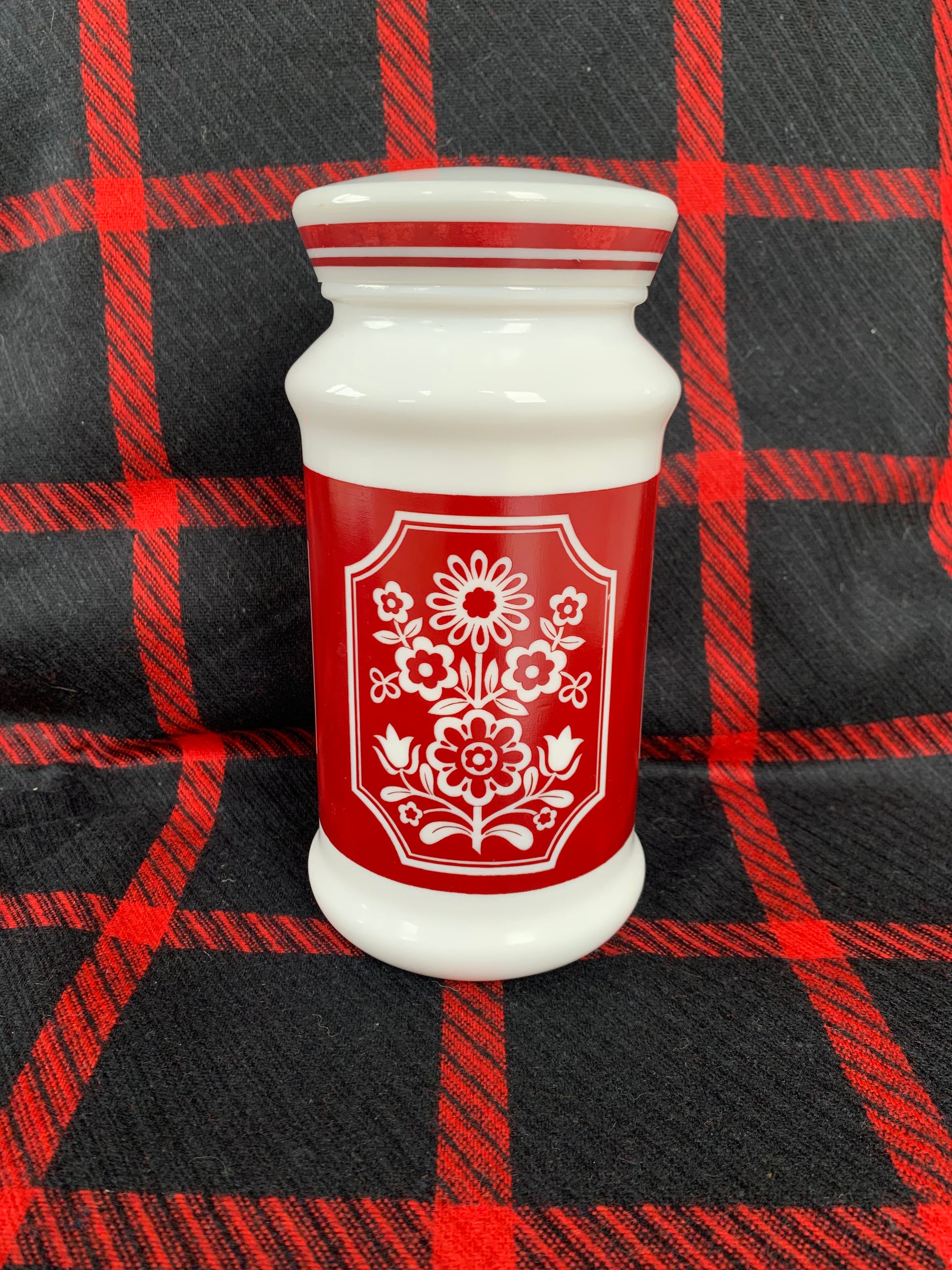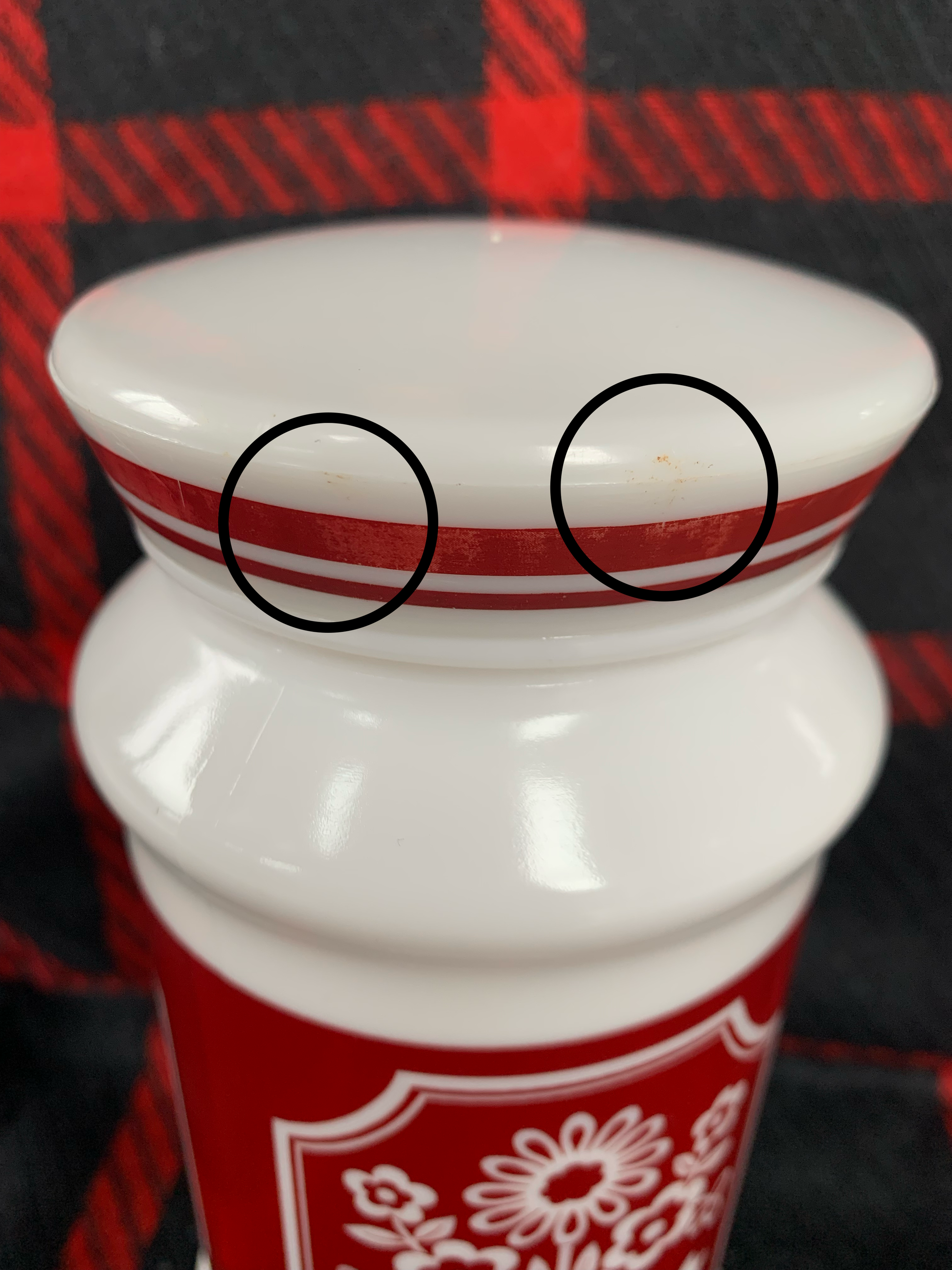 Grand bocal vintage pour ranger votre thé, votre café, vos épices, vos cotons... Les utilisations sont vastes ! Le bocal est en verre opale et le couvercle est en plastique, il ferme très bien. Le bocal est en quasi parfait état, mise à part de léger points bleus au fond à un endroit (photo), de la peinture rouge qui est partie sur un tout petit endroit à l'extérieur du bocal (photo), & de légères traces brunes sur le couvercle (photo).