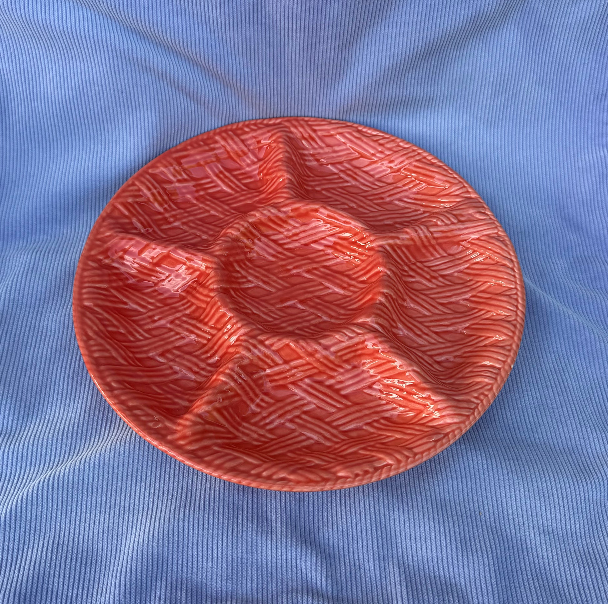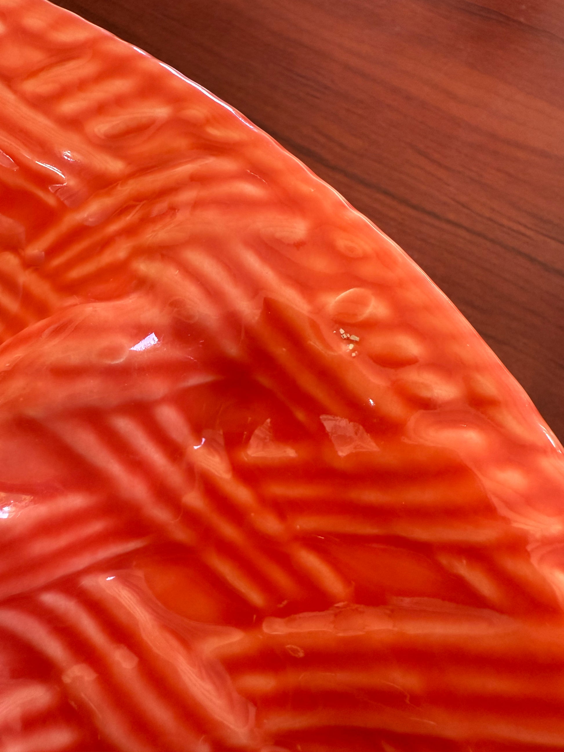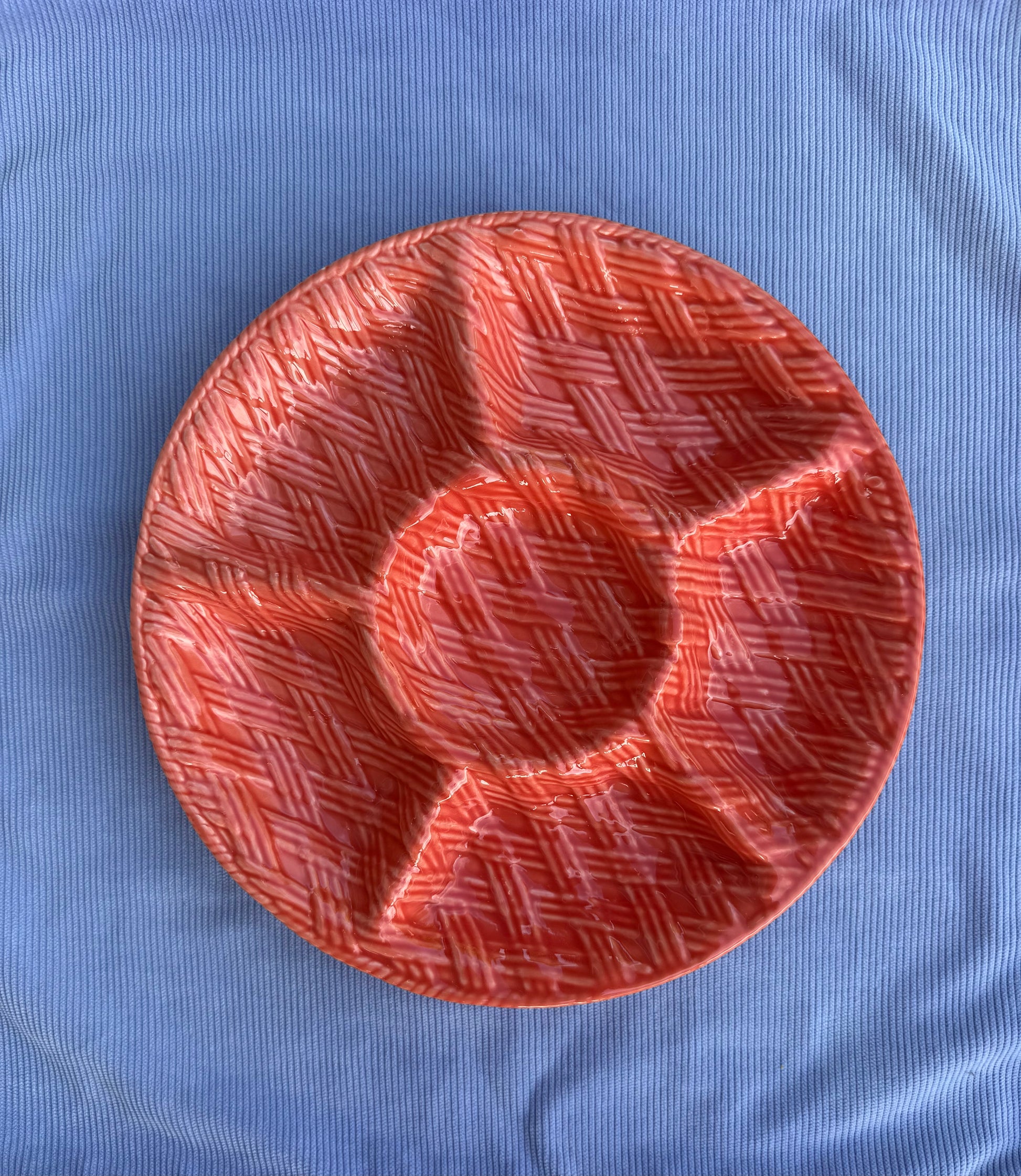 Plat idéal pour partager un grand apéro entre amis ou en famille, imitation corbeille, couleur orange/rose/rouge corail. Il est en parfait état à l'avant (malgré un léger défaut de fabrication sur un très petit endroit), et il a une petite ébréchure à l'arrière dans le cercle où il y a le nom de la marque. Les deux éléments sont visibles sur les photos.