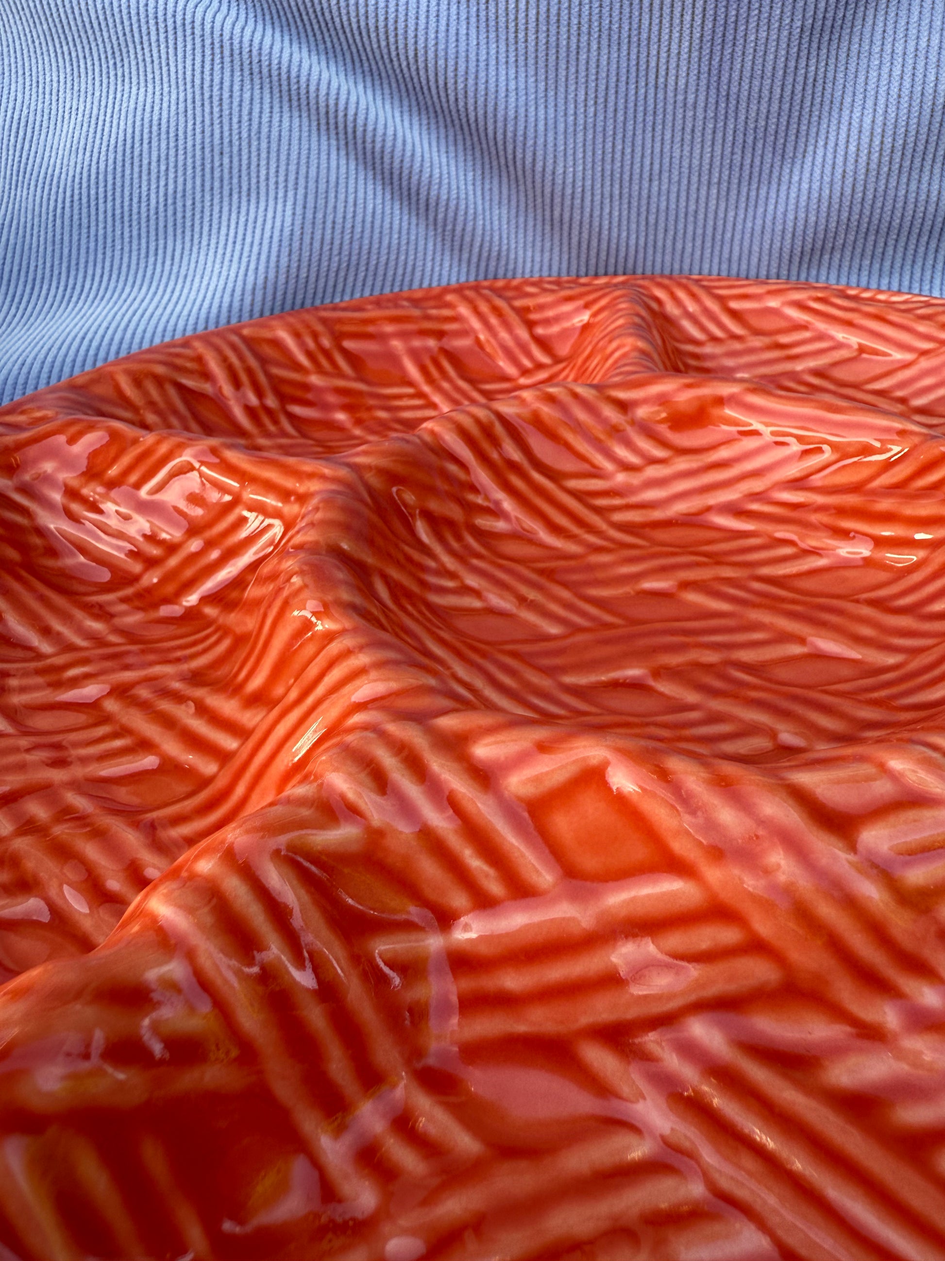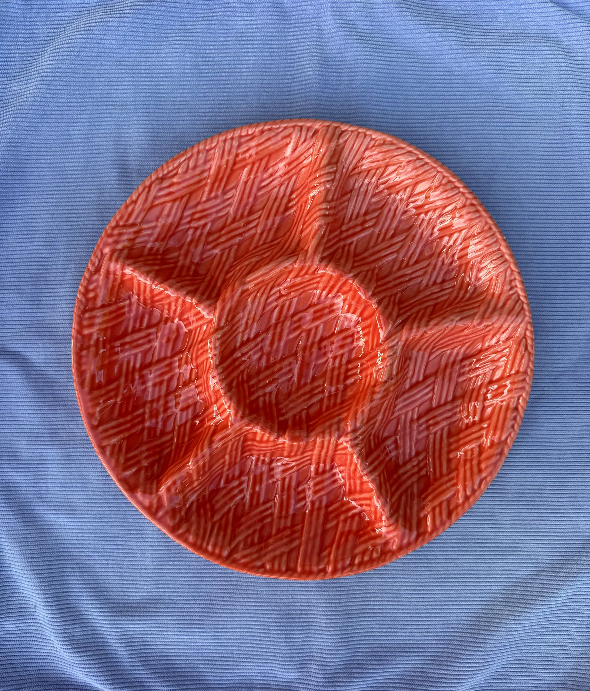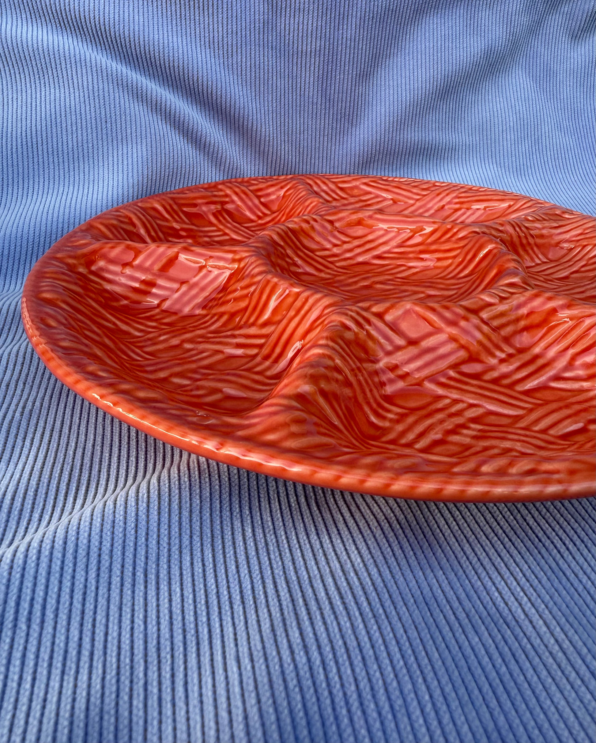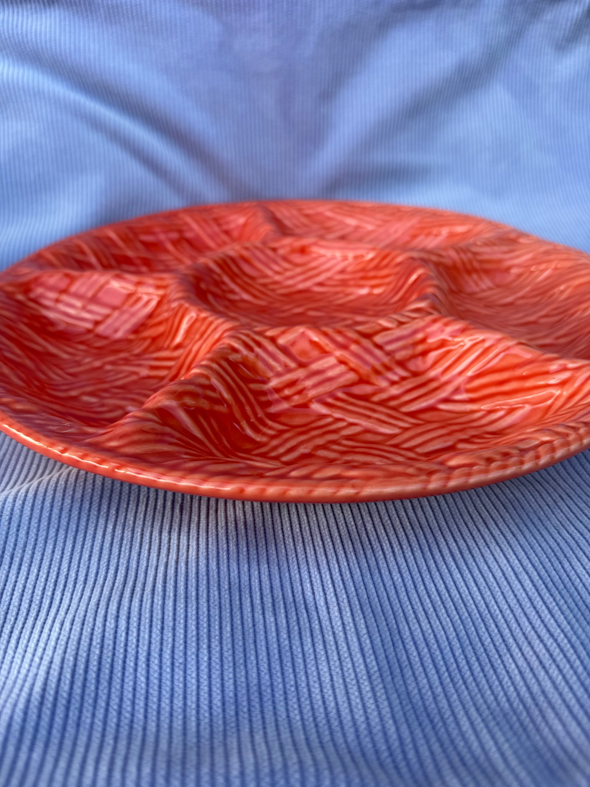 Plat idéal pour partager un grand apéro entre amis ou en famille, imitation corbeille, couleur orange/rose/rouge corail. Il est en parfait état à l'avant (malgré un léger défaut de fabrication sur un très petit endroit), et il a une petite ébréchure à l'arrière dans le cercle où il y a le nom de la marque. Les deux éléments sont visibles sur les photos.