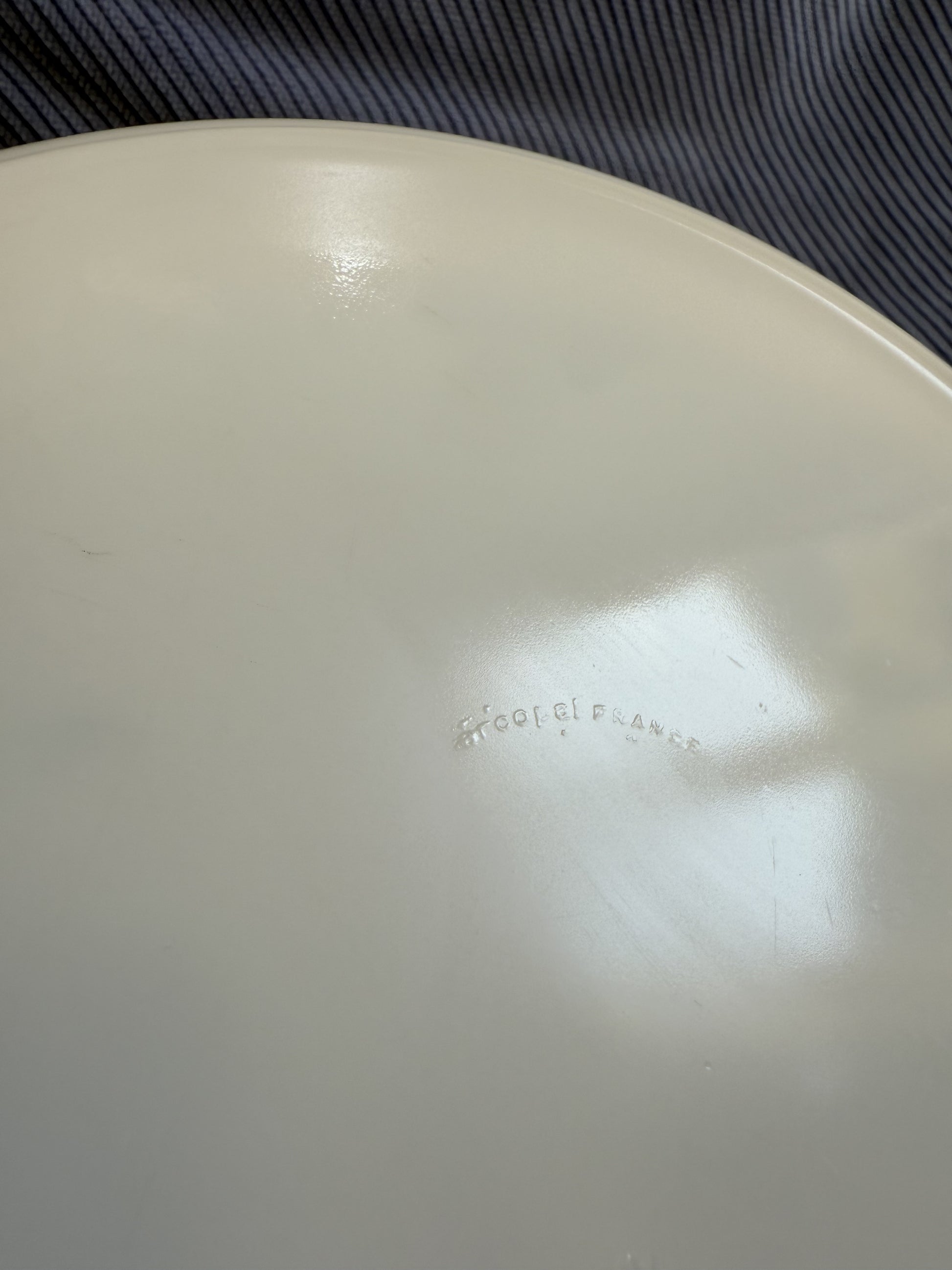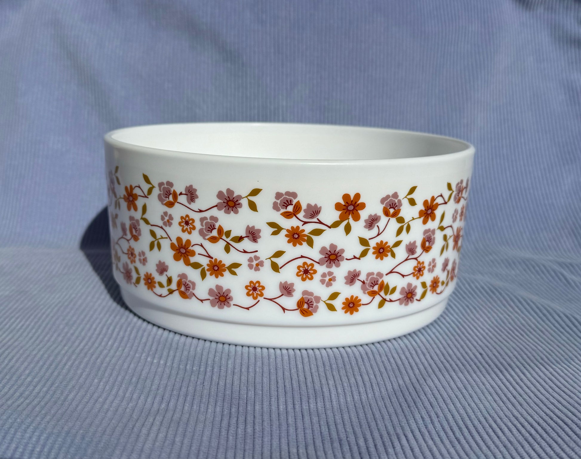 Saladier fleuri des années 70, de la marque Arcopal France en verre opale. Il est en super état, tout dépend la lumière on peut apercevoir de légers jaunissements au fond sur les côtés dus à l'ancienneté du saladier.