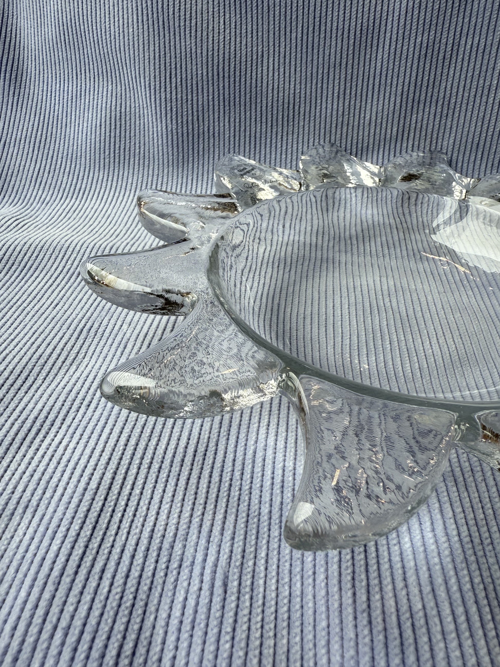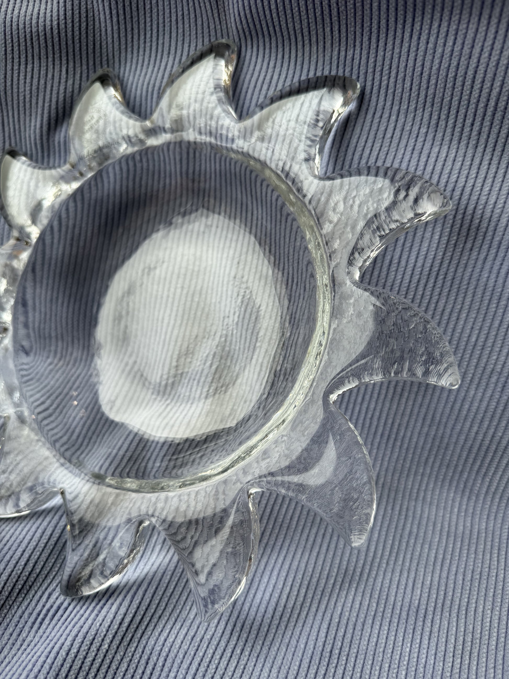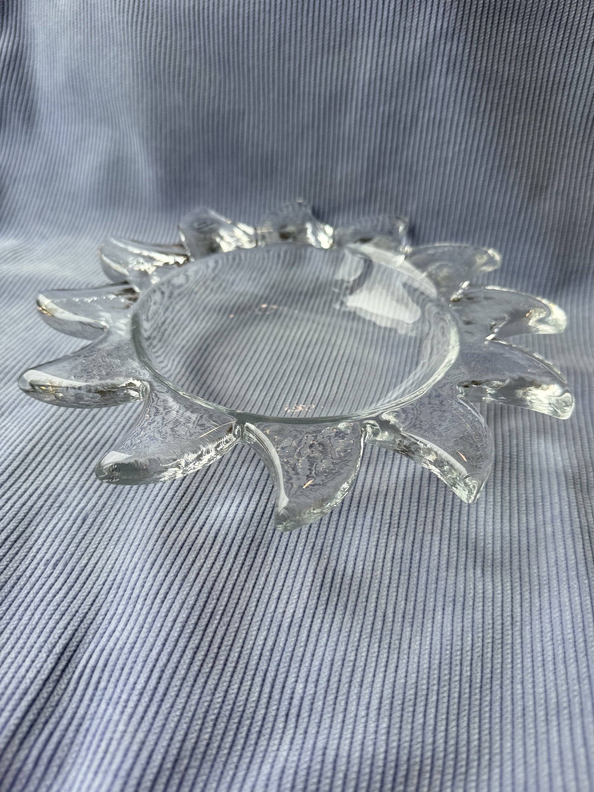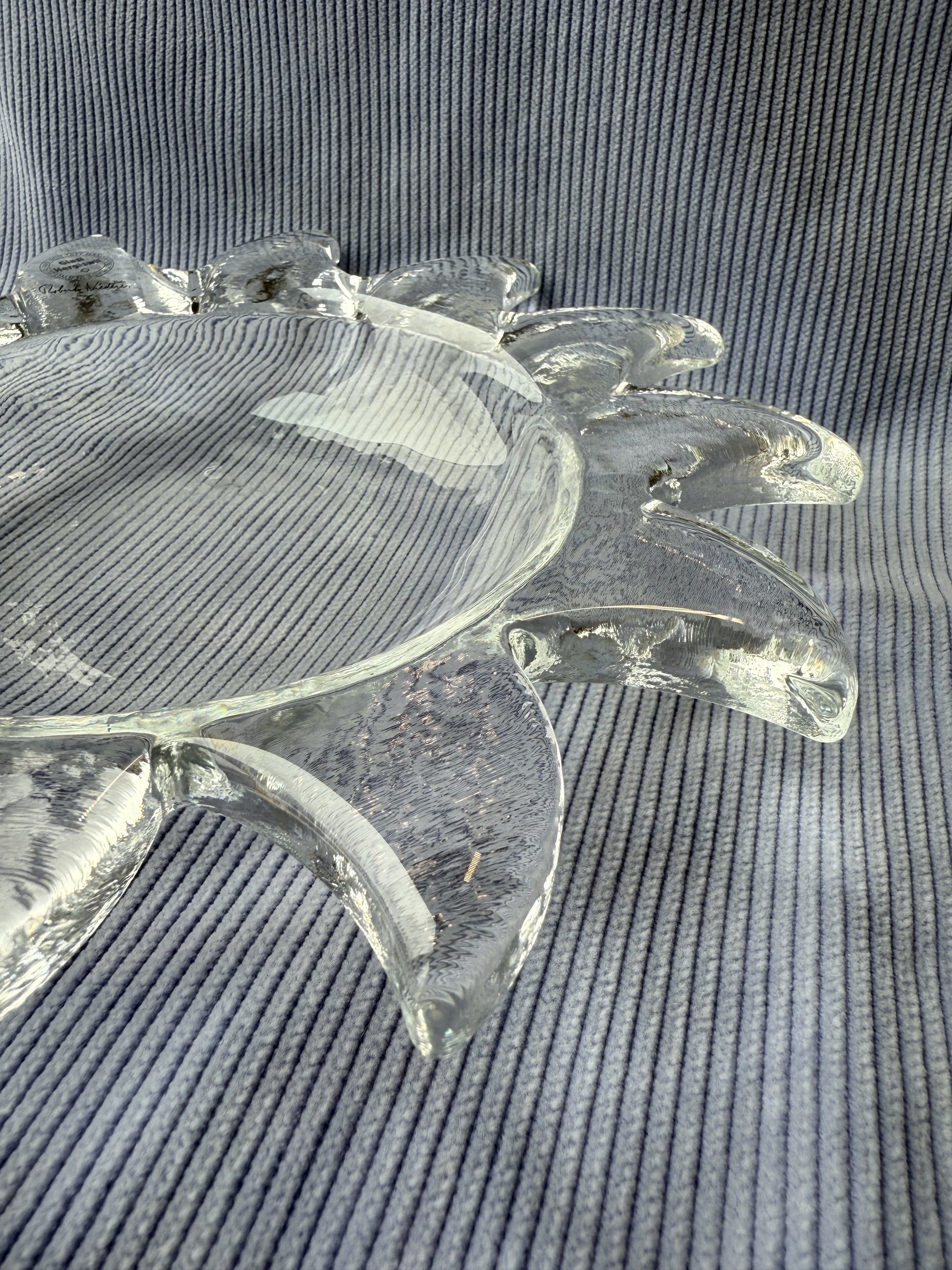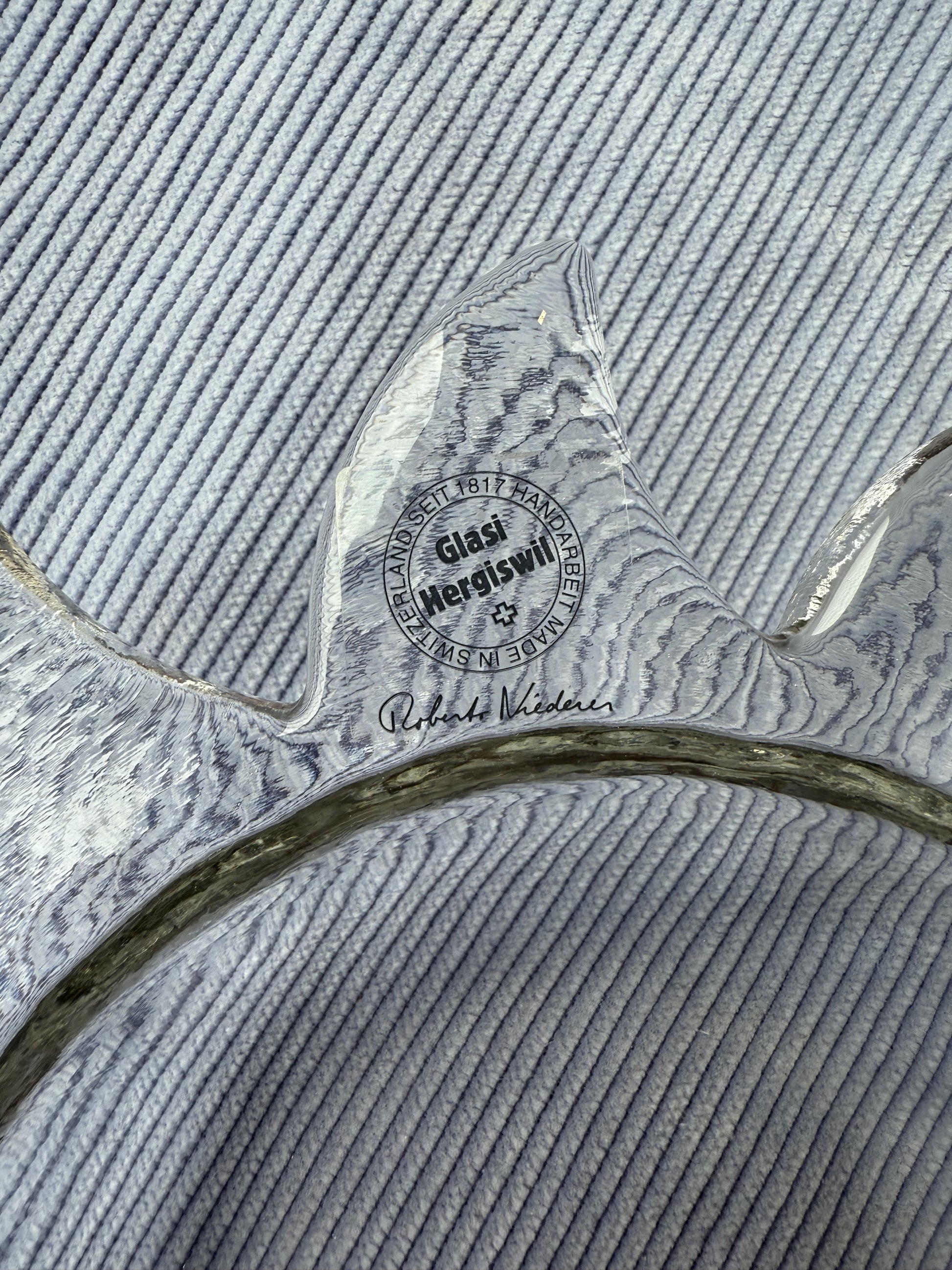 Magnifique coupelle / assiette / plat très originale et de très bonne qualité. Elle est en verre transparent épais. Fabriquée en Suisse, Glasi Hergiswil Robert Niederer.