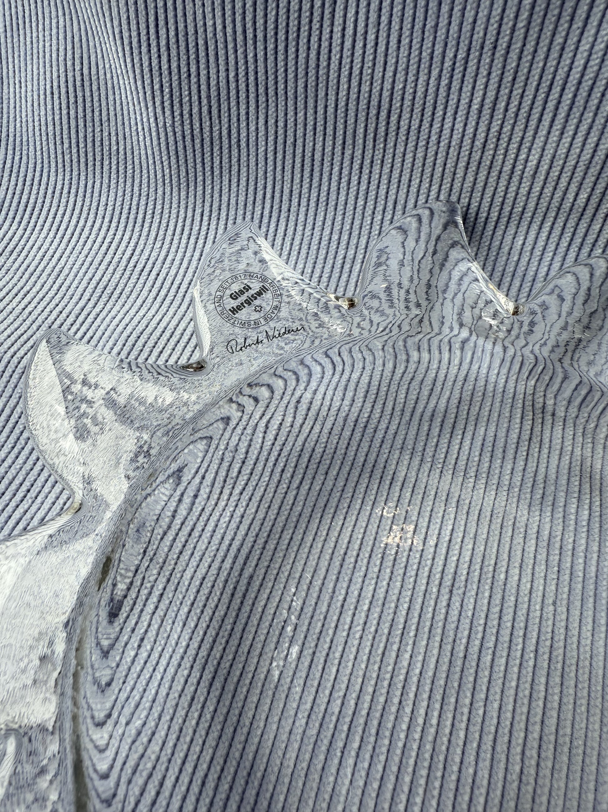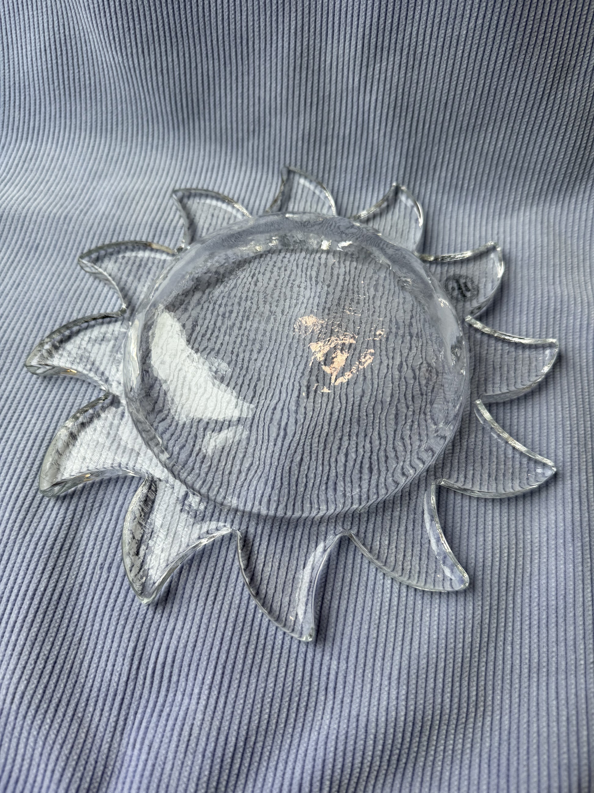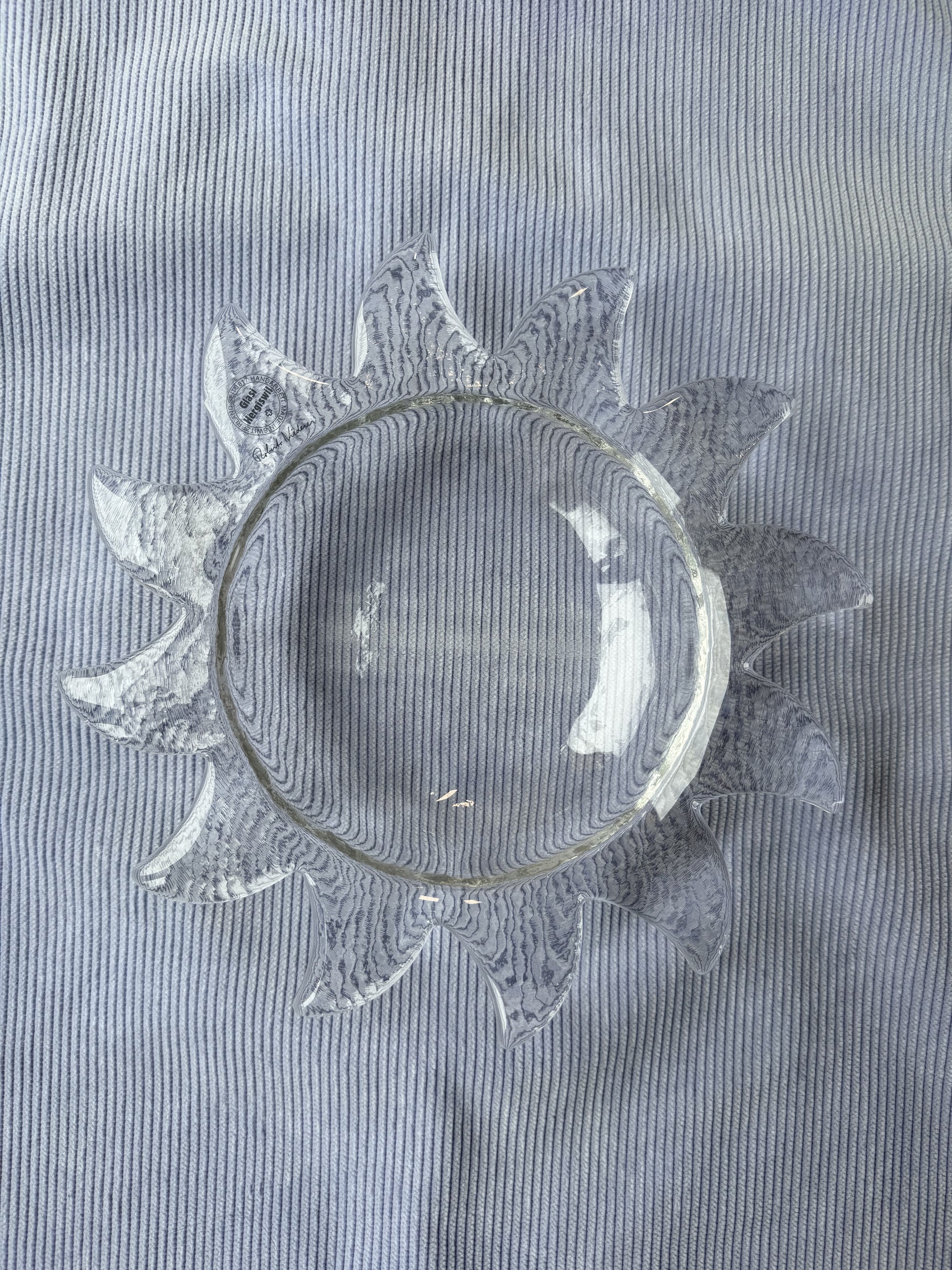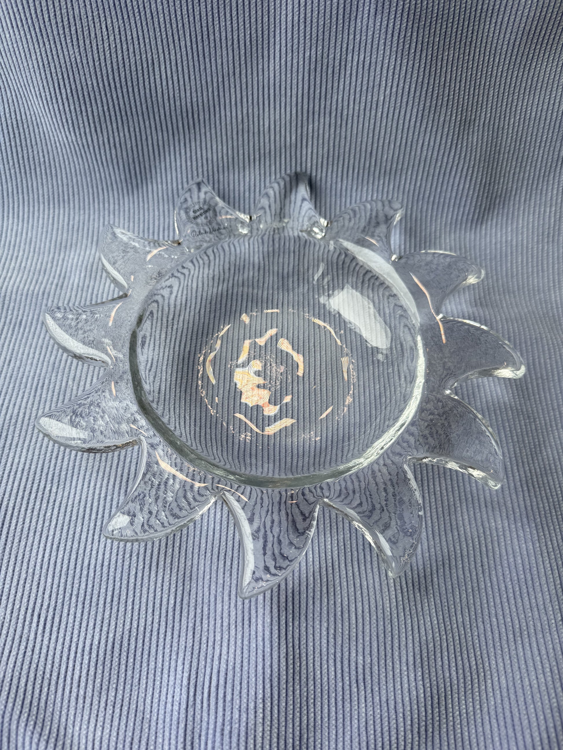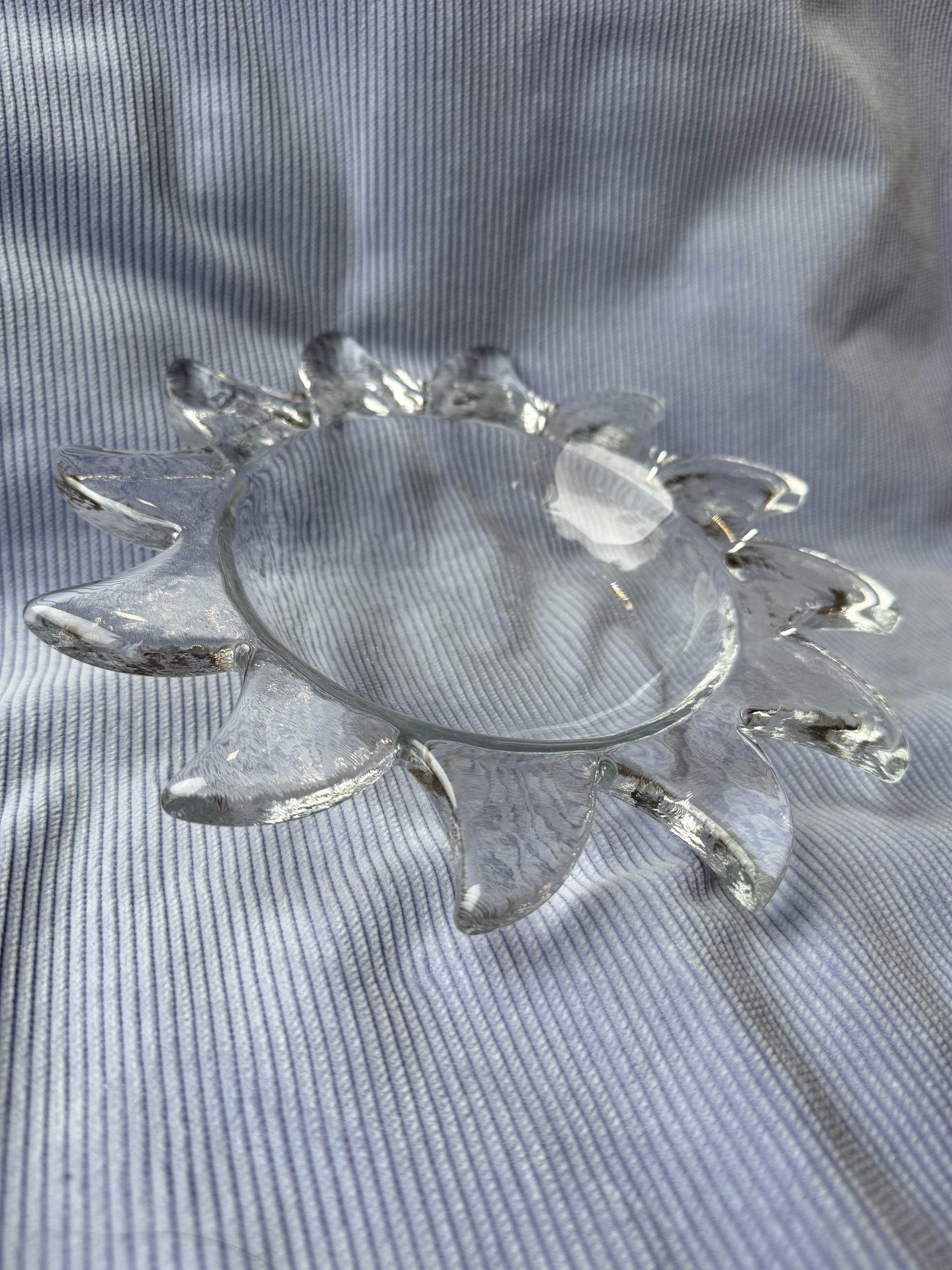 Magnifique coupelle / assiette / plat très originale et de très bonne qualité. Elle est en verre transparent épais. Fabriquée en Suisse, Glasi Hergiswil Robert Niederer.