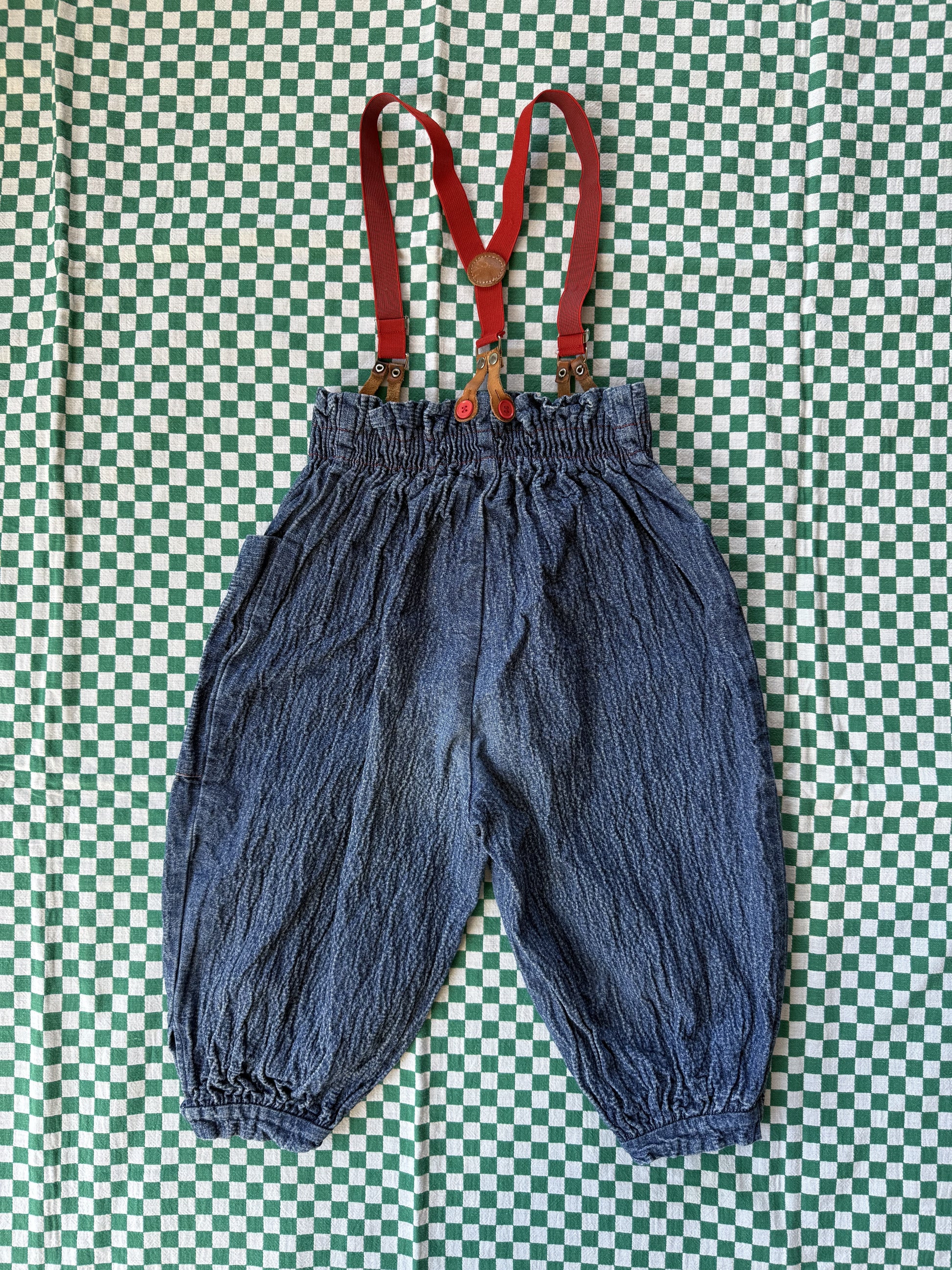 Super jean bouffant avec ses bretelles rouges de la marque française Petit Diable. 100% coton, fabriqué en France. Il y a un élastique au niveau de la taille.