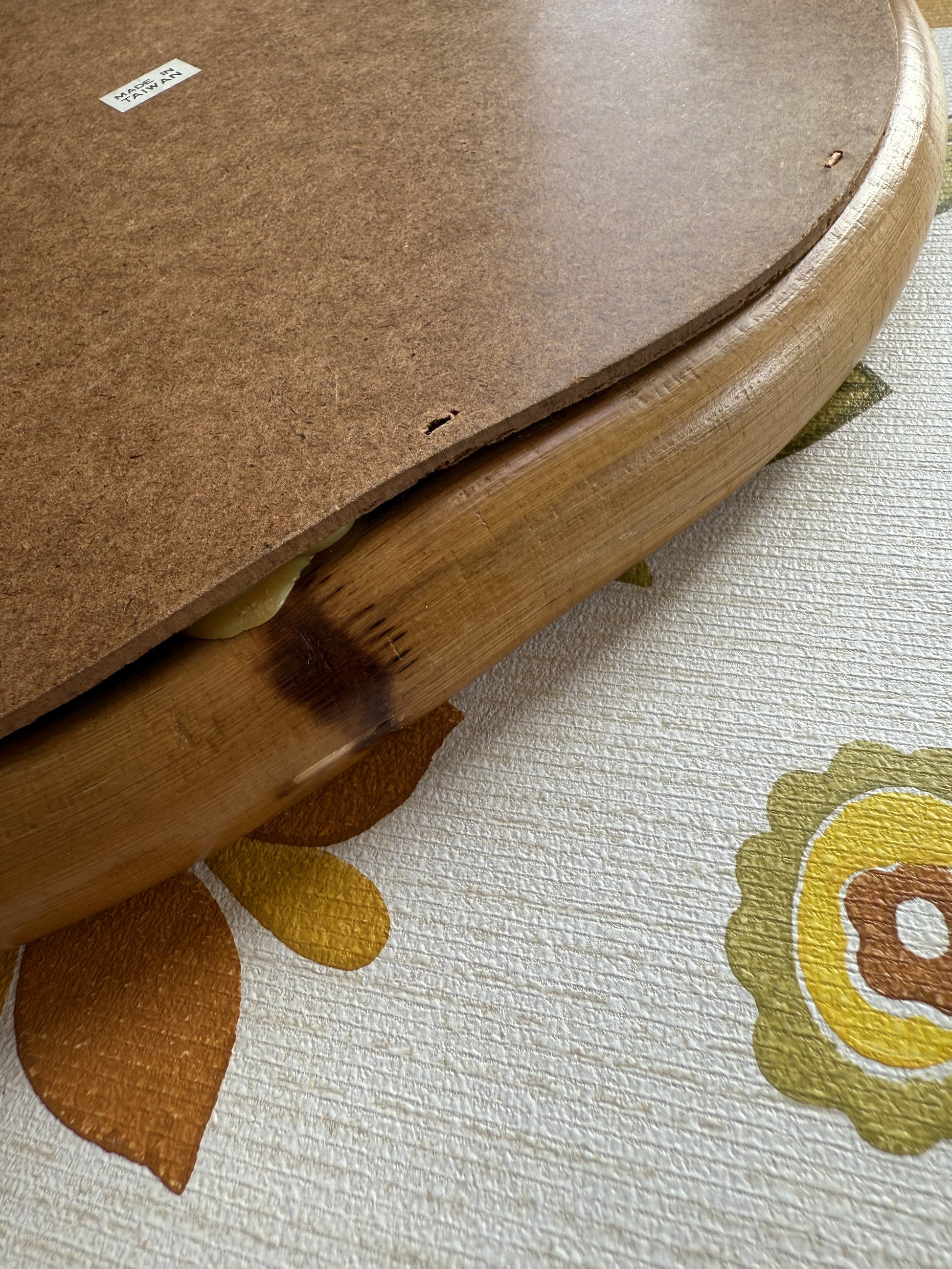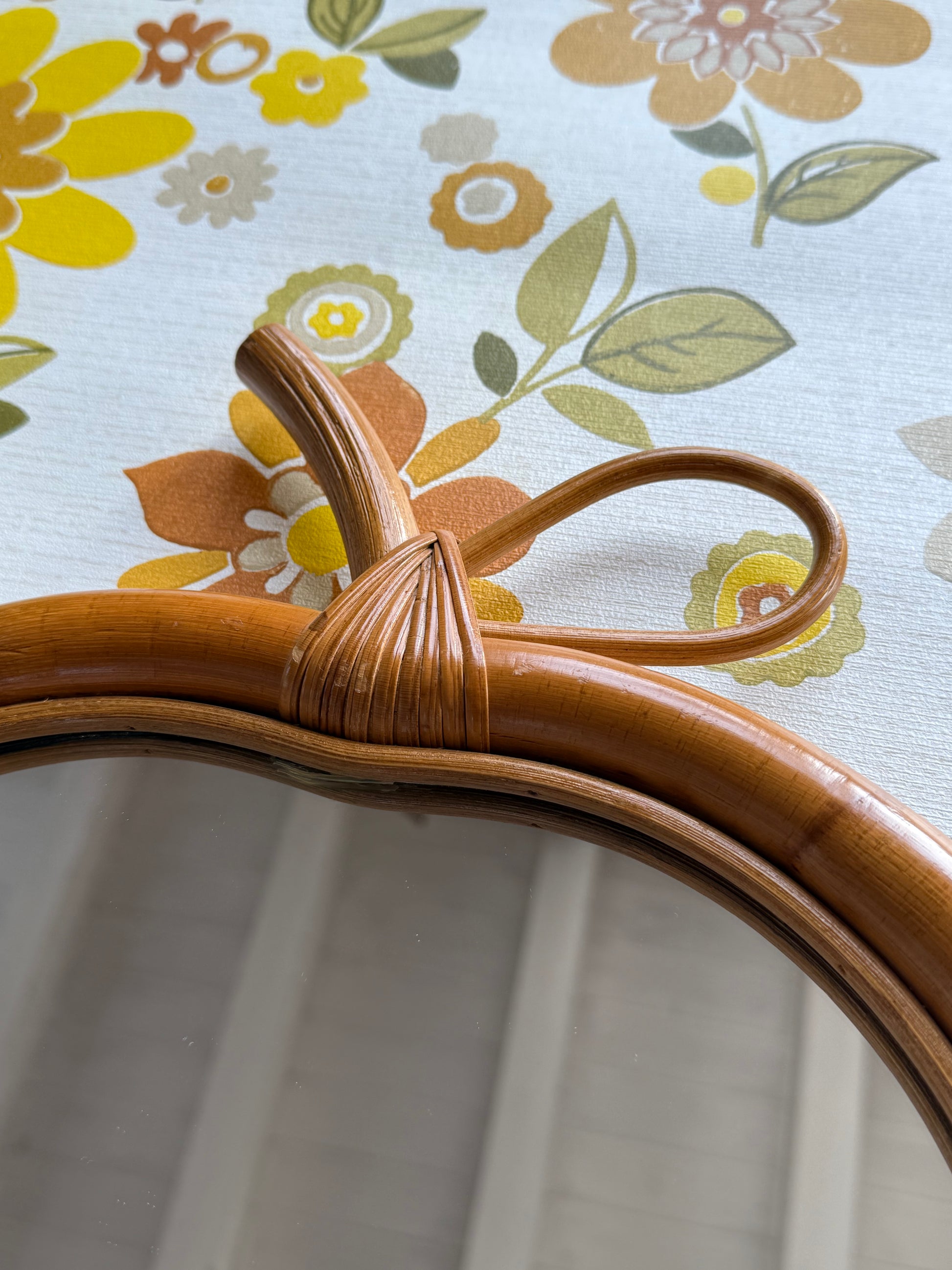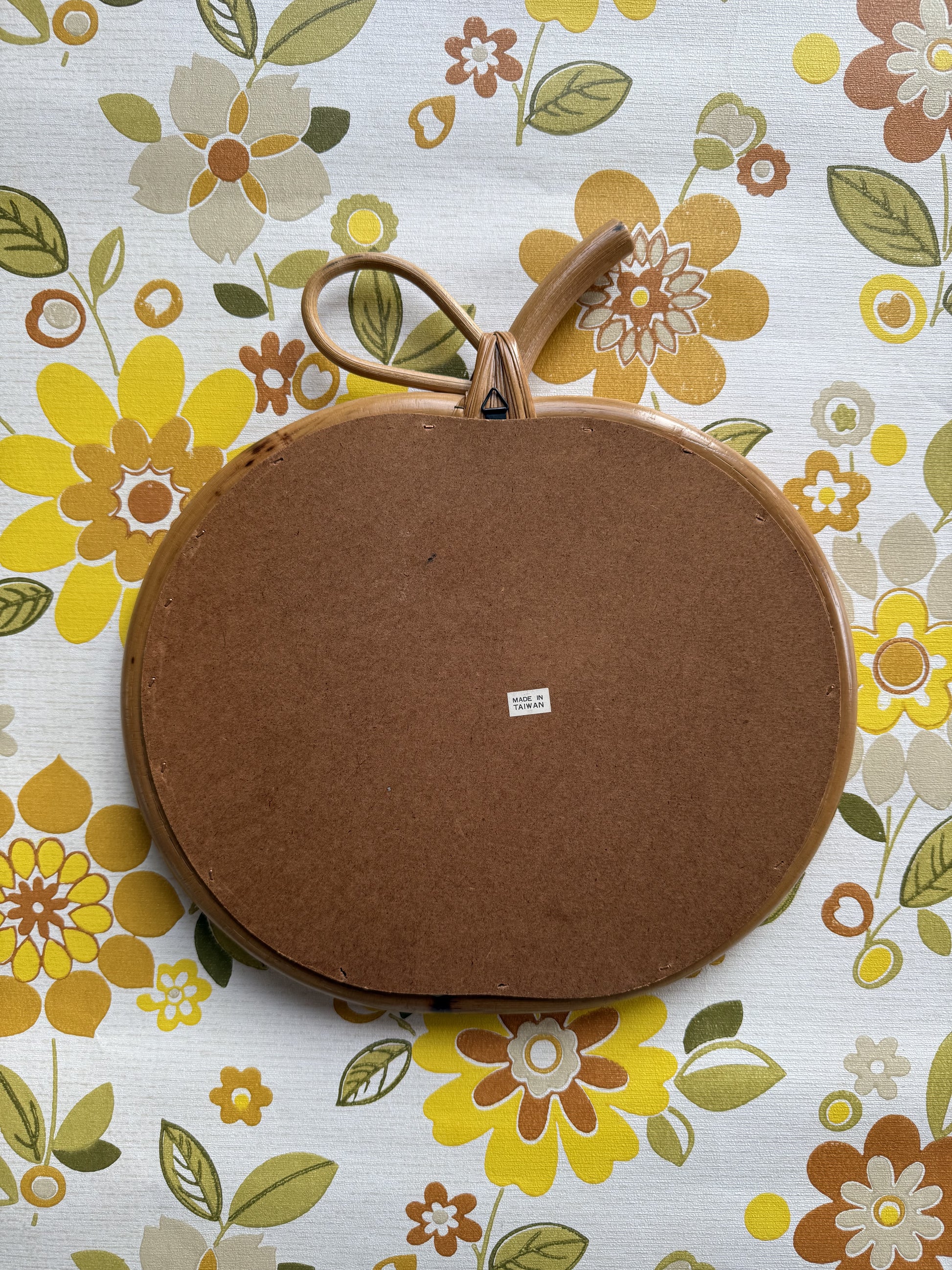 Magnifique miroir en rotin en forme de pomme. La vitre est en parfait état et le rotin aussi. Il y a juste deux agrafes derrières qui se sont enlevées donc les anciens propriétaires ont mis un point de cil pour consolider le tout.