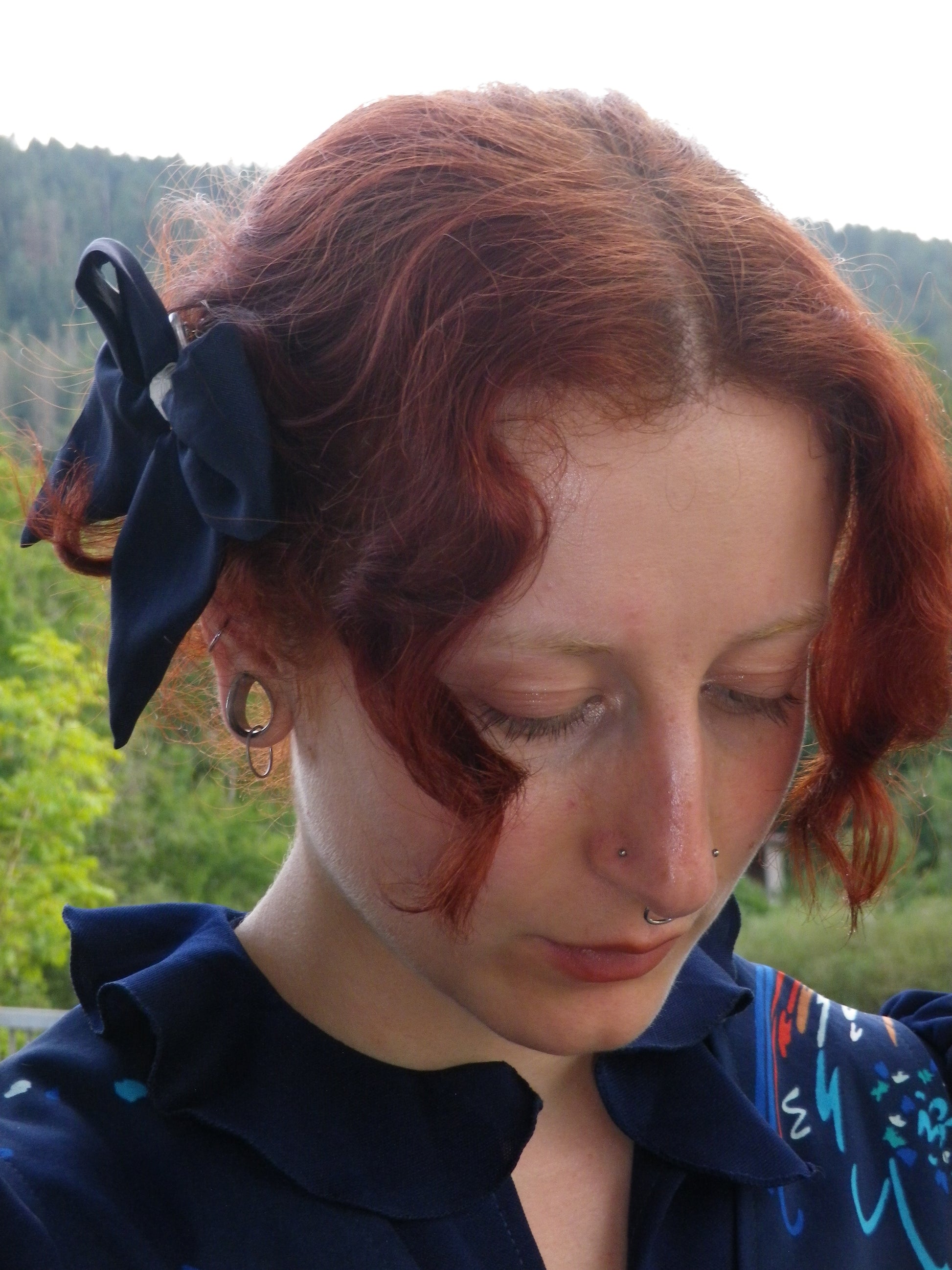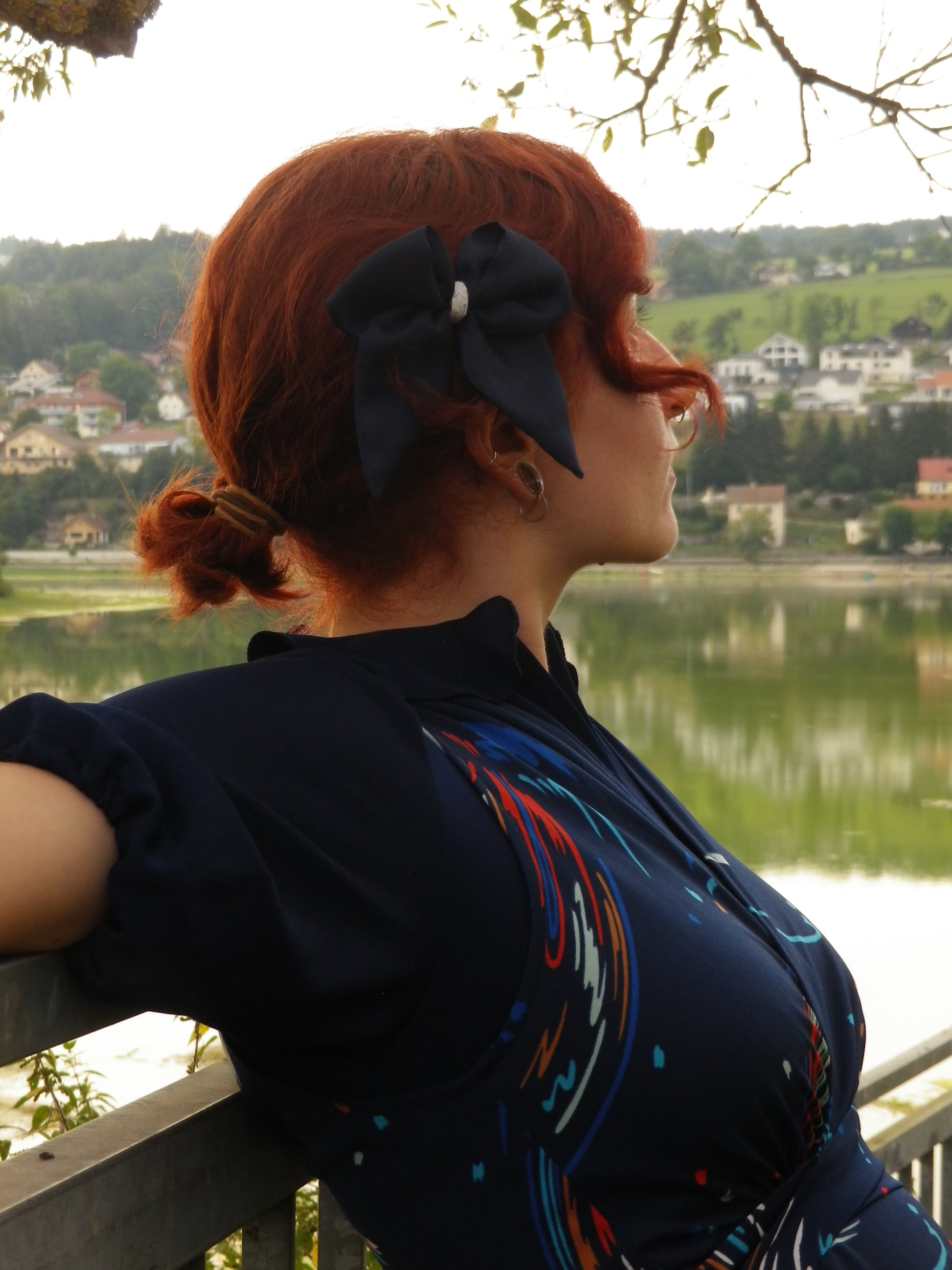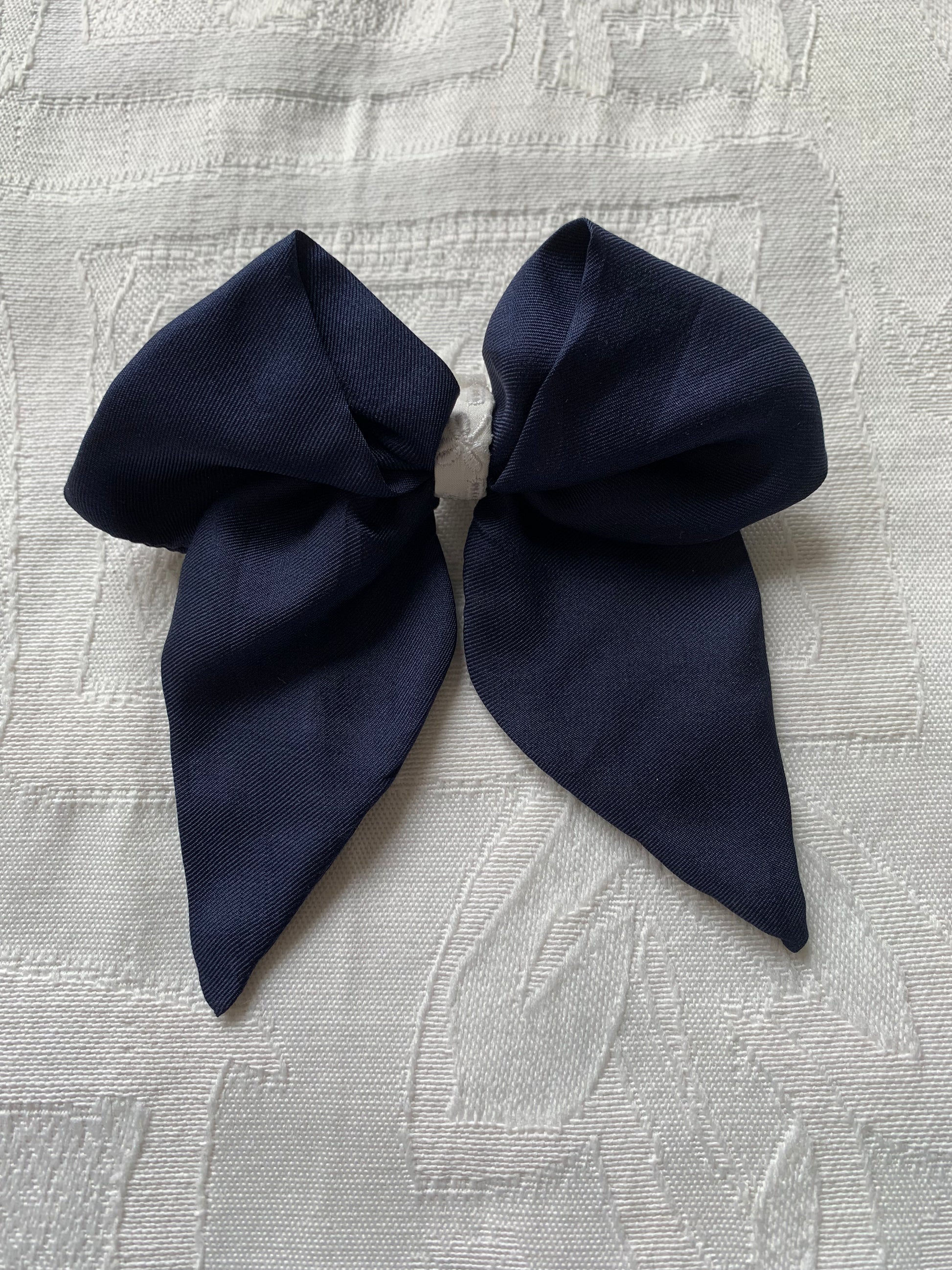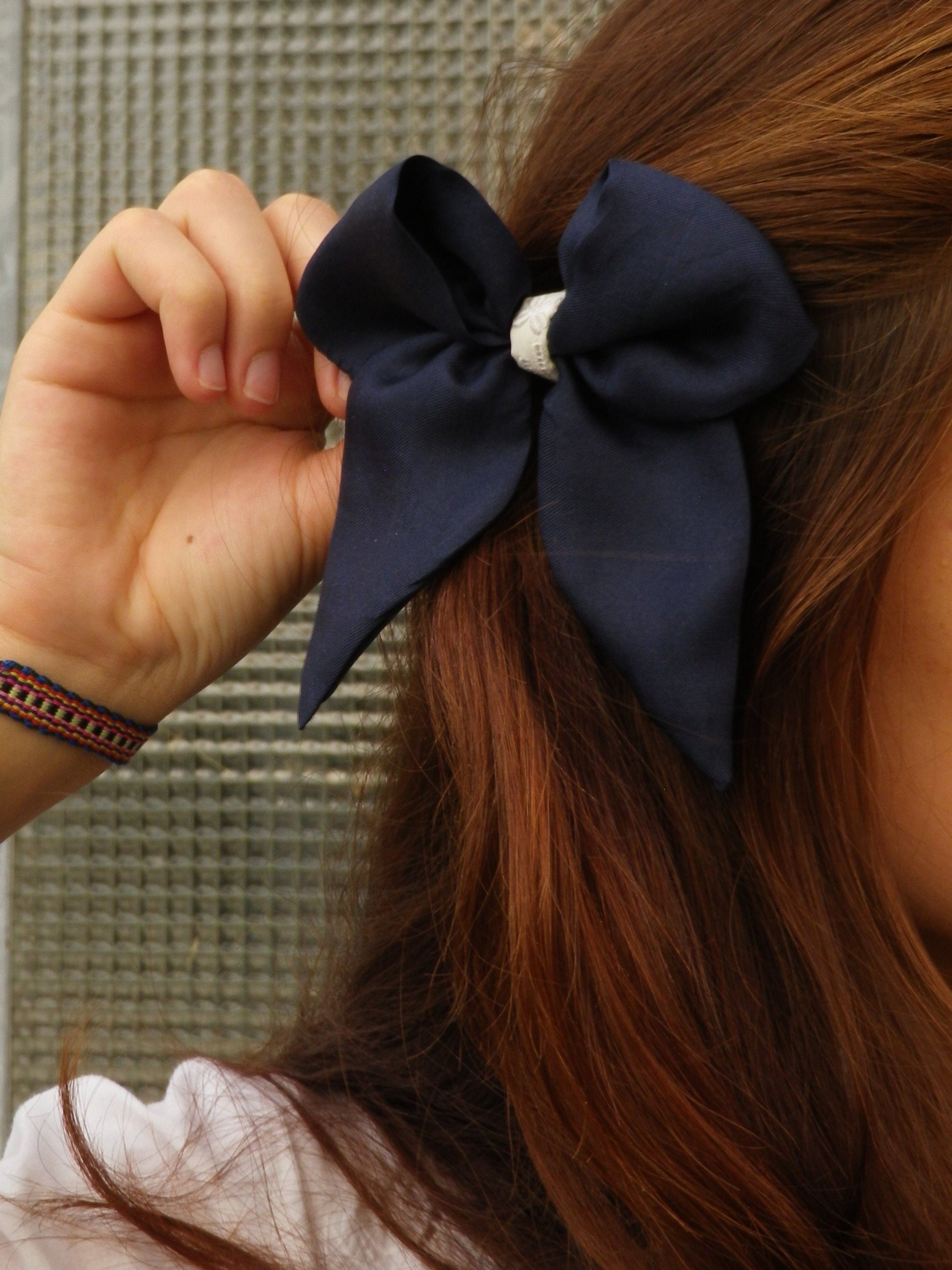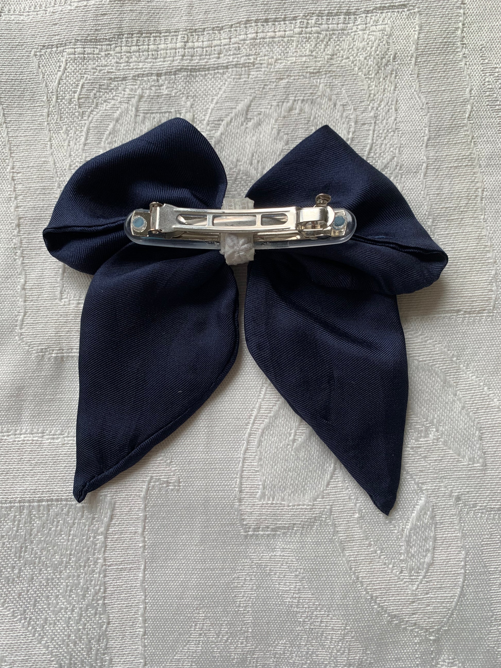 Joli noeud de cheveux bleu avec un ruban blanc cousu par nos soins à partir de tissus de seconde main :) La barrette clip qui tient le noeud mesure 6,5 cm, elle est solide.