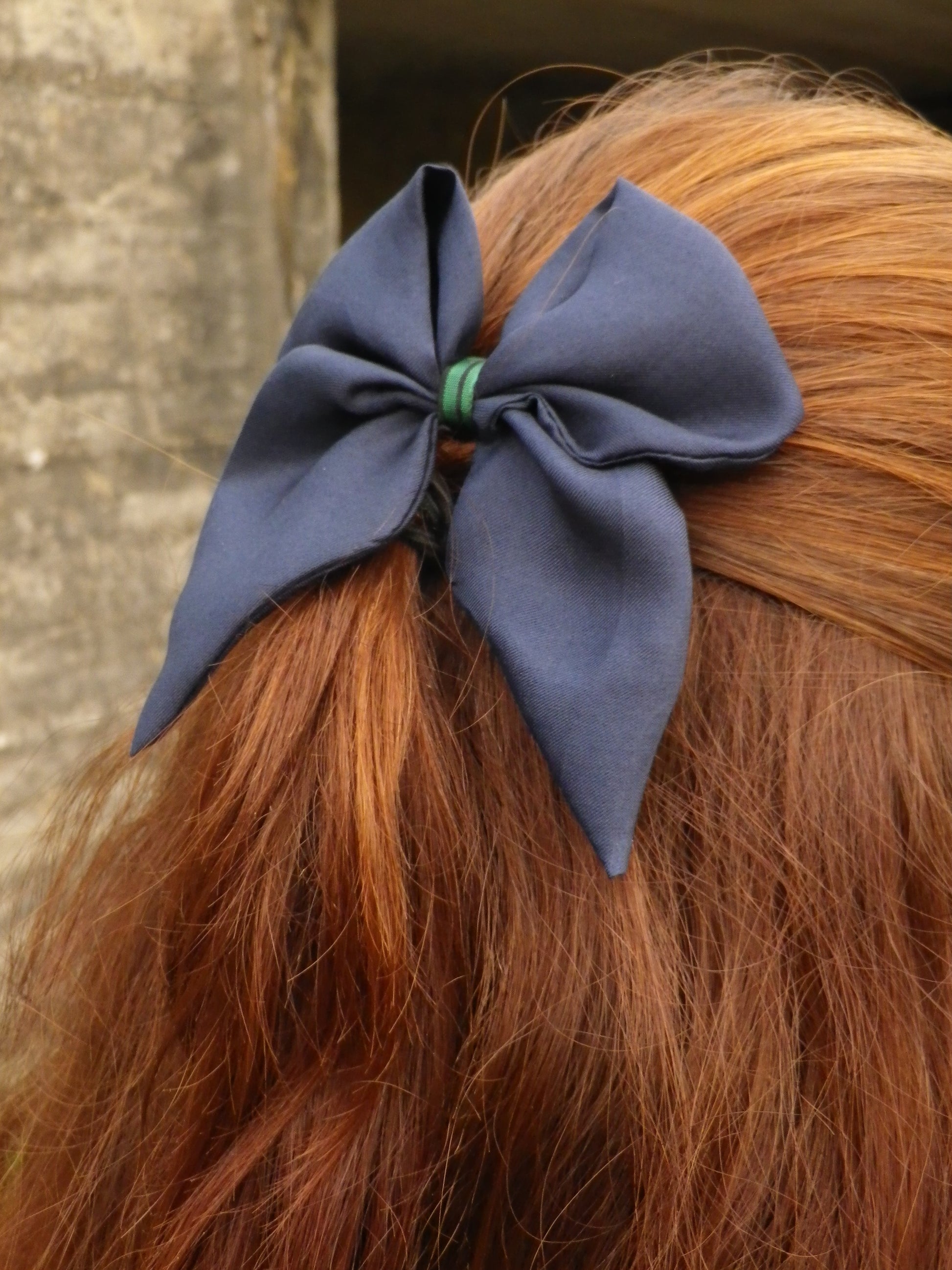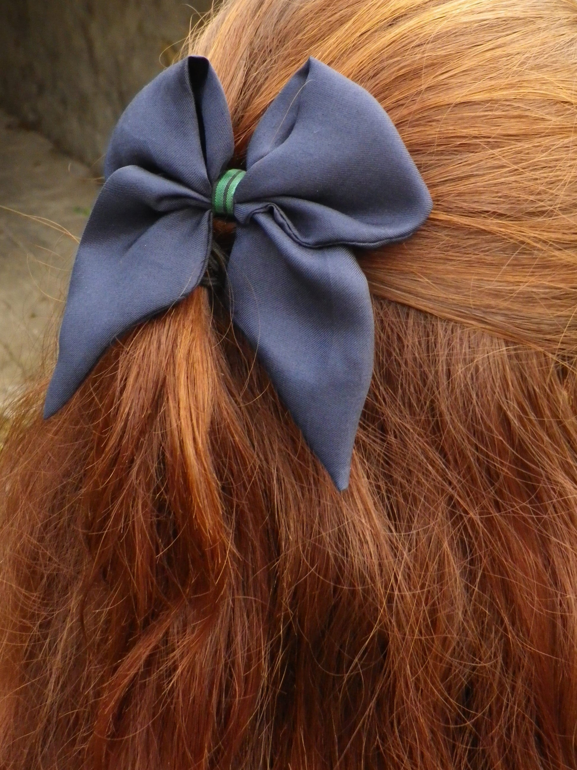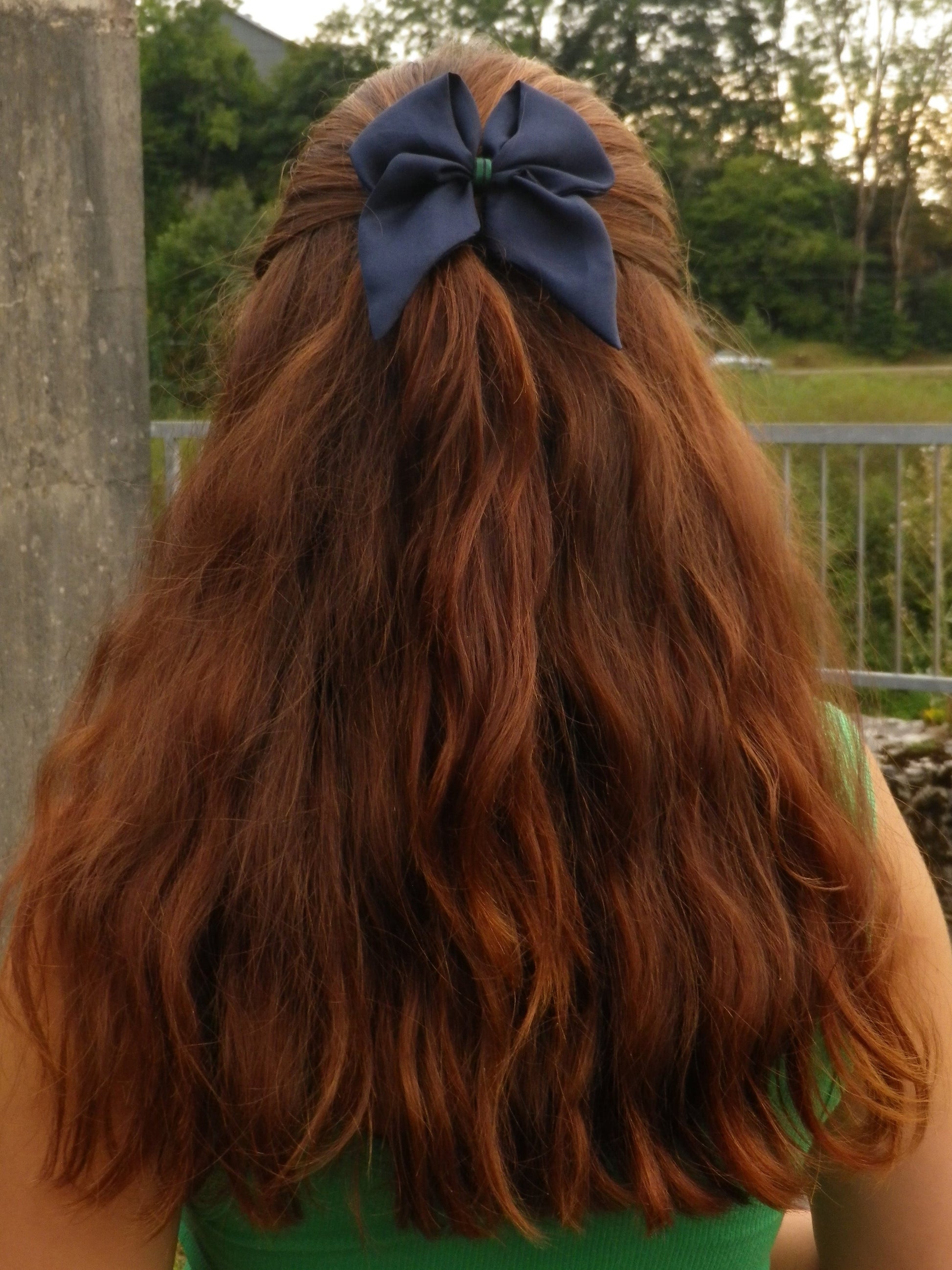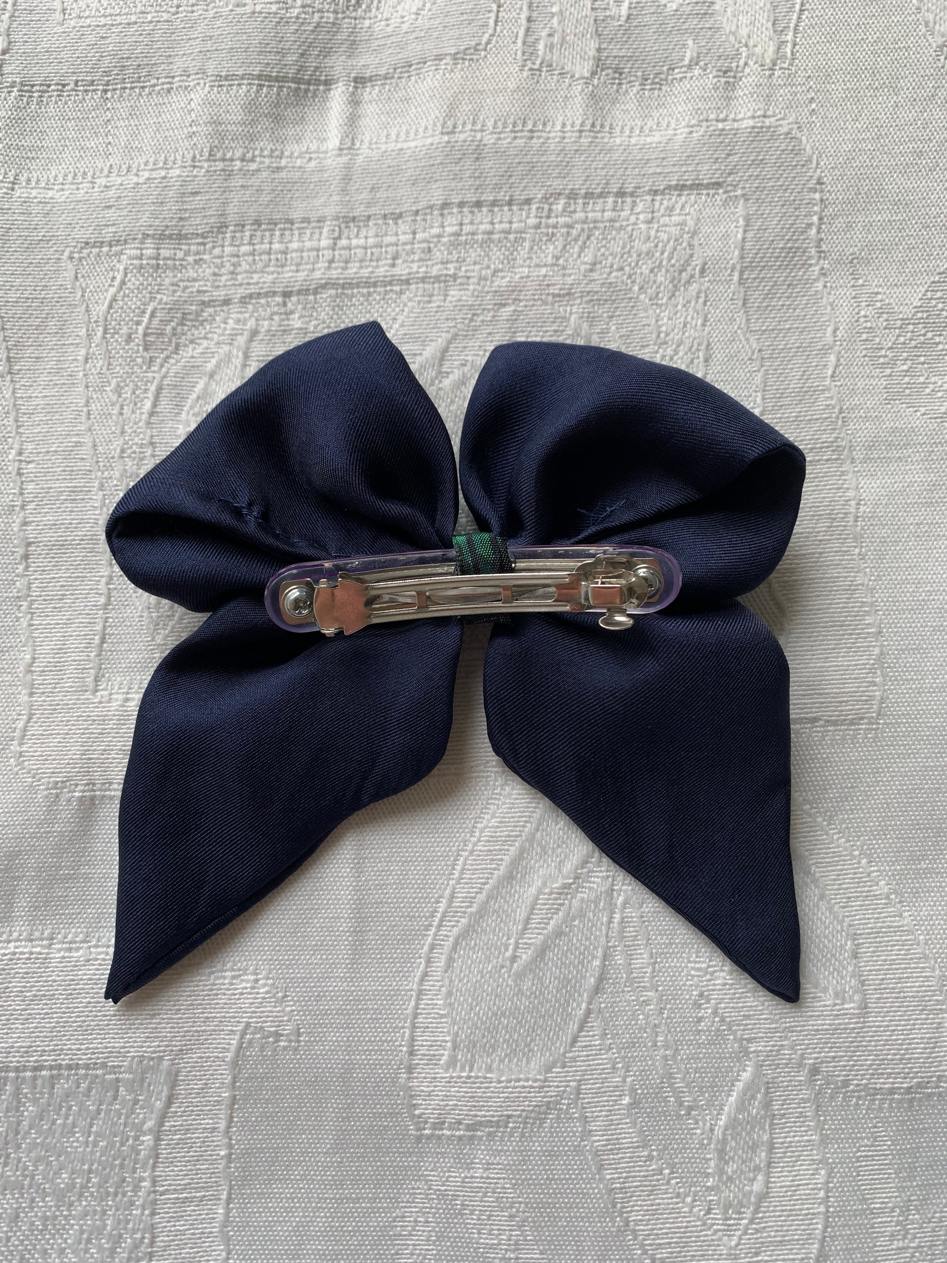 Joli noeud de cheveux bleu avec un ruban vert à carreaux cousu par nos soins à partir de tissus de seconde main :) La barrette clip qui tient le noeud mesure 6,5 cm, elle est solide.