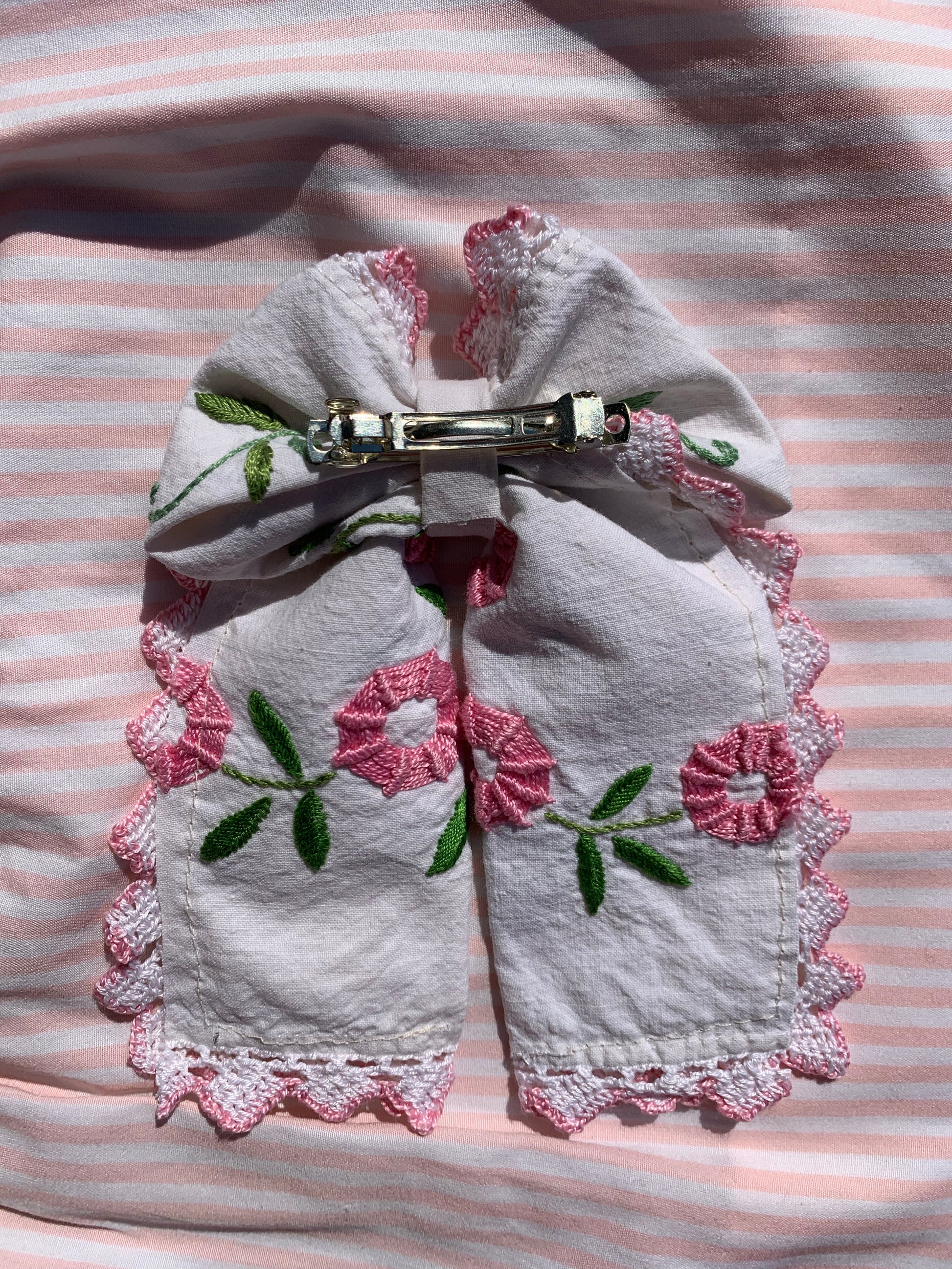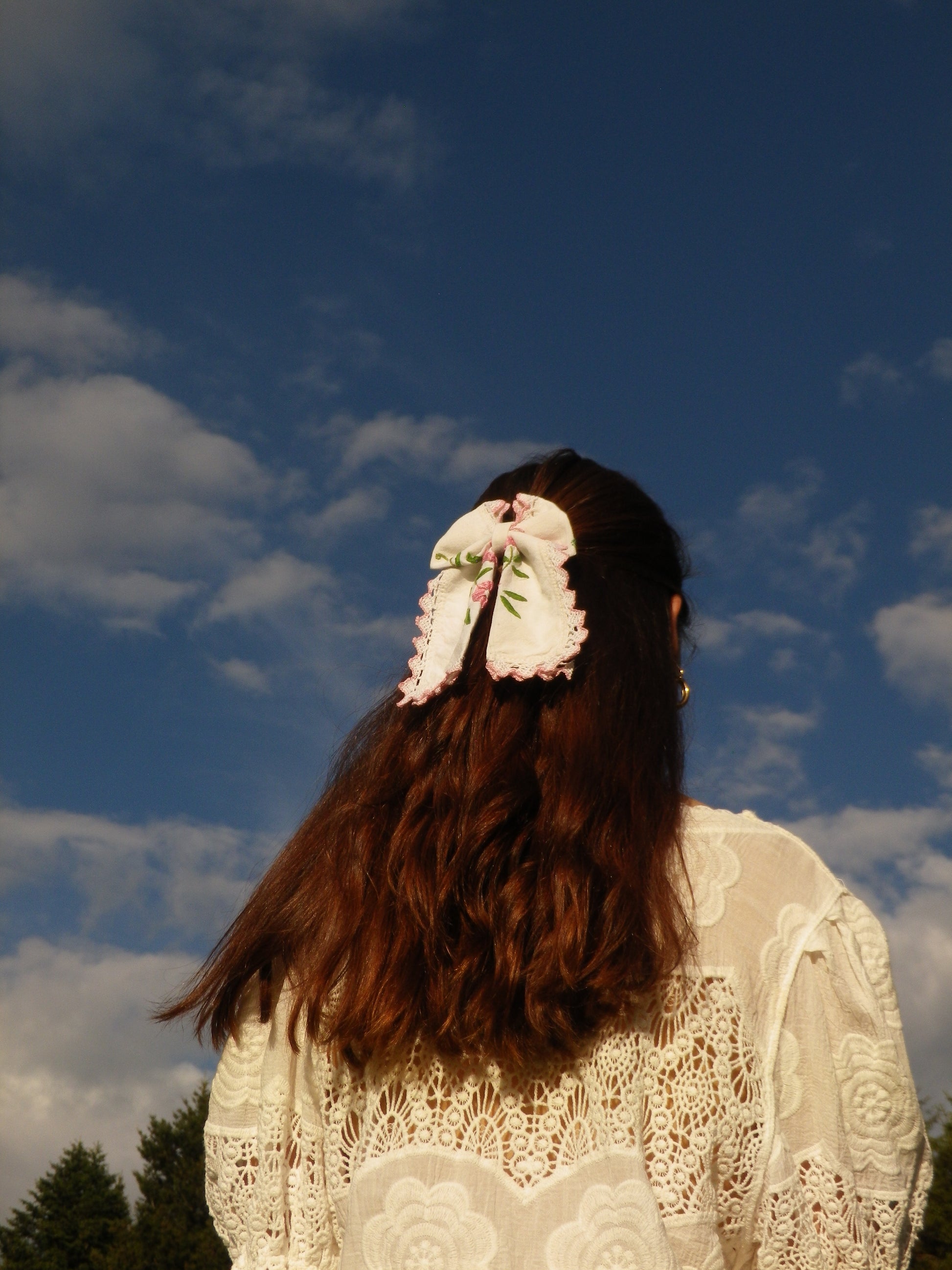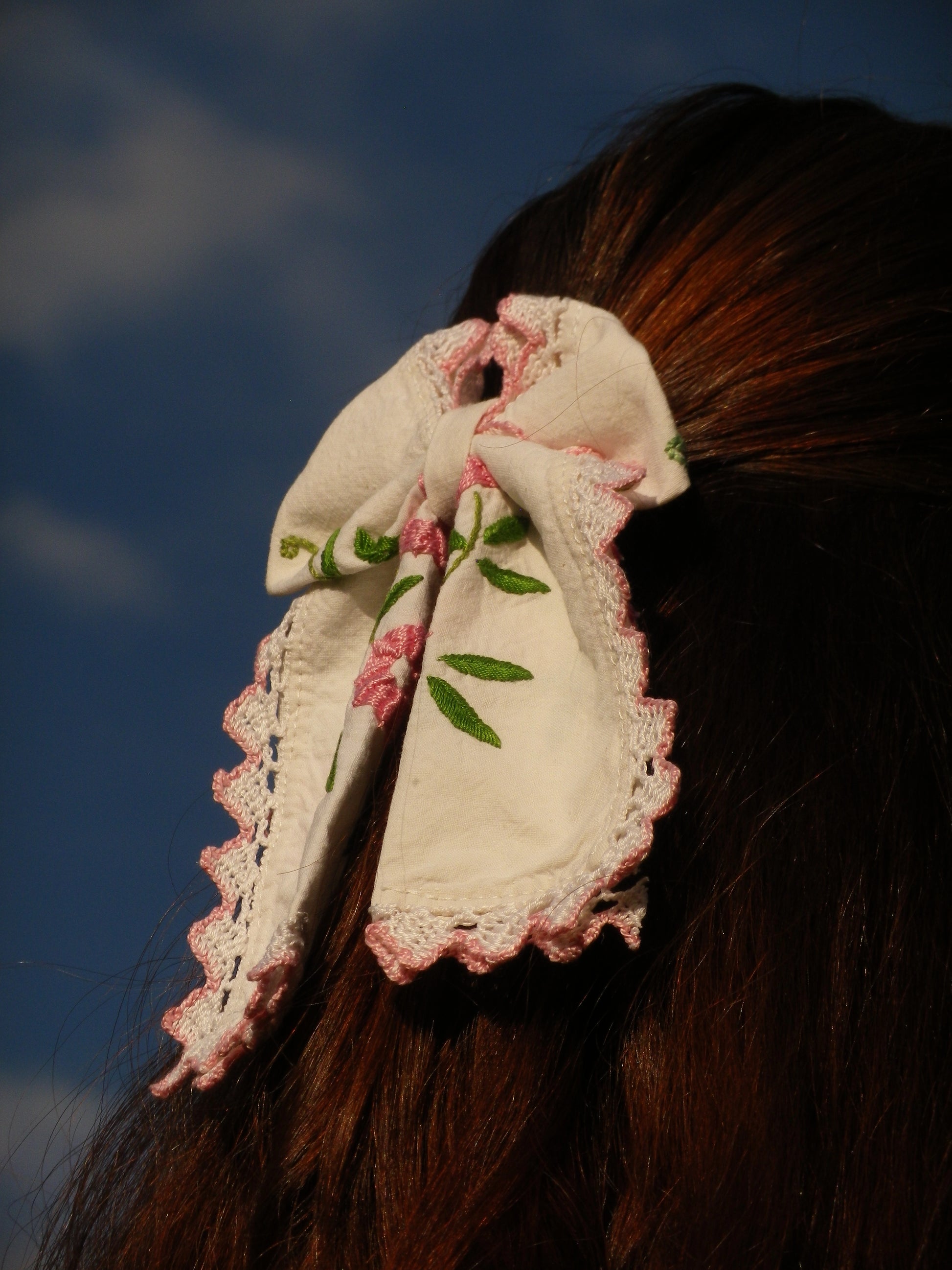 Ce noeud à été confectionné à partir d'une broderie récupérée chez ma mamie. Idéal pour mettre en valeur vos jolis cheveux, il apporte une touche vintage et champêtre à votre look !