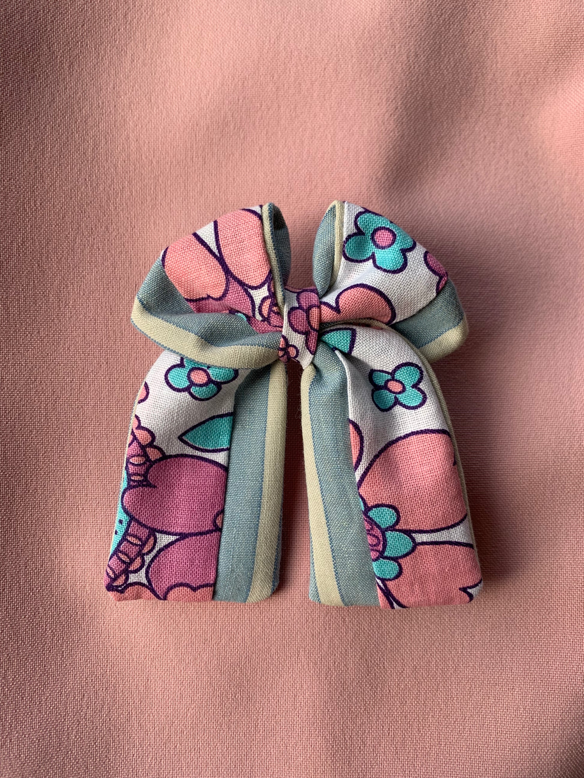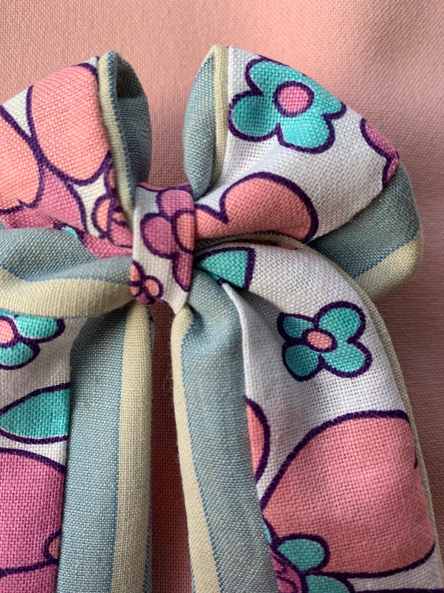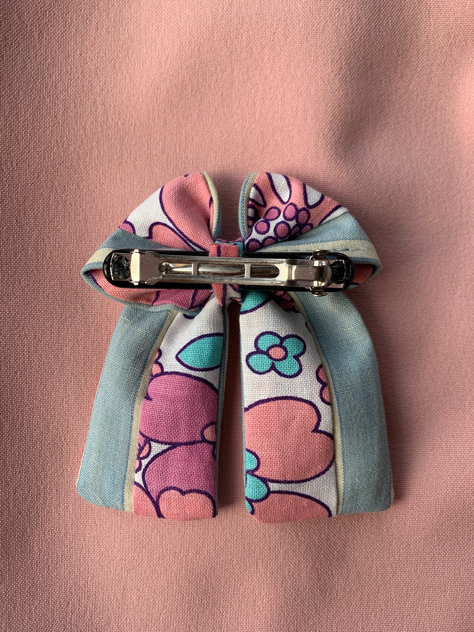 Joli noeud pour cheveux cousu par nos soins à partir de deux tissus de seconde main :) Un tissu au motif groowy flowers et un autre rayé bleu et blanc crème. La barrette clip qui tient le noeud mesure 6,5 cm, elle est solide.