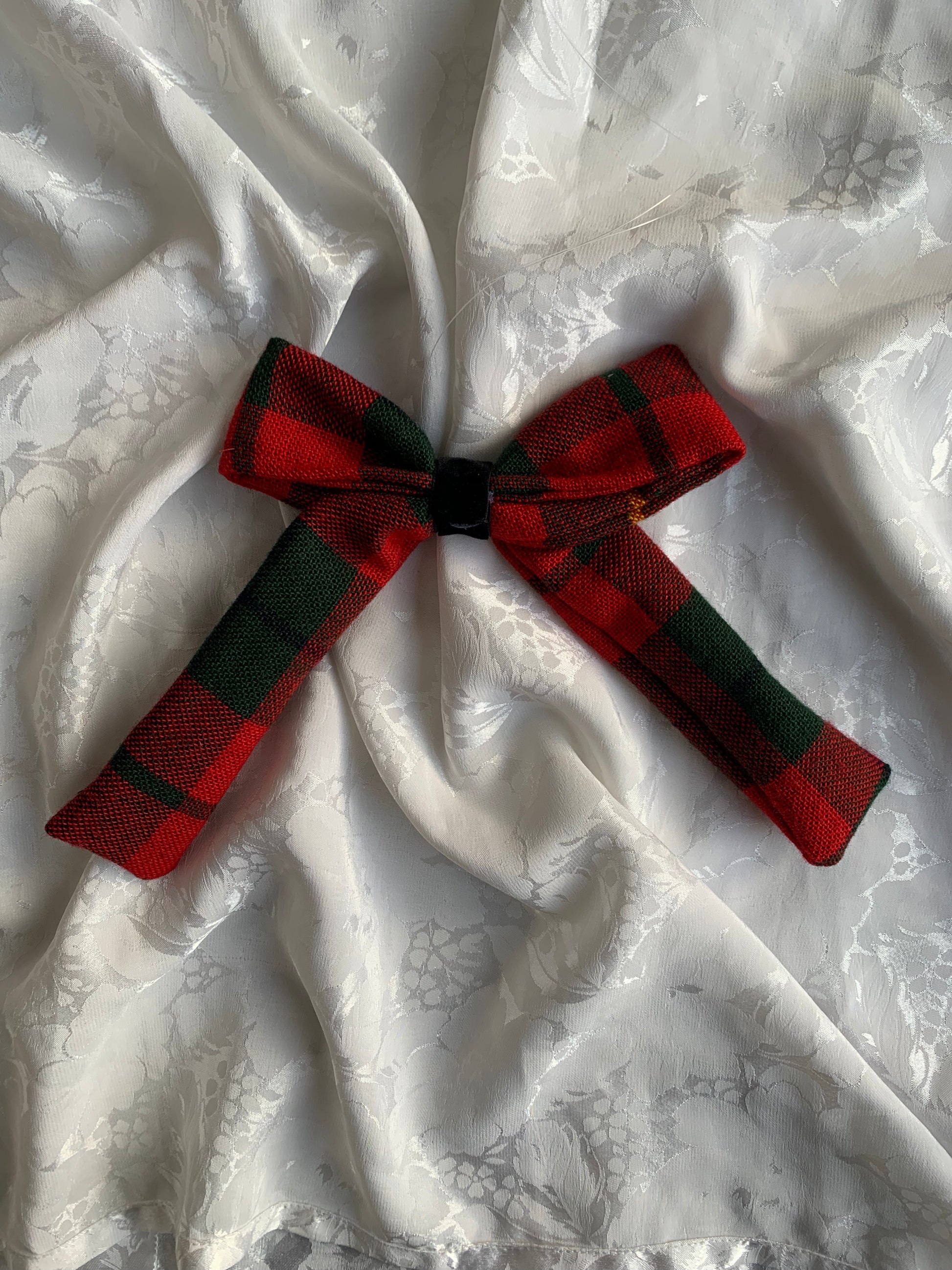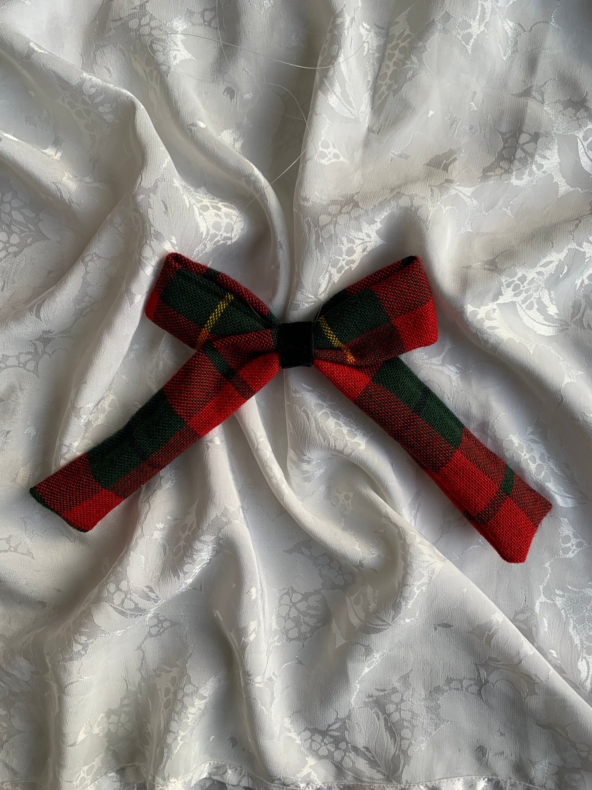 Noeud cousu par nos soins à partir de tissu(s) de seconde main. Il est suspendu à un fil de pêche transparent.