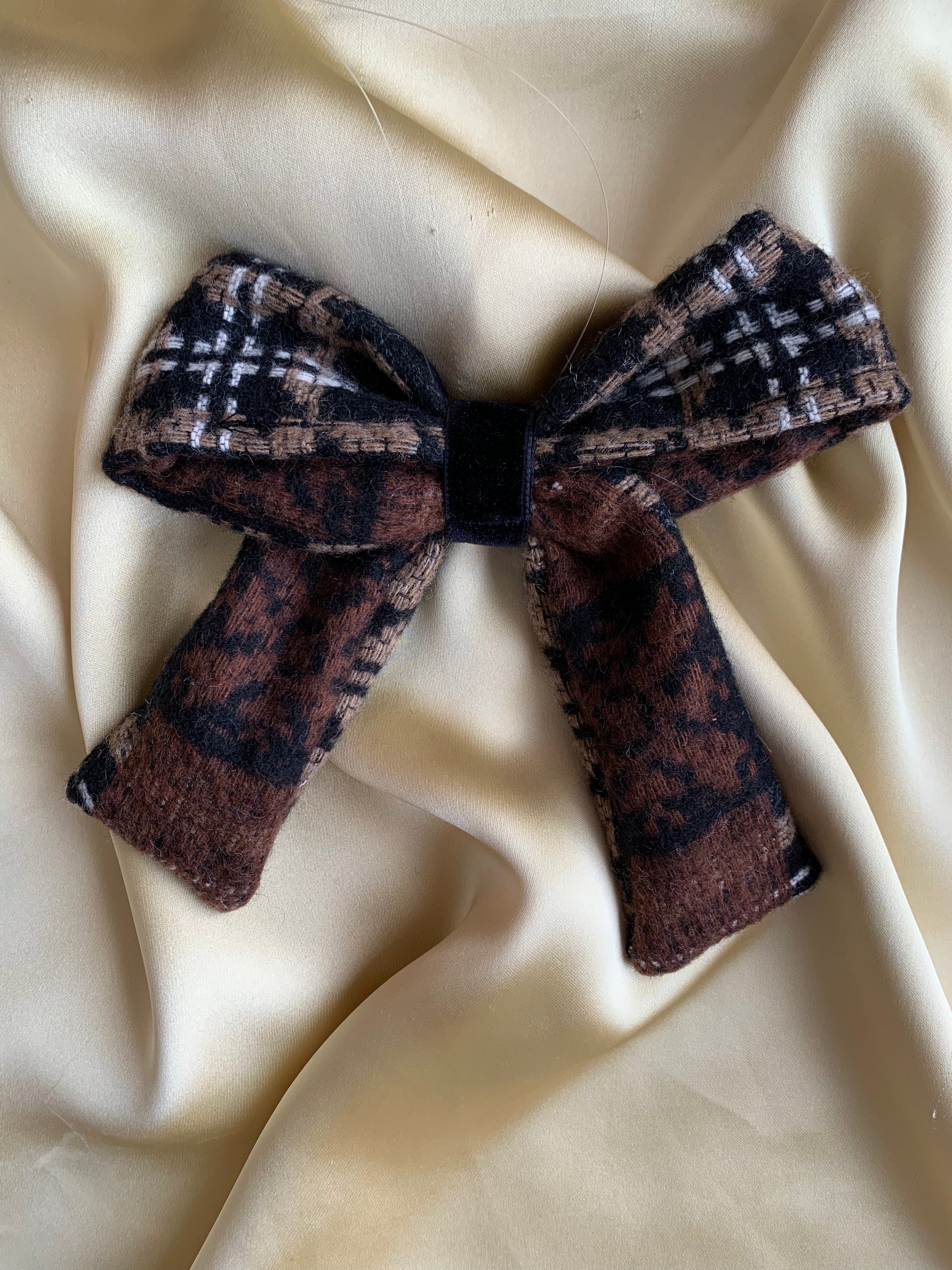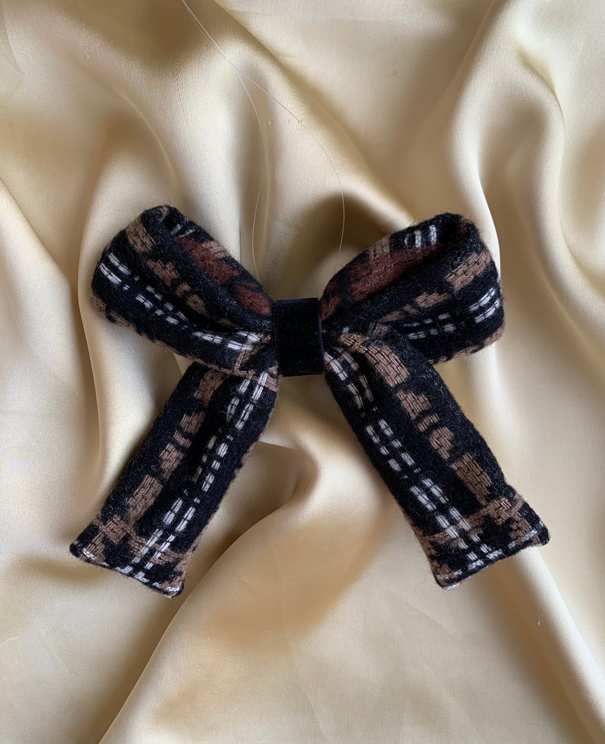 Noeud cousu par nos soins à partir de tissu(s) de seconde main. Il est suspendu à un fil de pêche transparent.
