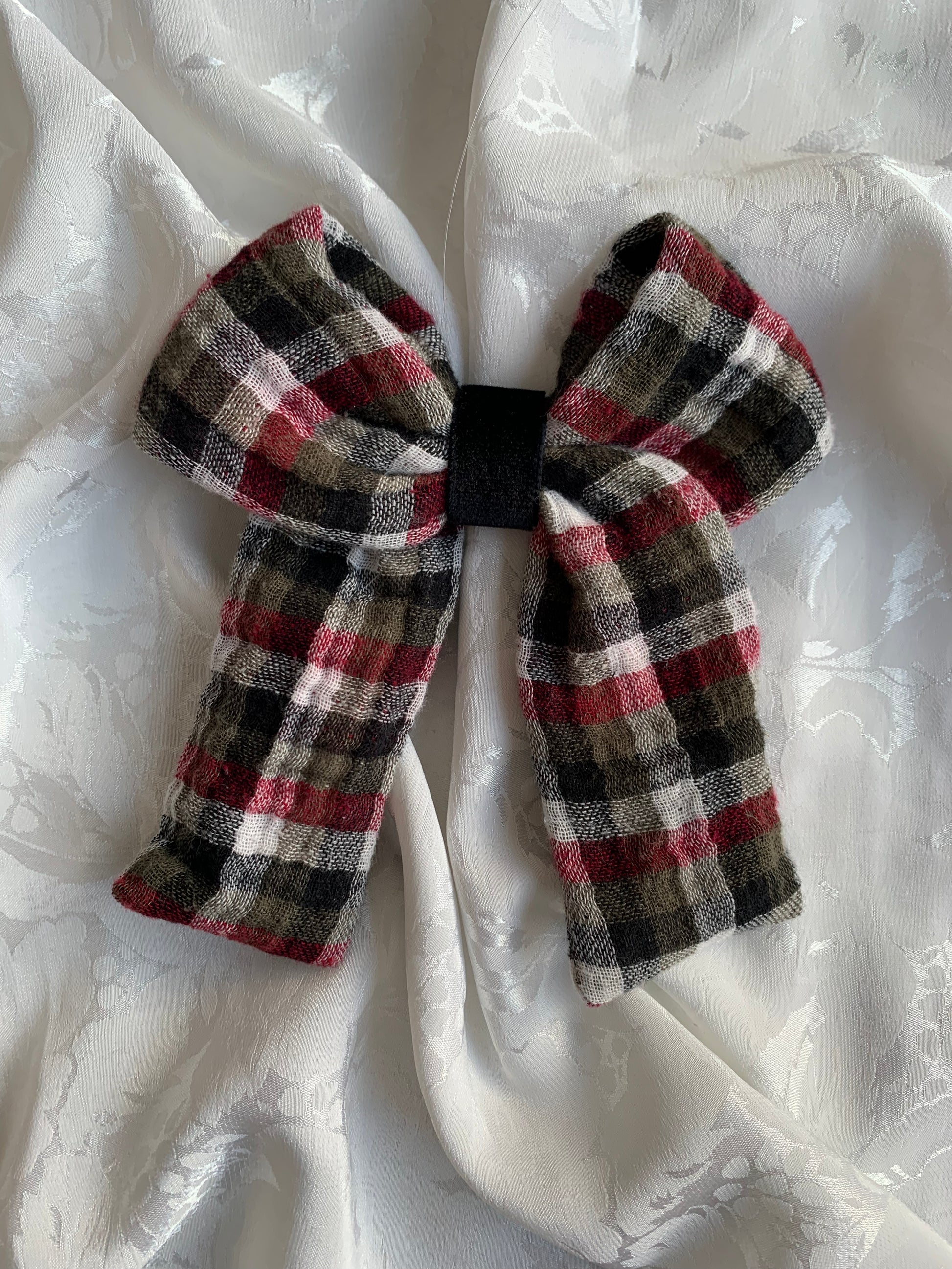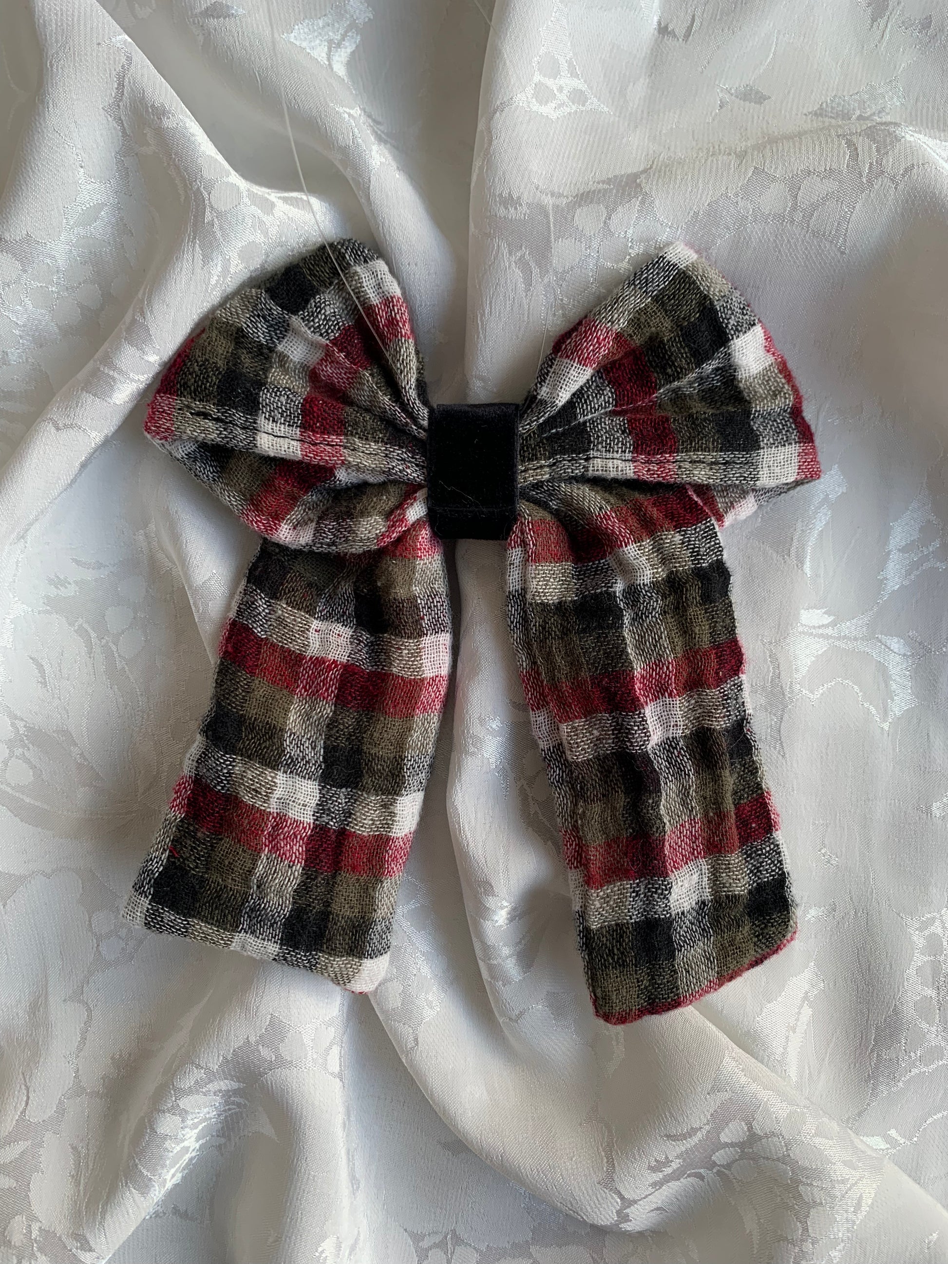 Noeud cousu par nos soins à partir de tissu(s) de seconde main. Il est suspendu à un fil de pêche transparent.