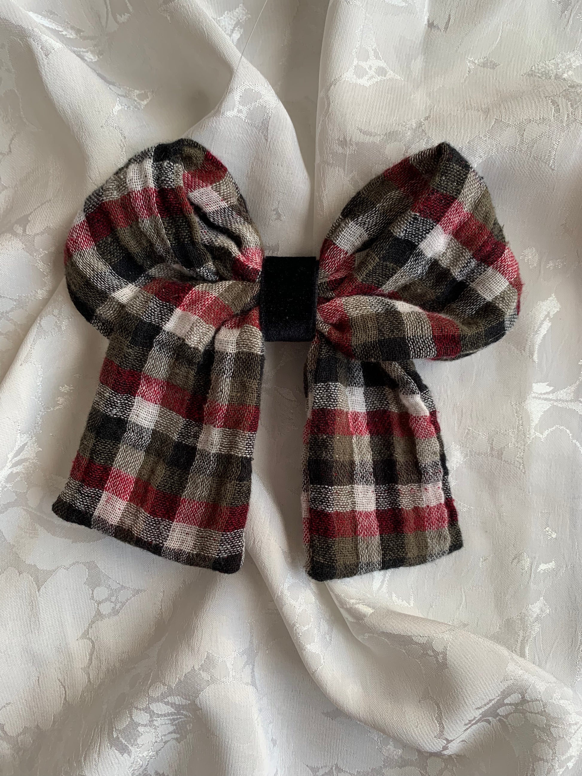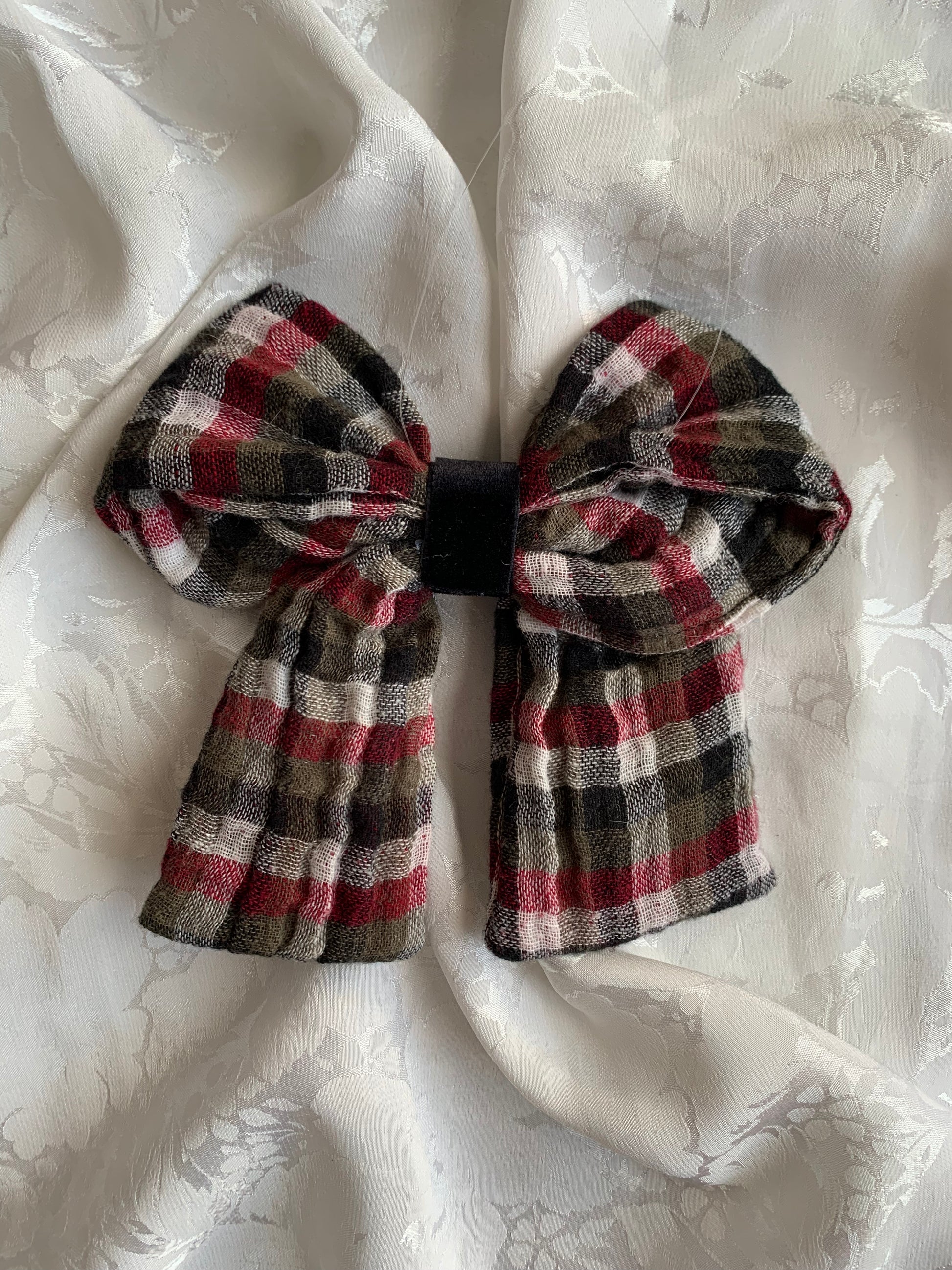 Noeud cousu par nos soins à partir de tissu(s) de seconde main. Il est suspendu à un fil de pêche transparent.