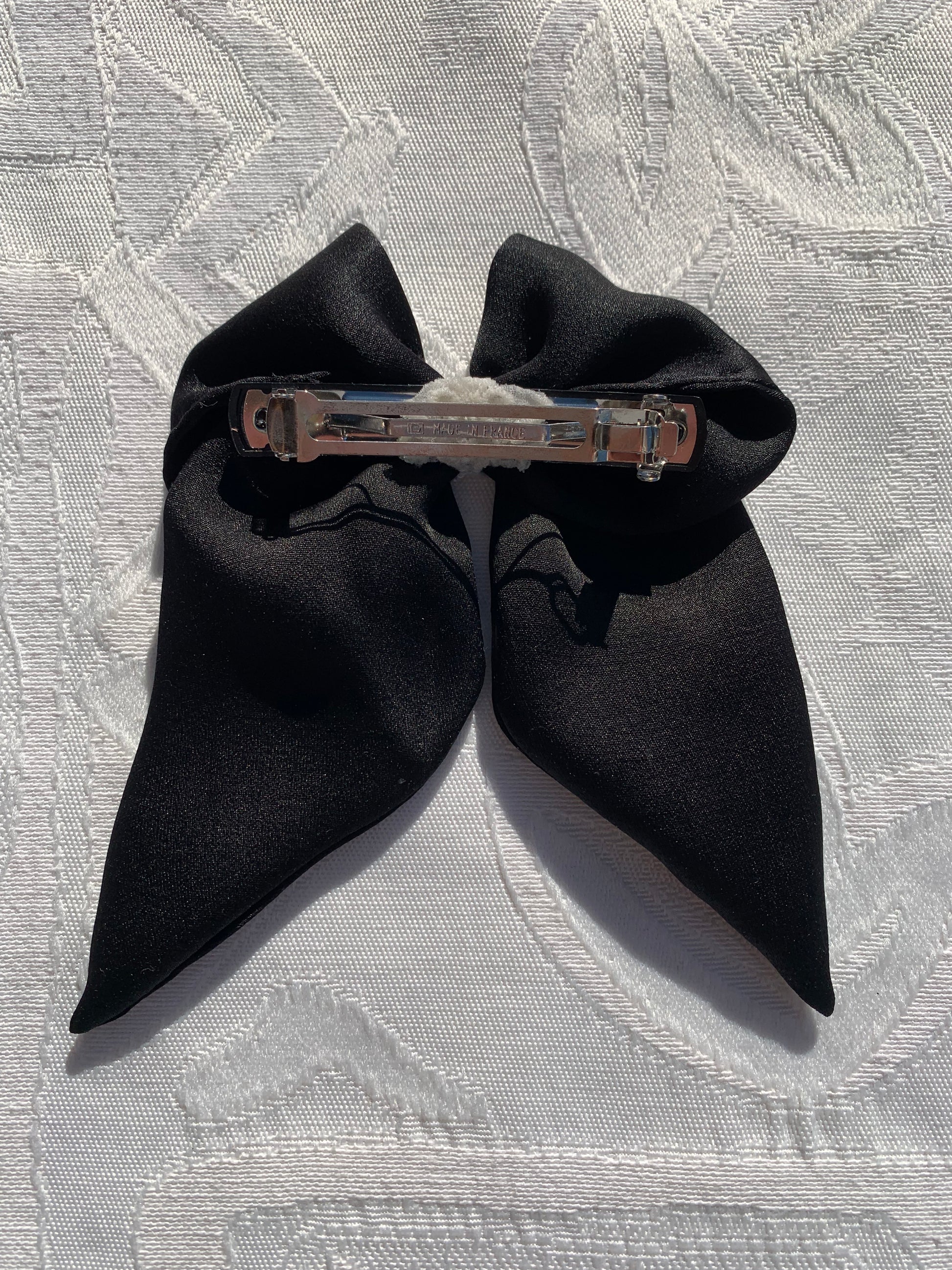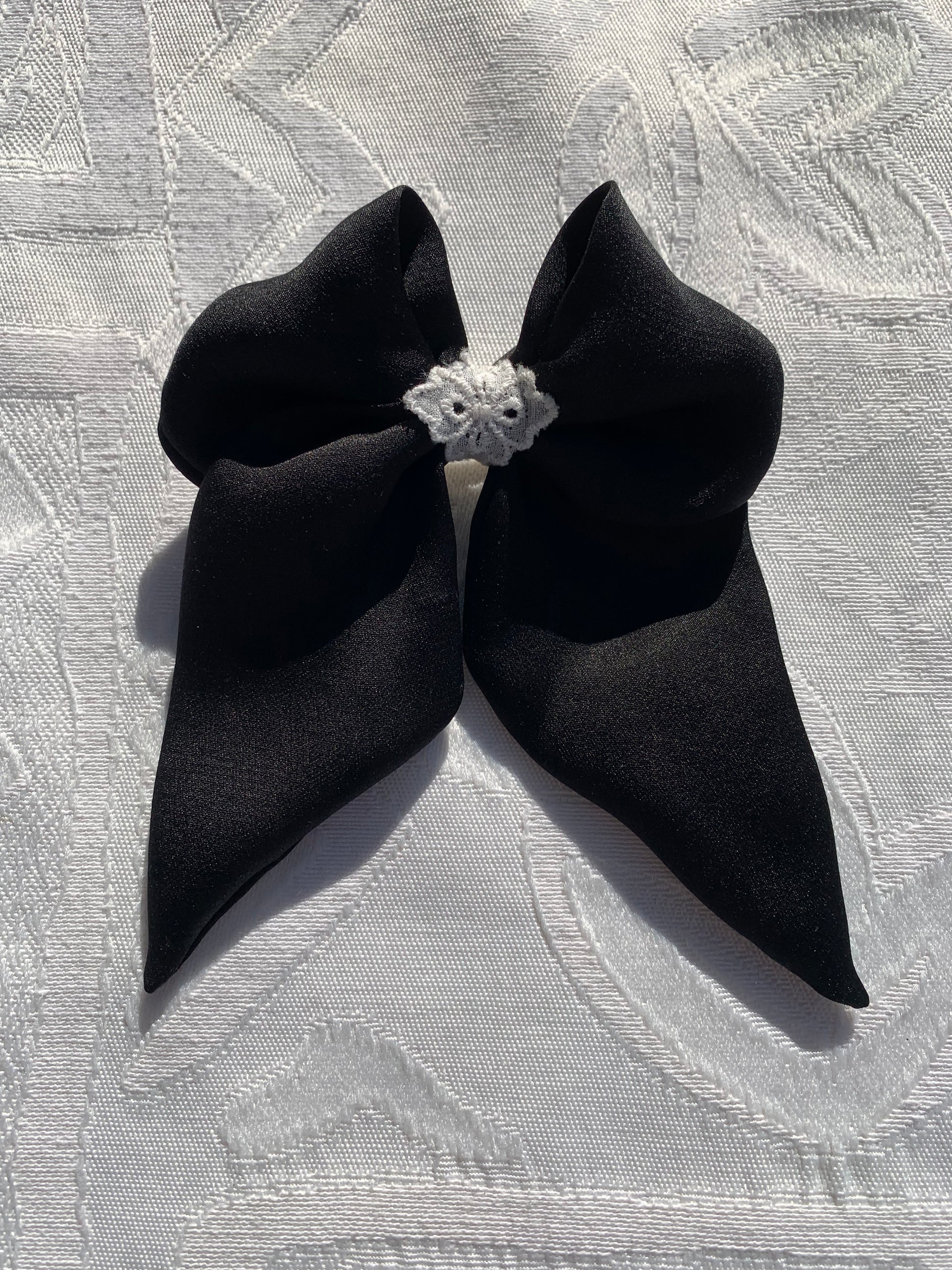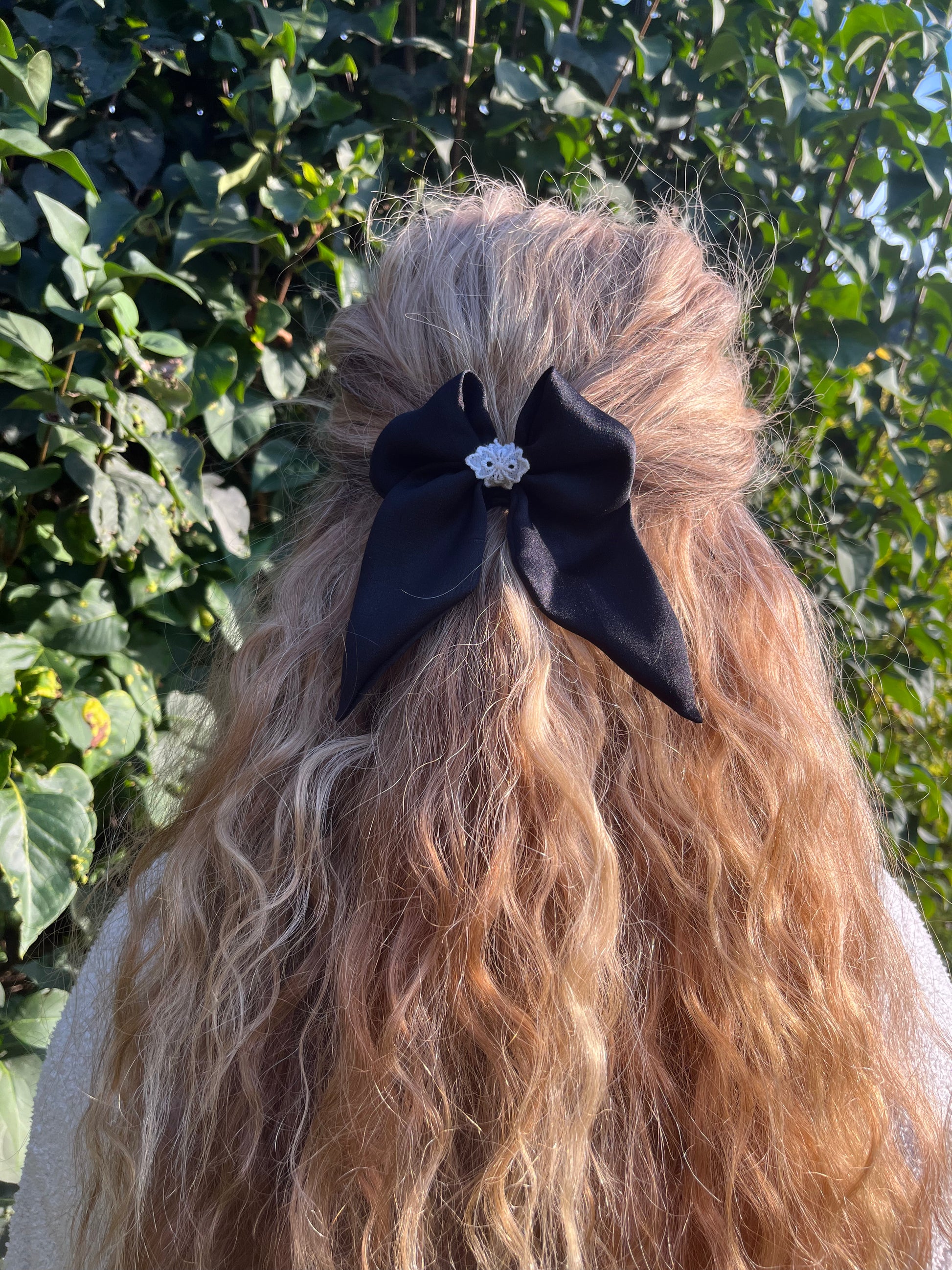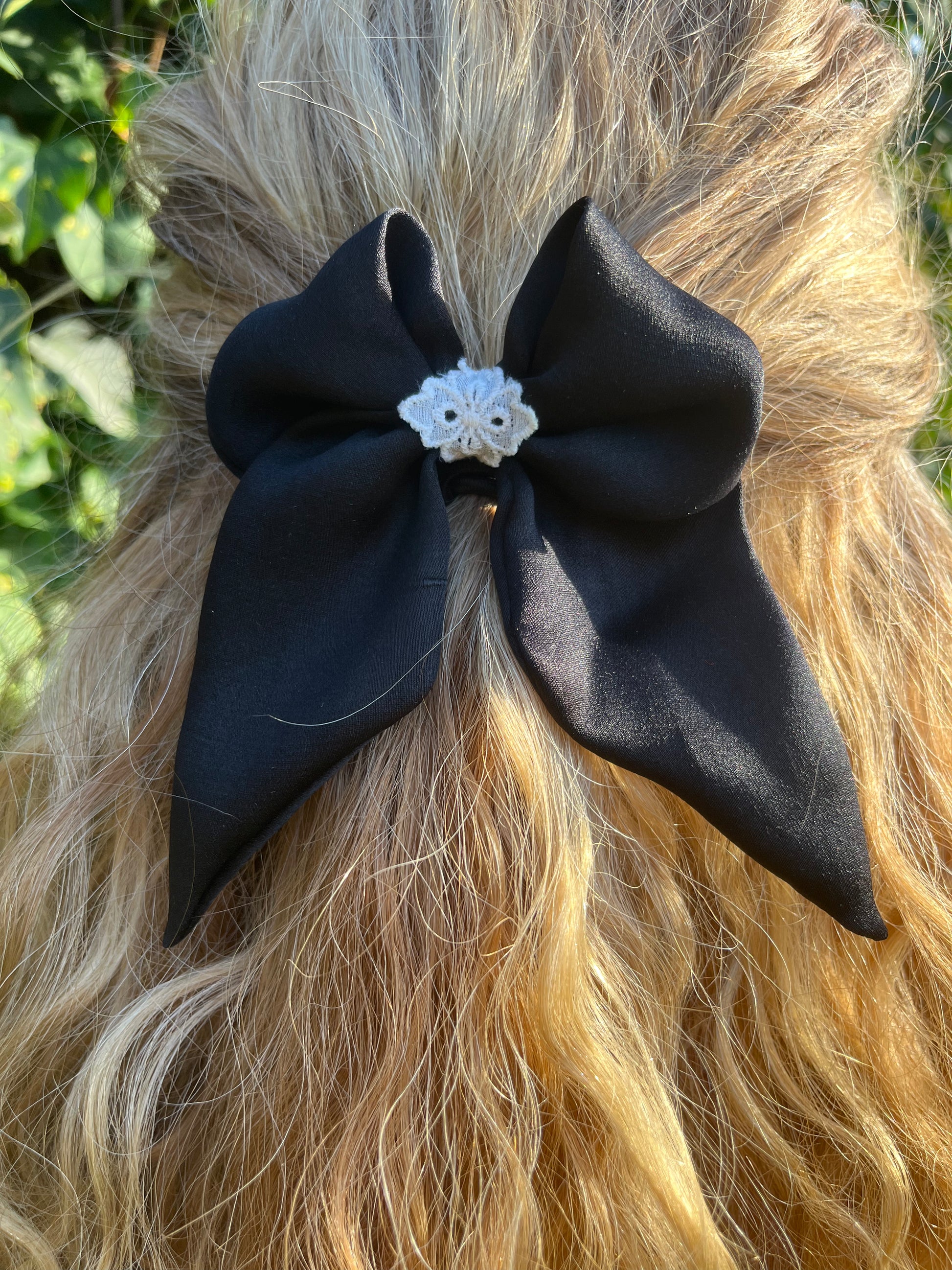 Joli noeud de cheveux noir avec de la dentelle au milieu cousu par nos soins à partir d'un tissu de seconde main :) La barrette clip qui tient le noeud mesure 7,5 cm, elle est solide et made in France.