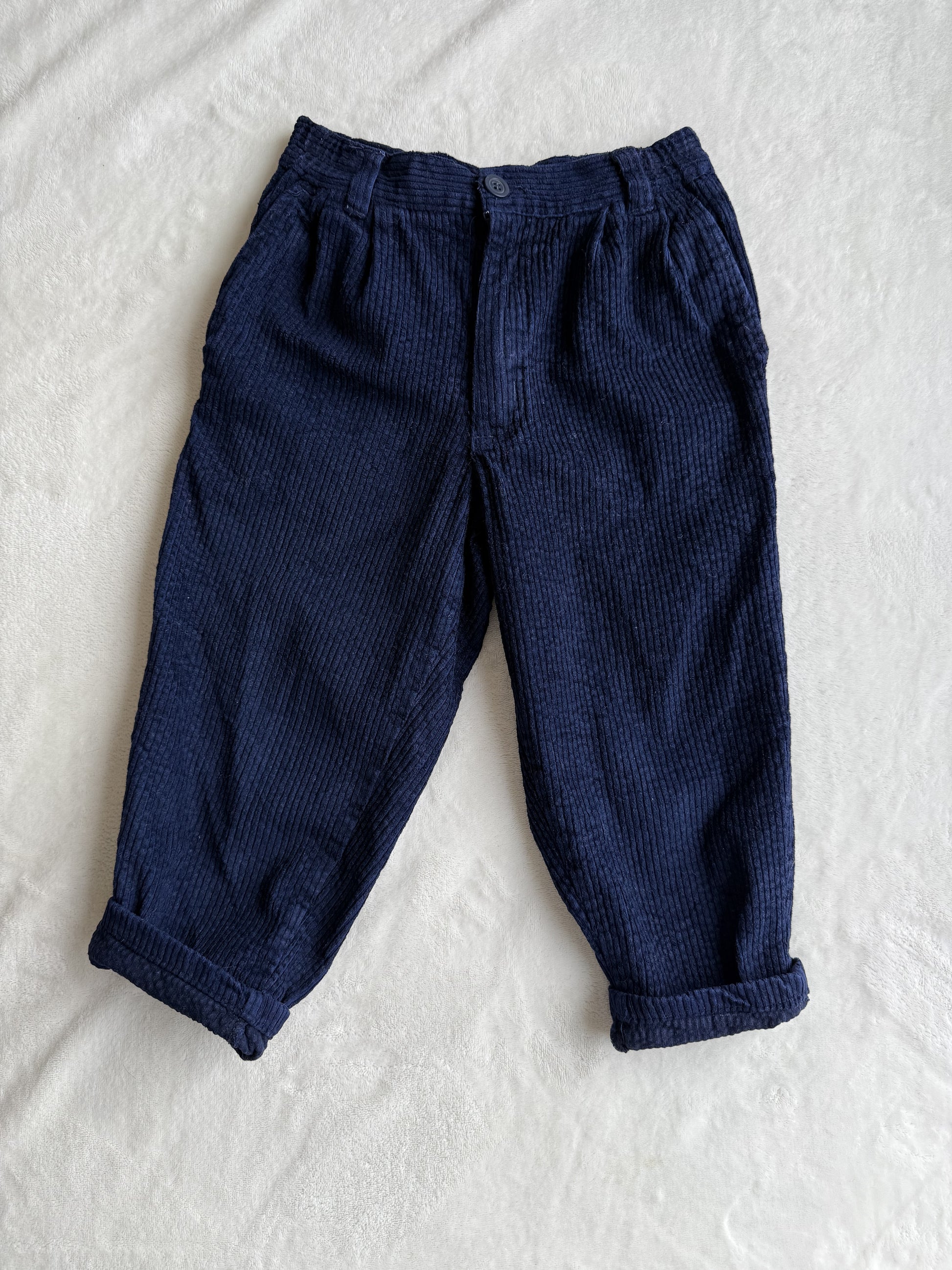 Pantalon bleu foncé en velours côtelé, 100% coton. Sur l'étiquette il est affiché taille 4 ans, mais nous vous recommandons de vérifier les dimensions ci-dessous pour vous assurer que l'article correspond à vos besoins !