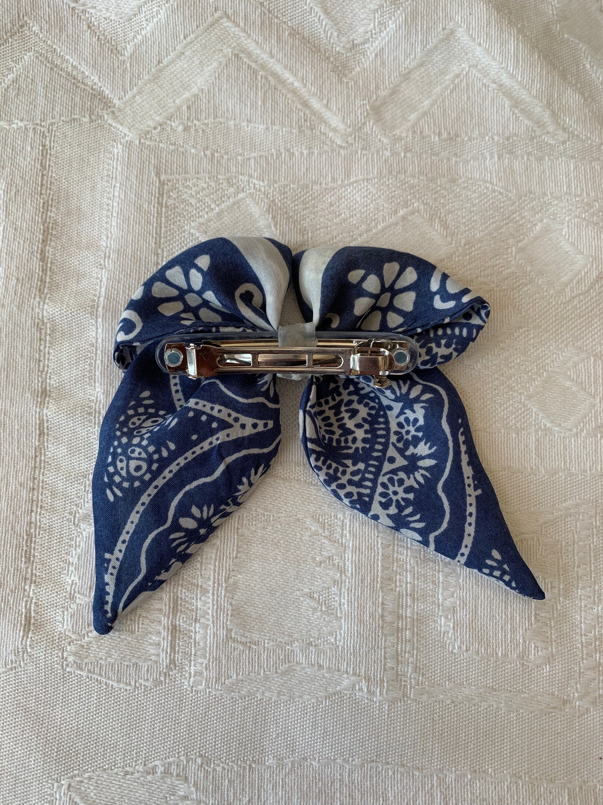 Petit noeud cousu par nos soins à partir d'un foulard de seconde main. La barrette clip mesure 6,5 cm.