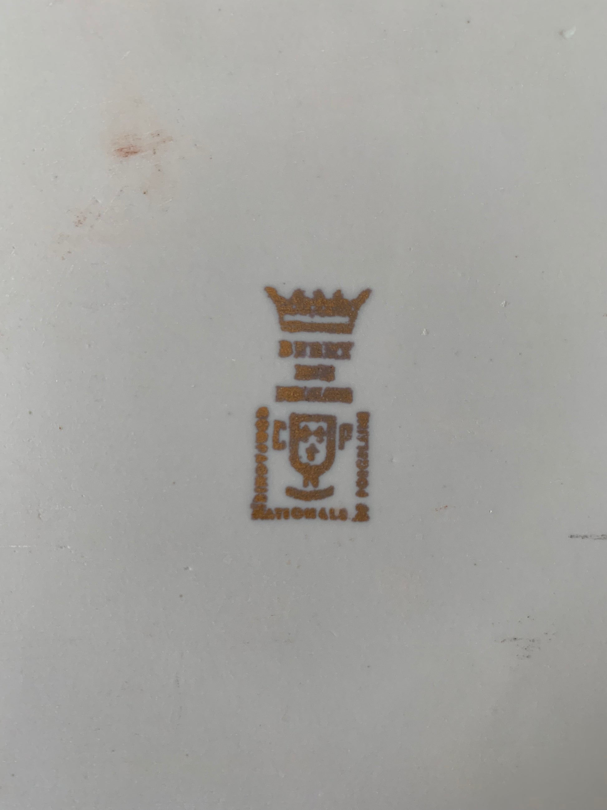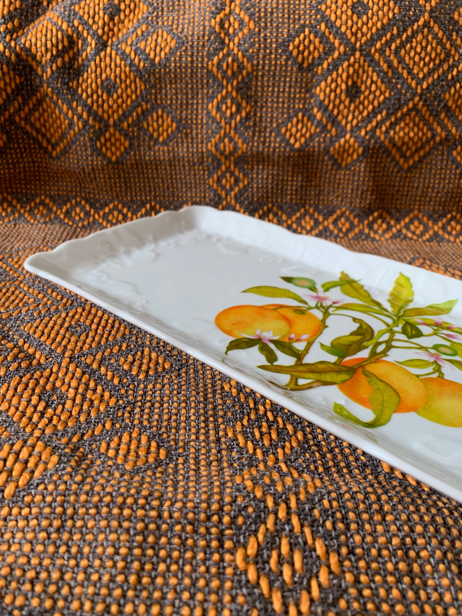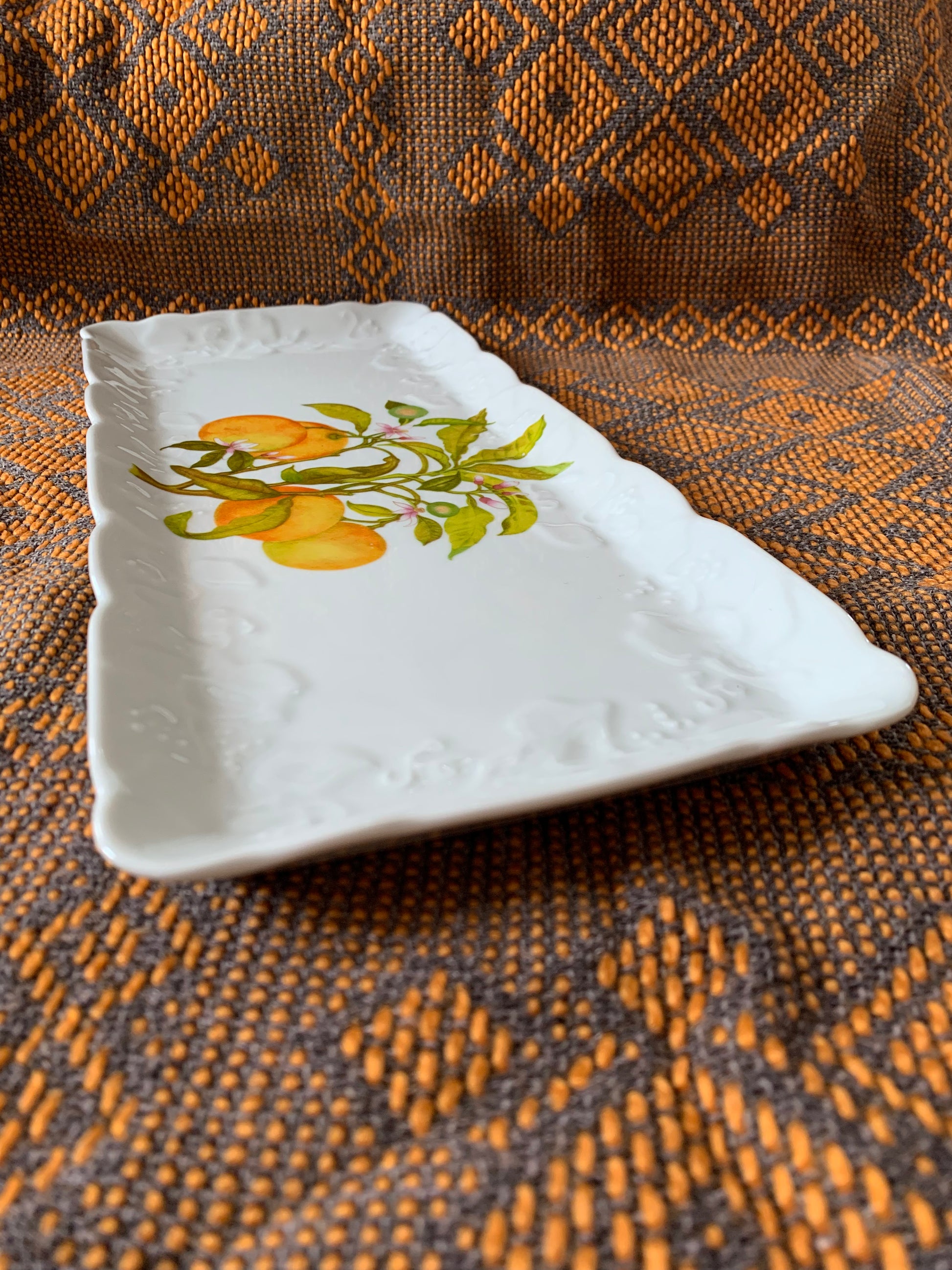 Joli plat en porcelaine décoré avec des fruits. Nous ne pouvons pas préciser la marque puisque la signature à l'arrière est illisible. Il est très légèrement ébréché à l'arrière au niveau d'un angle (photo).
