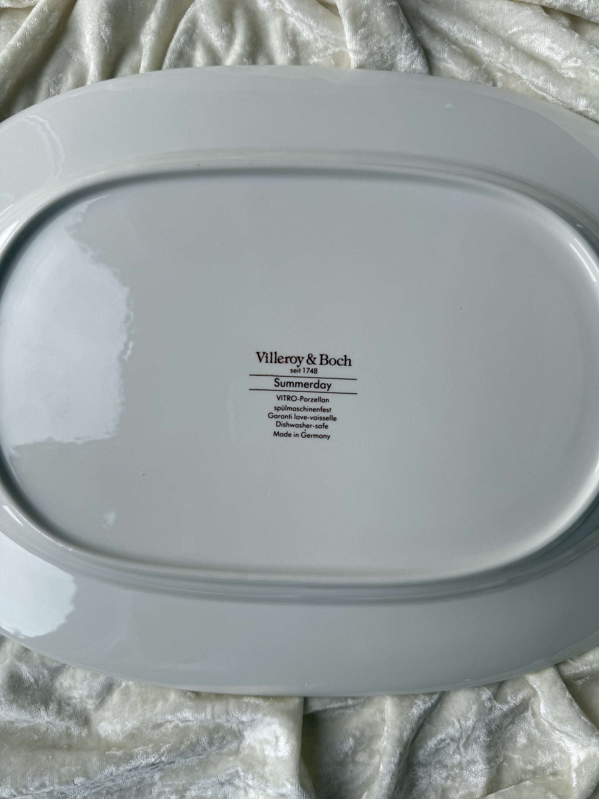 Magnifique plat en porcelaine Villeroy & Boch Summerday. Made in Germany. Il est en parfait état : aucune ébréchure et les motifs sont comme neuf. On peut seulement voir quelques légères griffures au centre si on place le plat à la lumière, mais ça reste très discret et quasiment imperceptible.