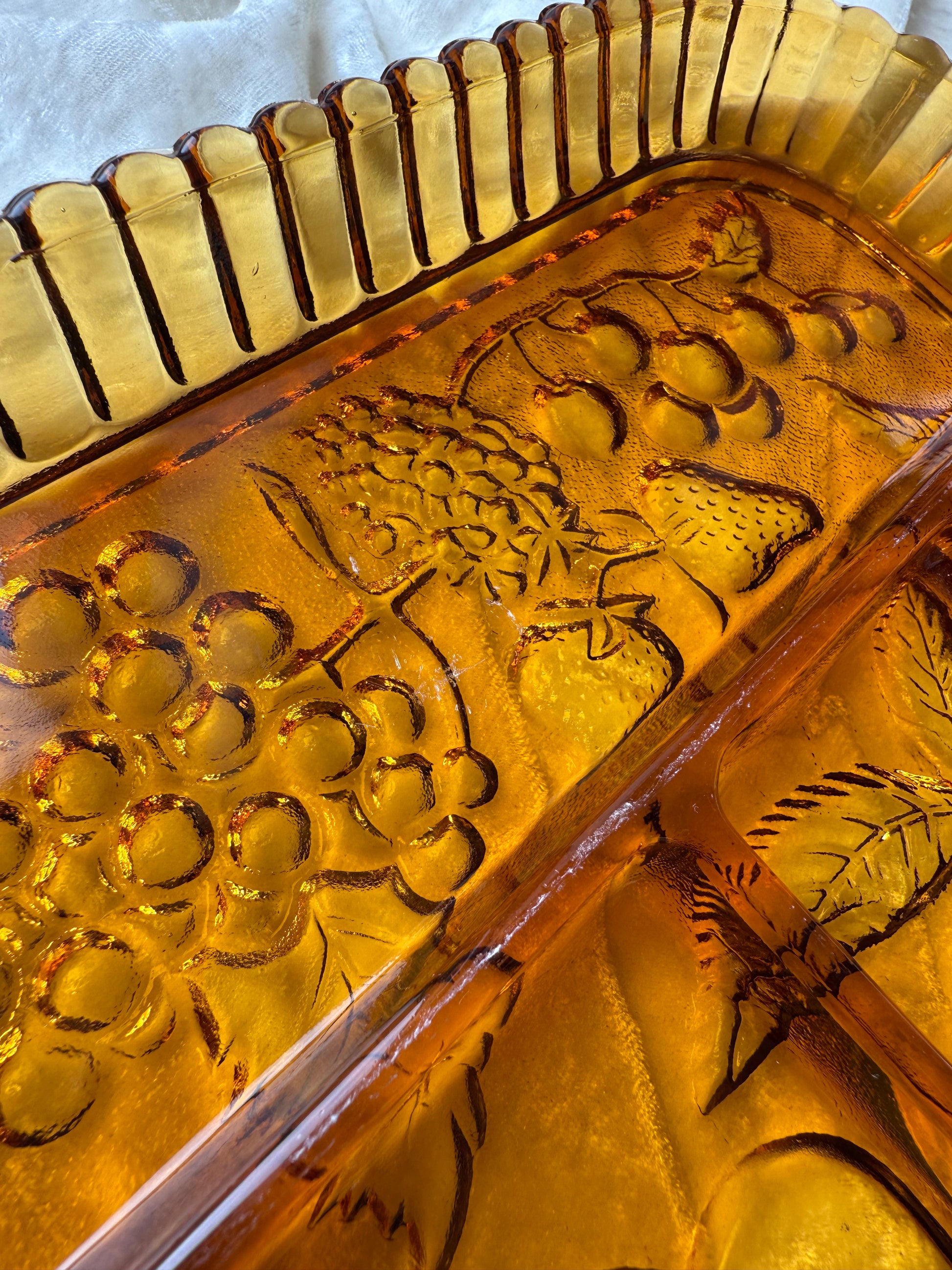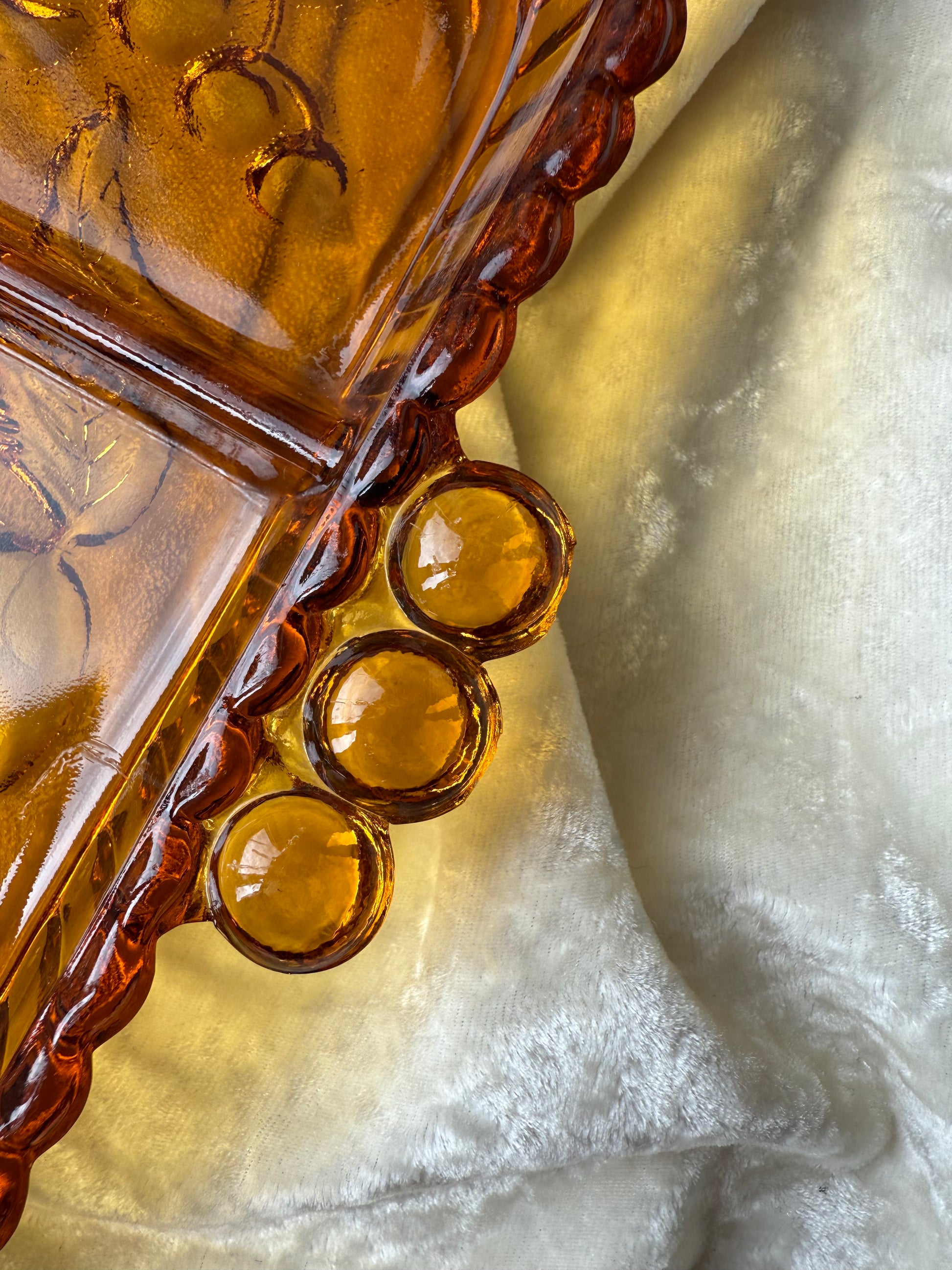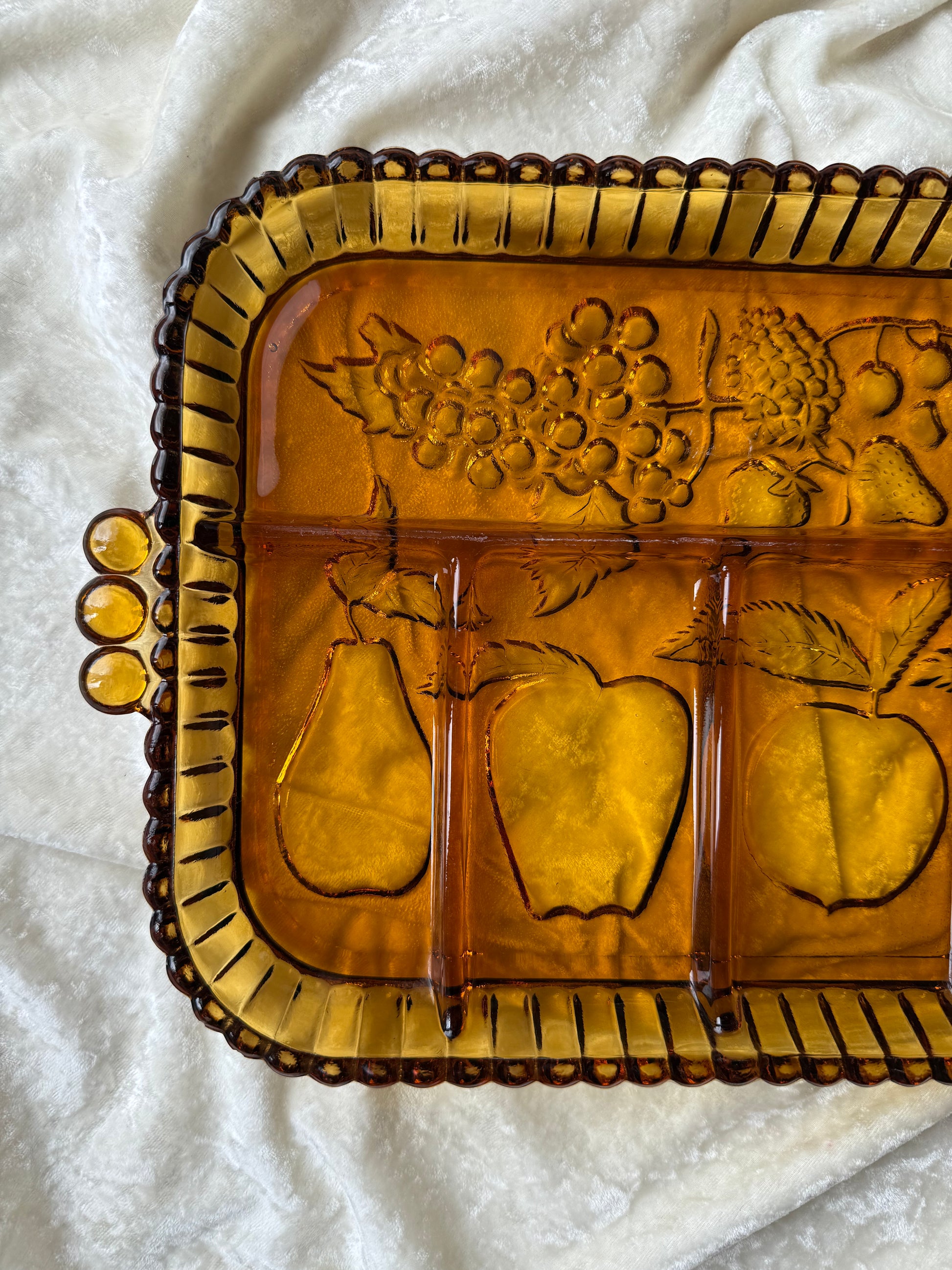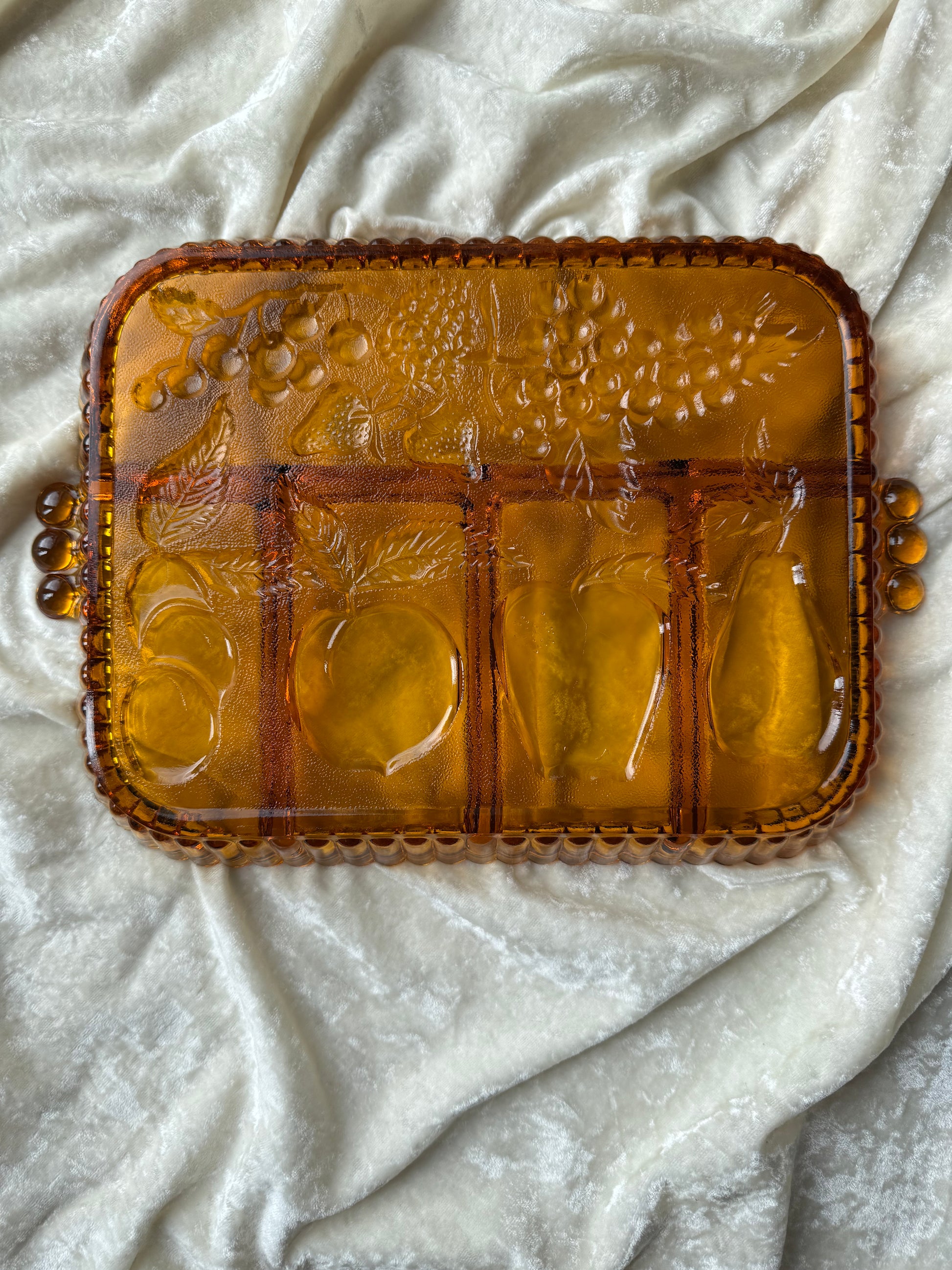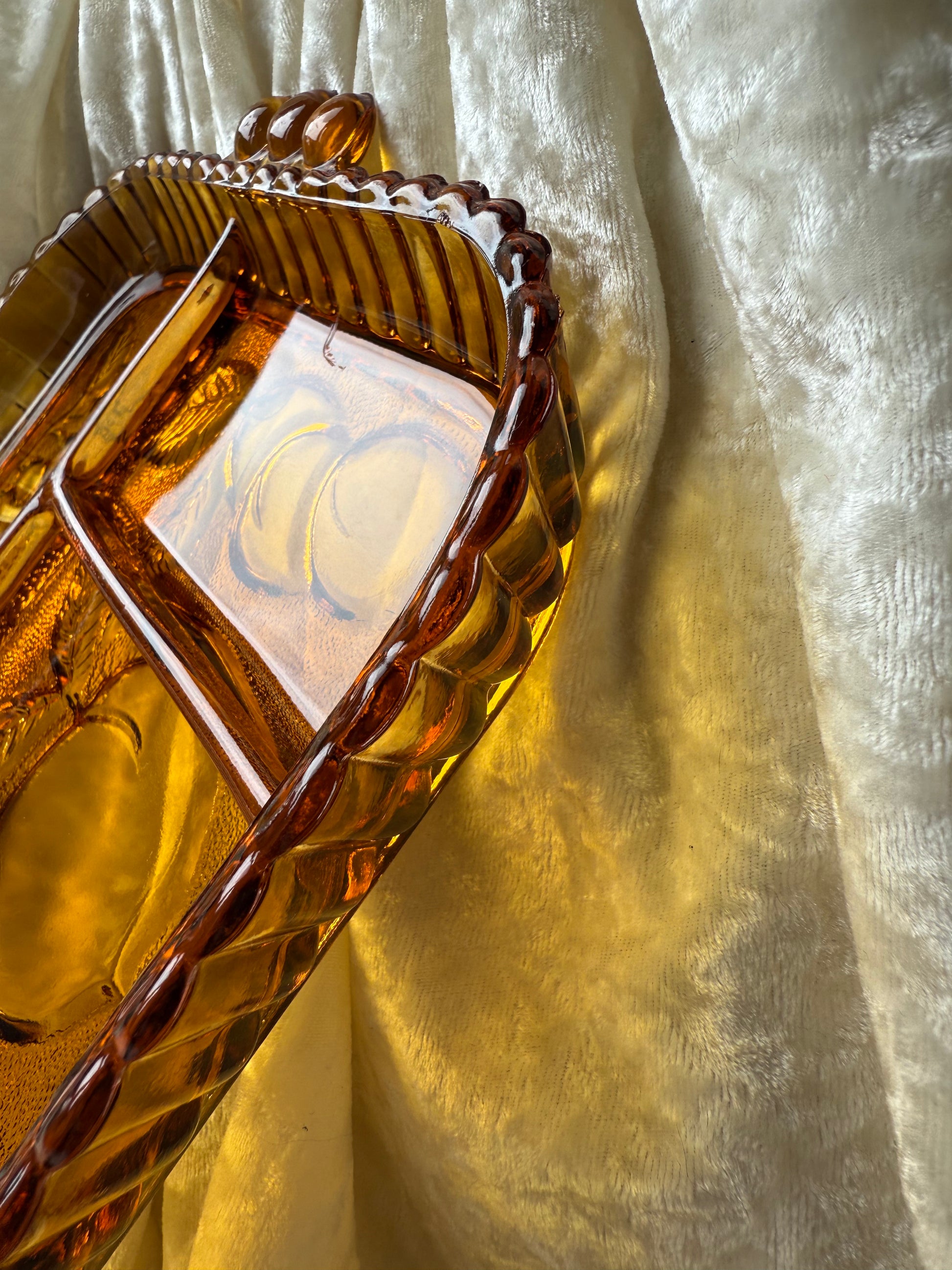 Plateau en verre jaune / ambré compartimenté Indiana Carnival Glass
