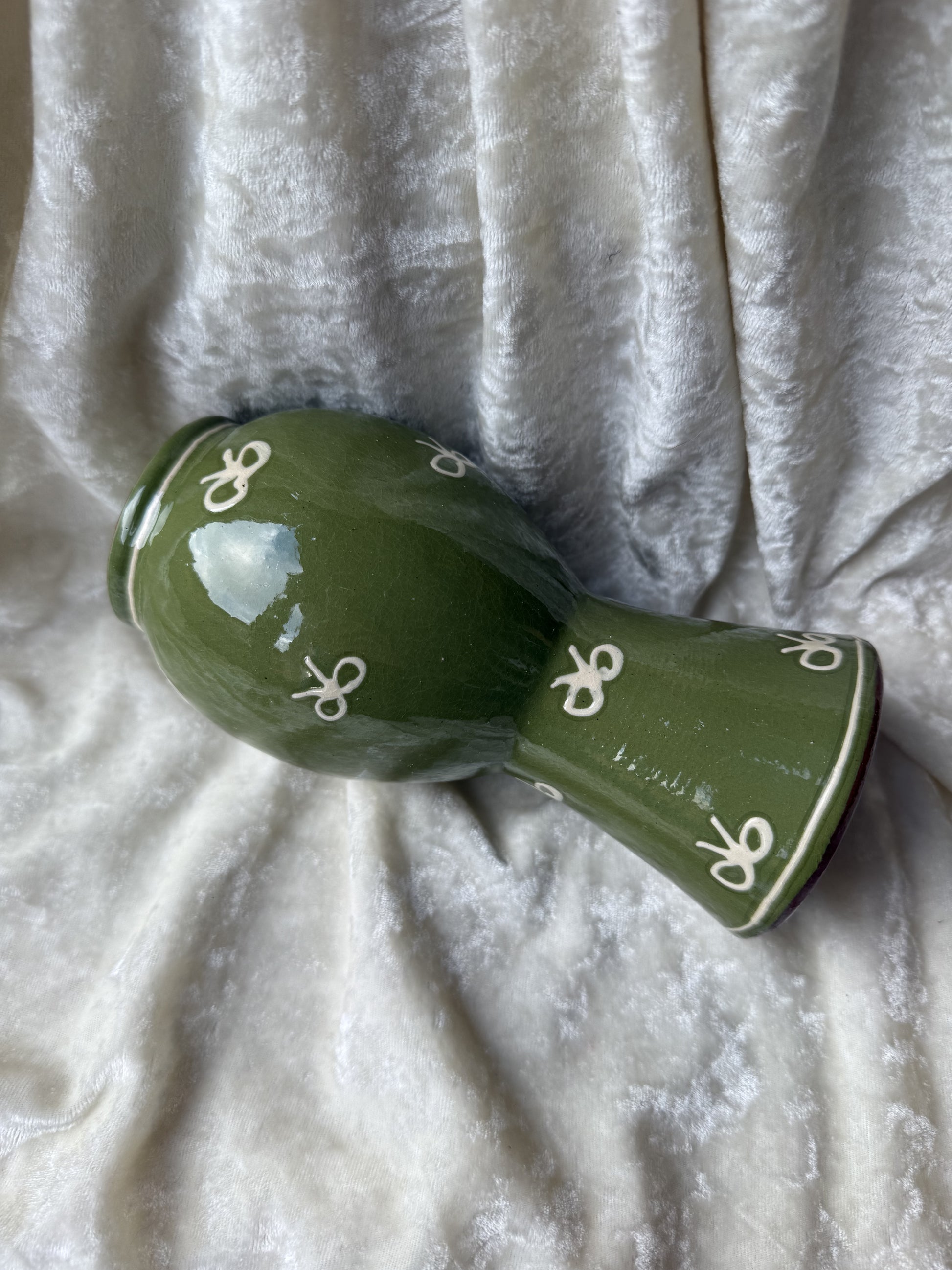 Très beau vase dans l'air du temps avec ses motifs petits noeuds. Il a été fabriqué en terre cuite émaillée. Il a des petites traces blanches à un endroit mais elles sont très discrètes et ne perturbent pas l'esthétique général du vase (voir dernière photo).