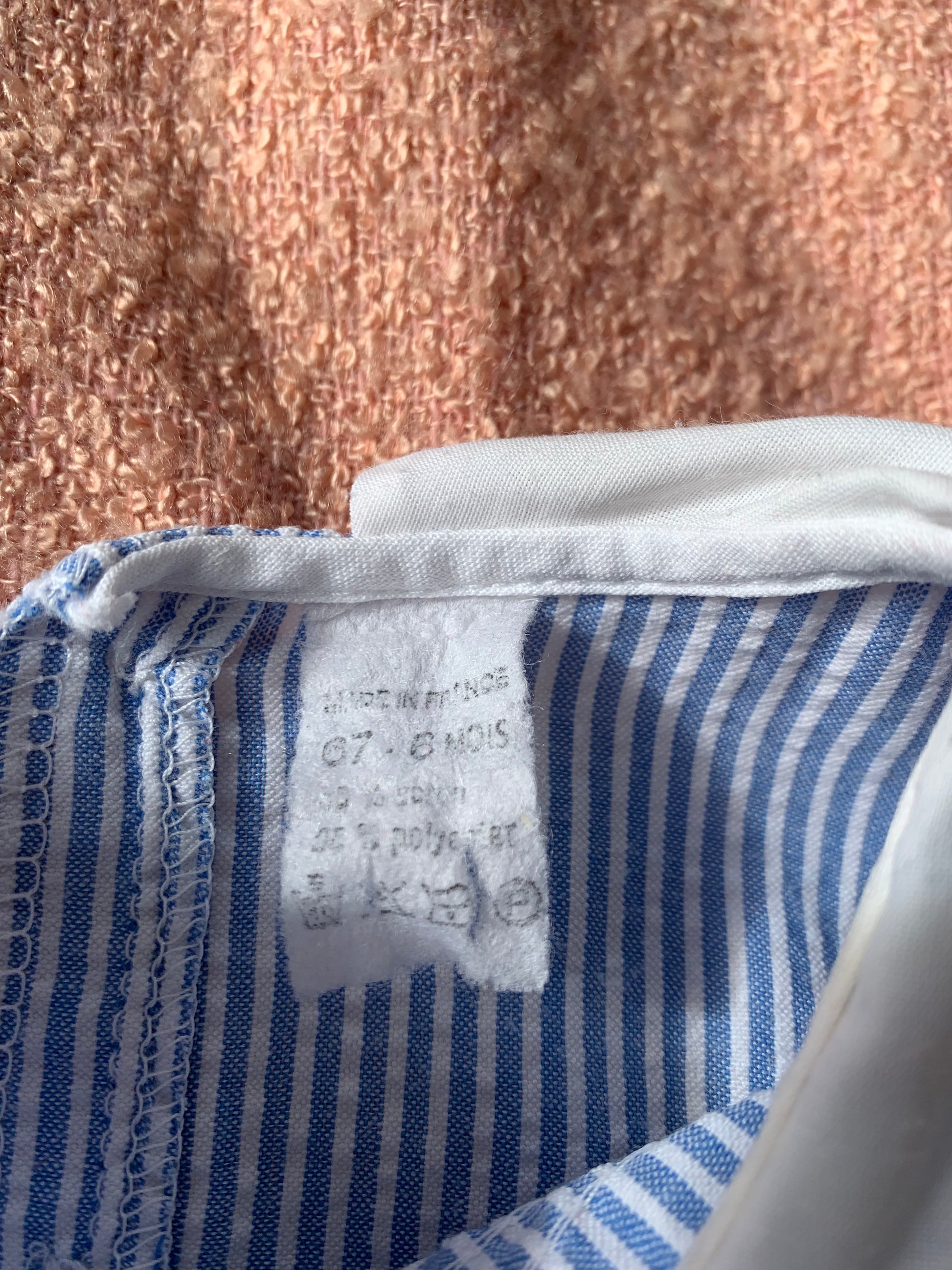 Petite robe rayée toute mignonne, avec un petit col blanc et du détail au niveau du buste. Fabriquée en France. La marque n'est plus visible sur l'étiquette. Composition : coton & polyester, taille 6 mois.