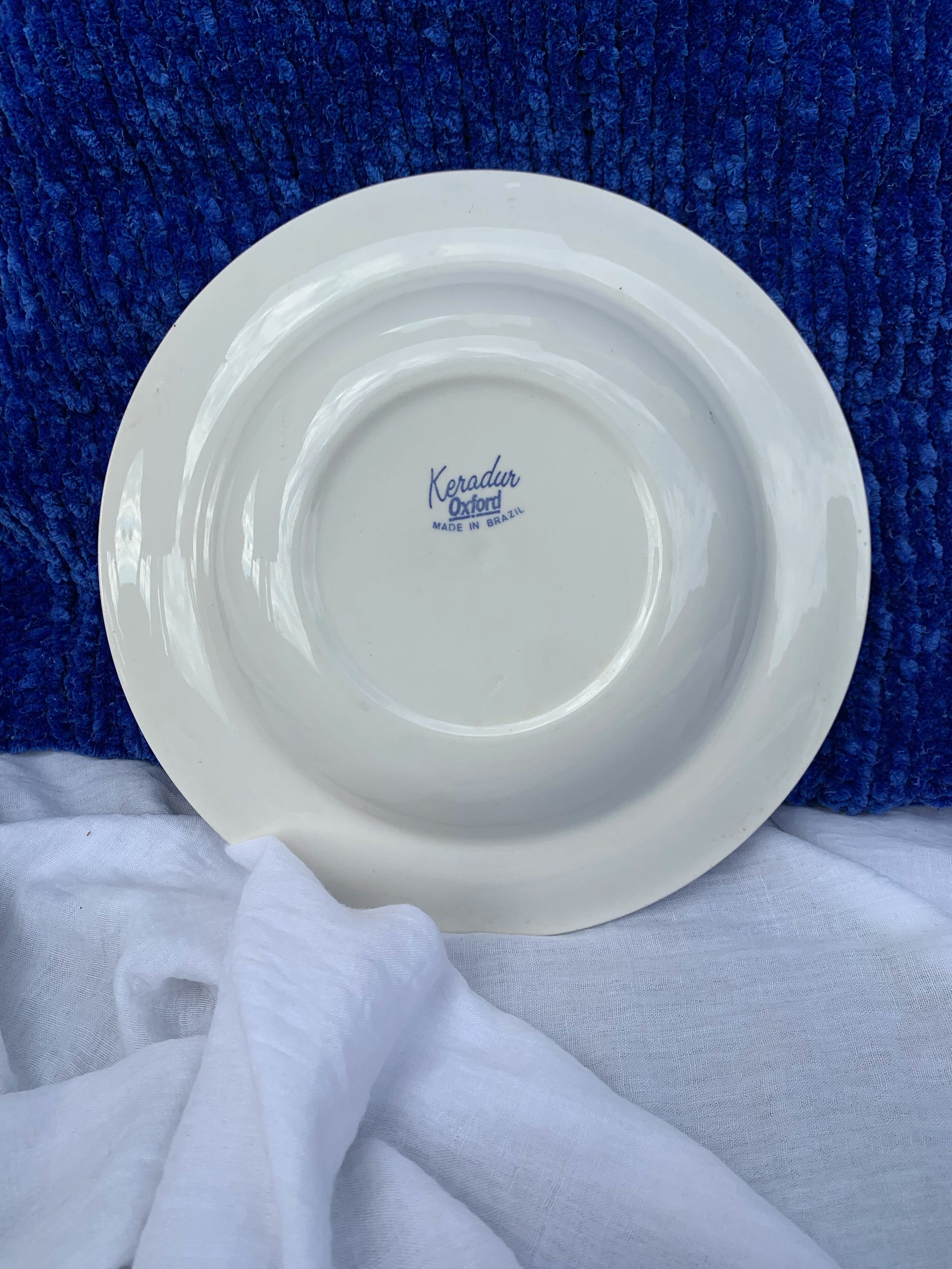 Jolies assiettes creuses fleuries fabriquées au Brésil. Il y a des petites traces noires sur les côtés de certaines assiettes (photo), l'ensemble est en très bon état.