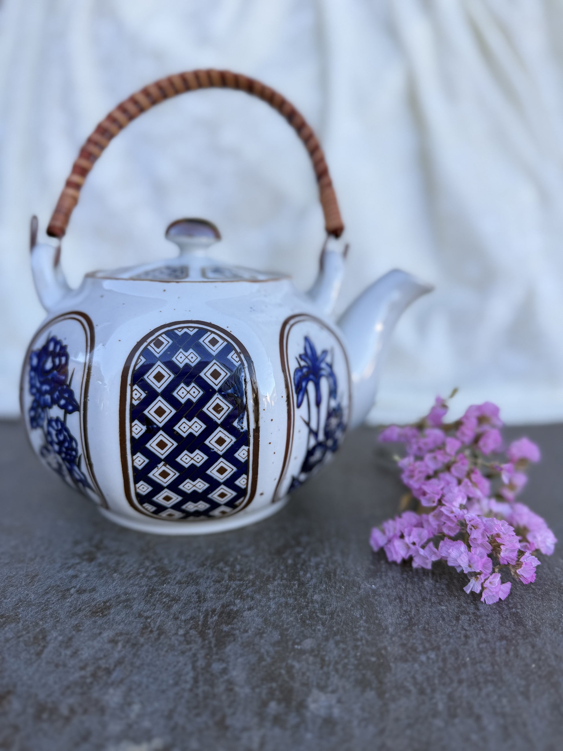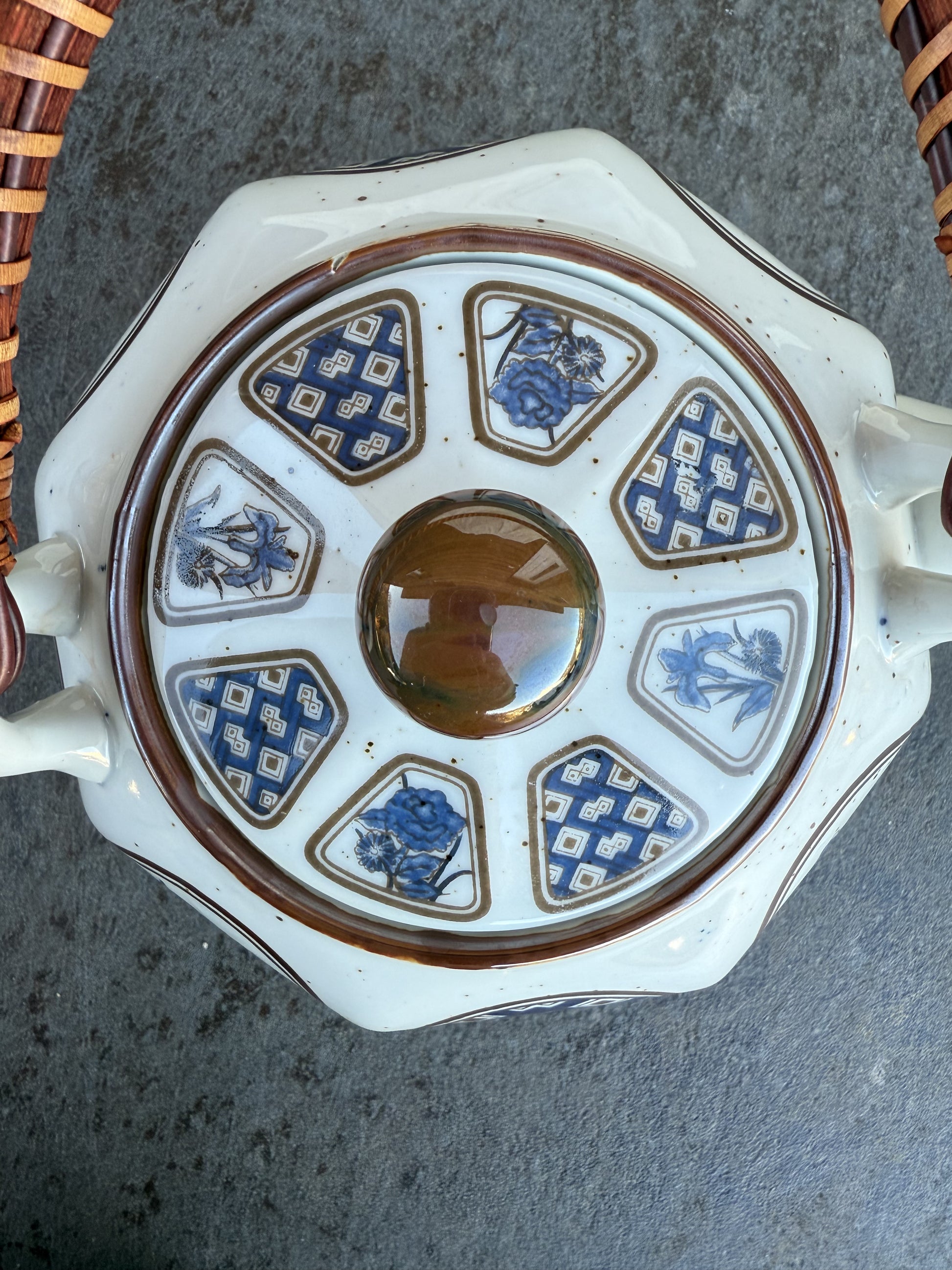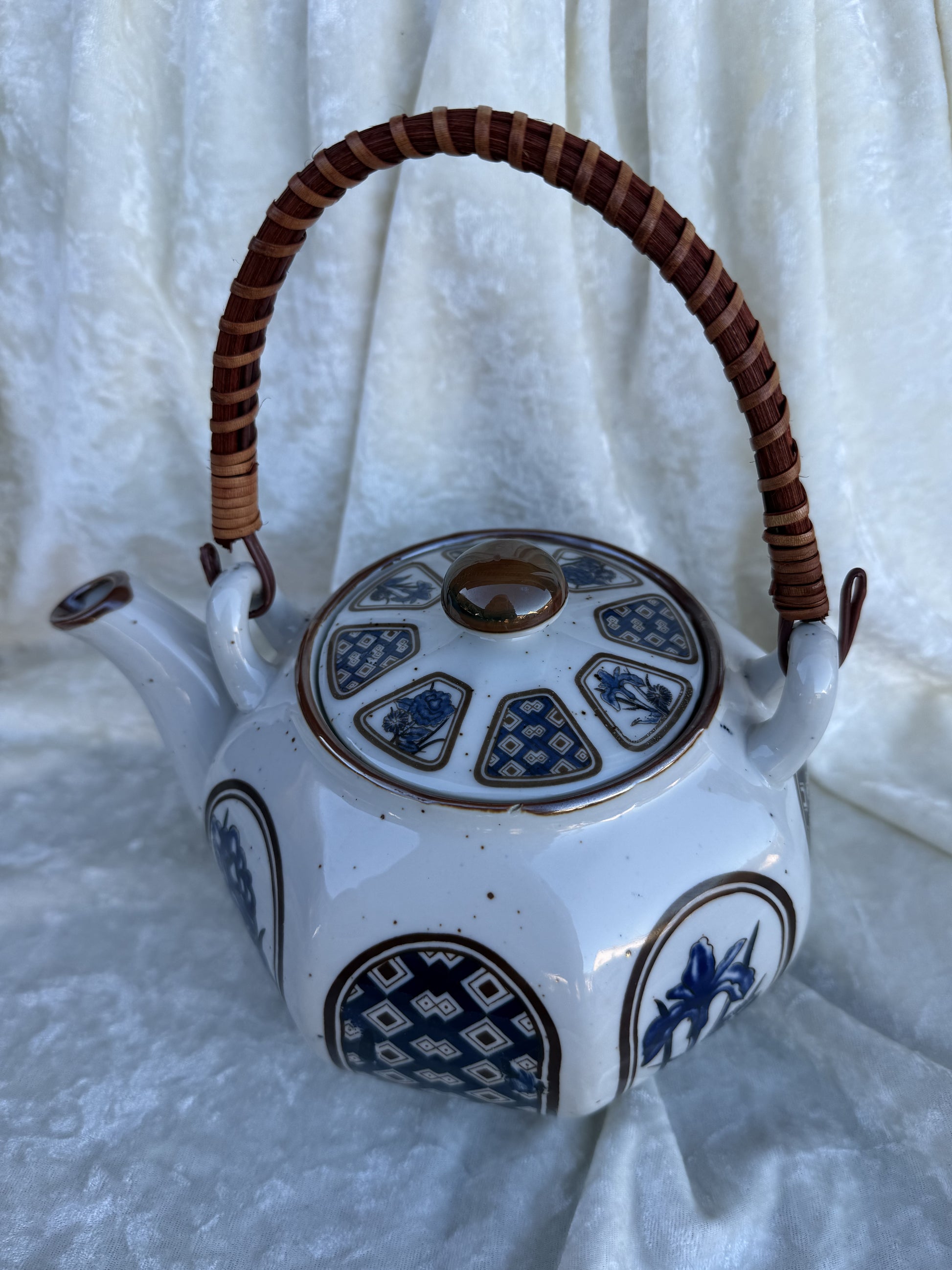 Magnifique théière (probablement japonaise) en très bon état global malgré les motifs sur le couvercle qui ont un peu vieilli et quelques défauts de fabrication au niveau de la peinture que vous pouvez identifier sur les photos.