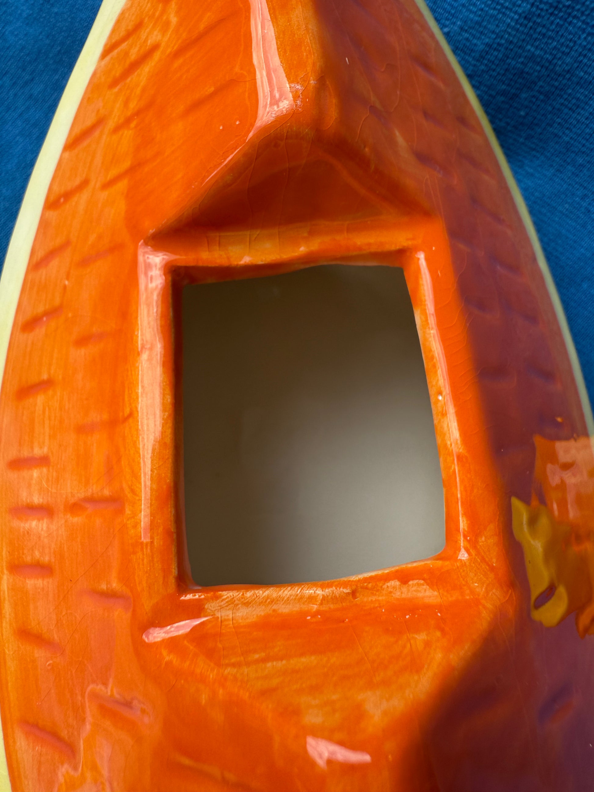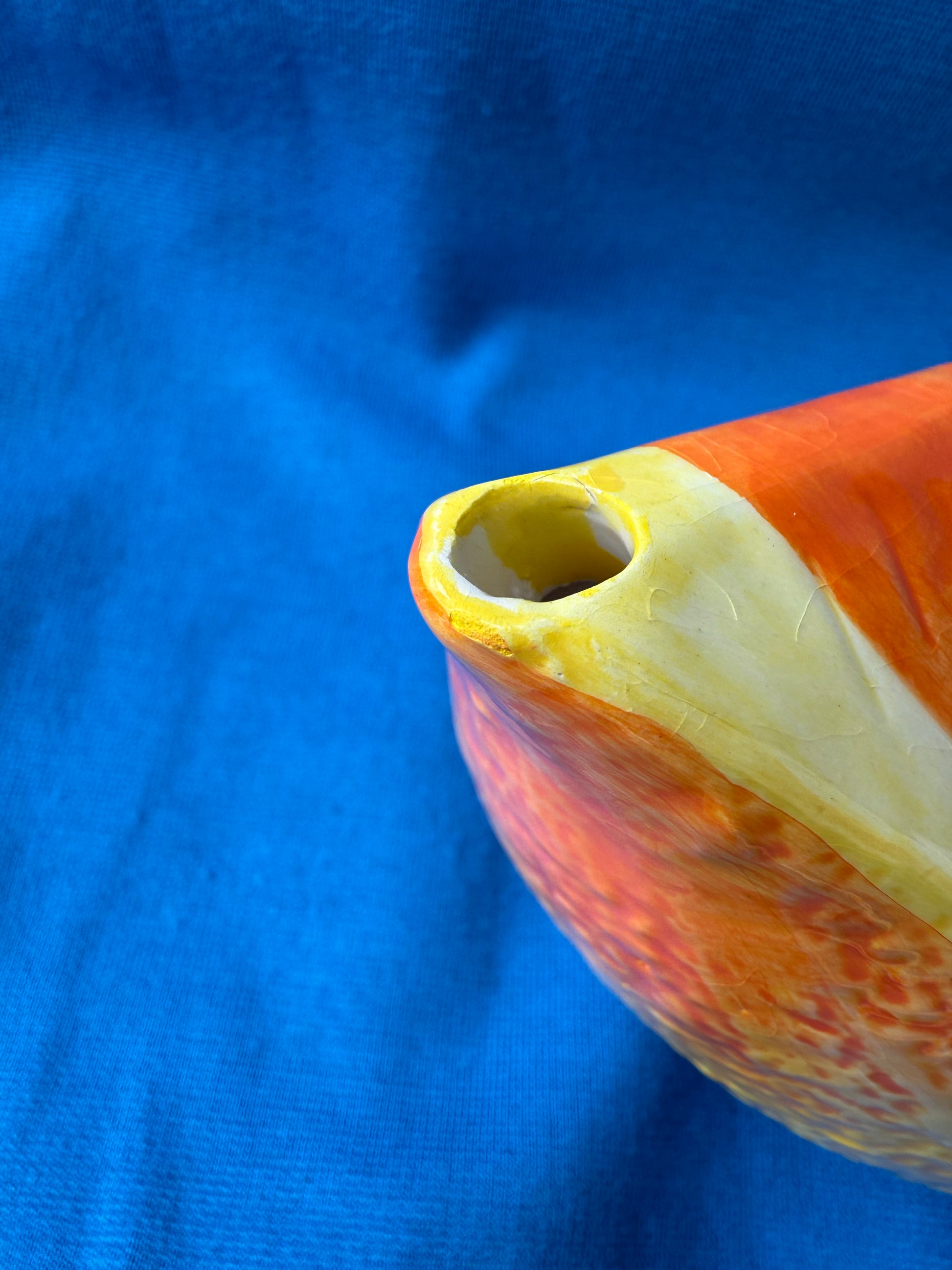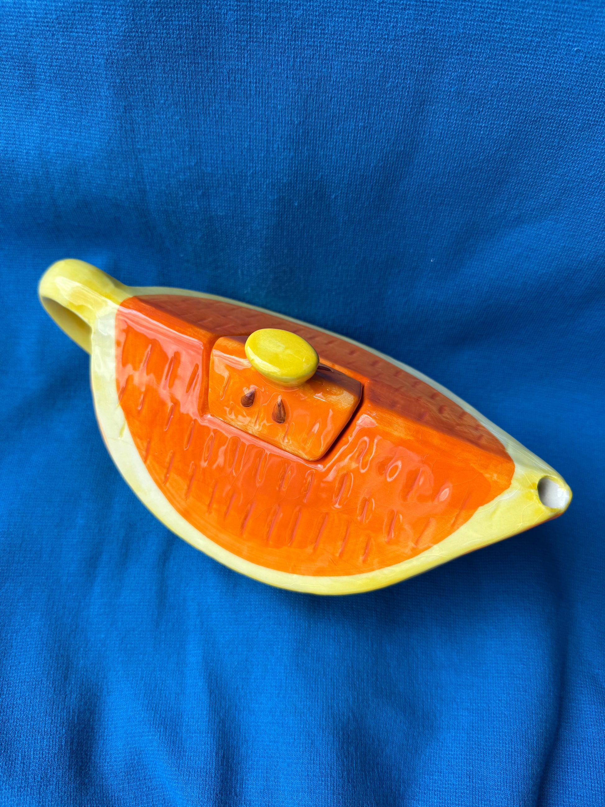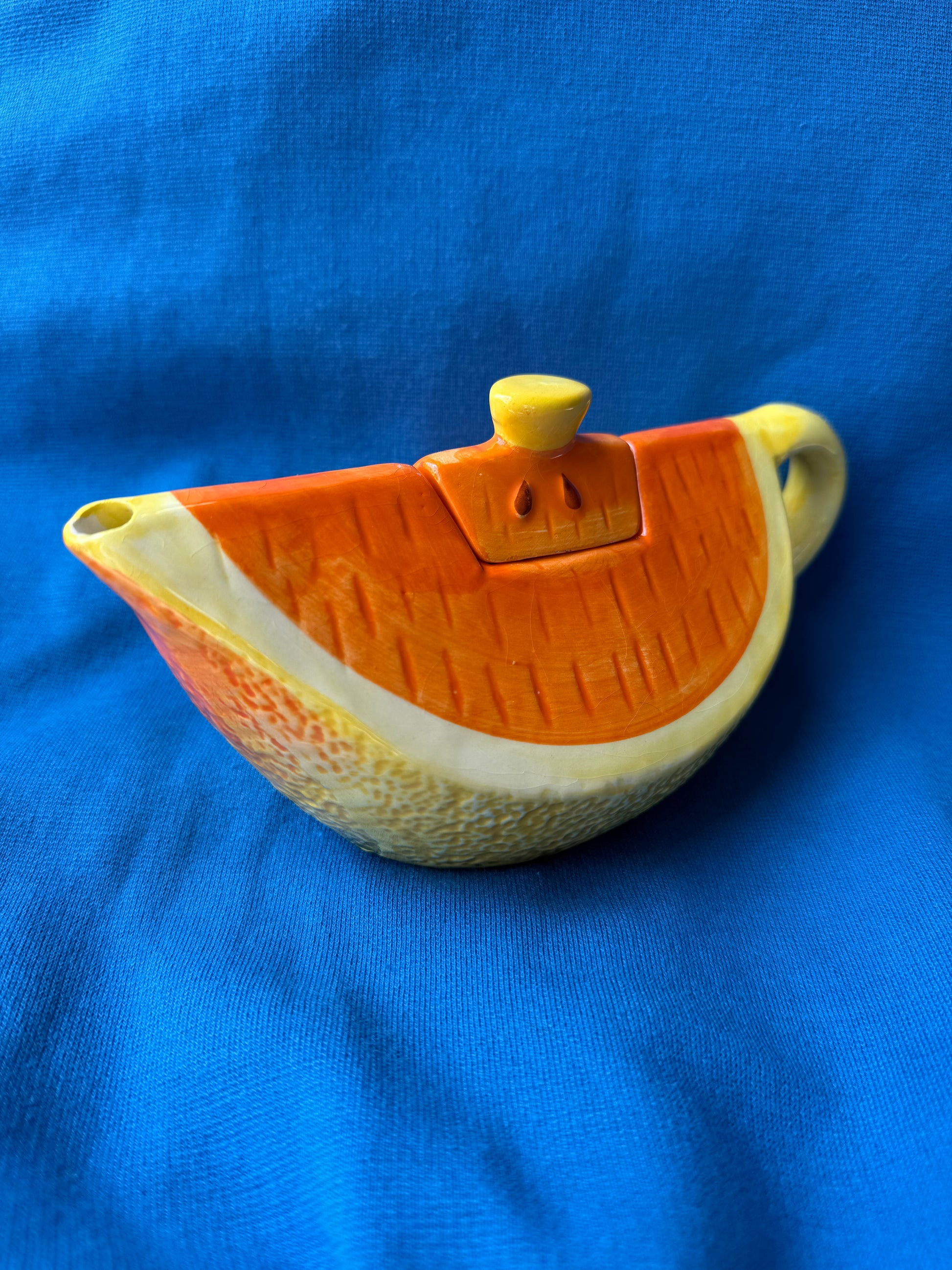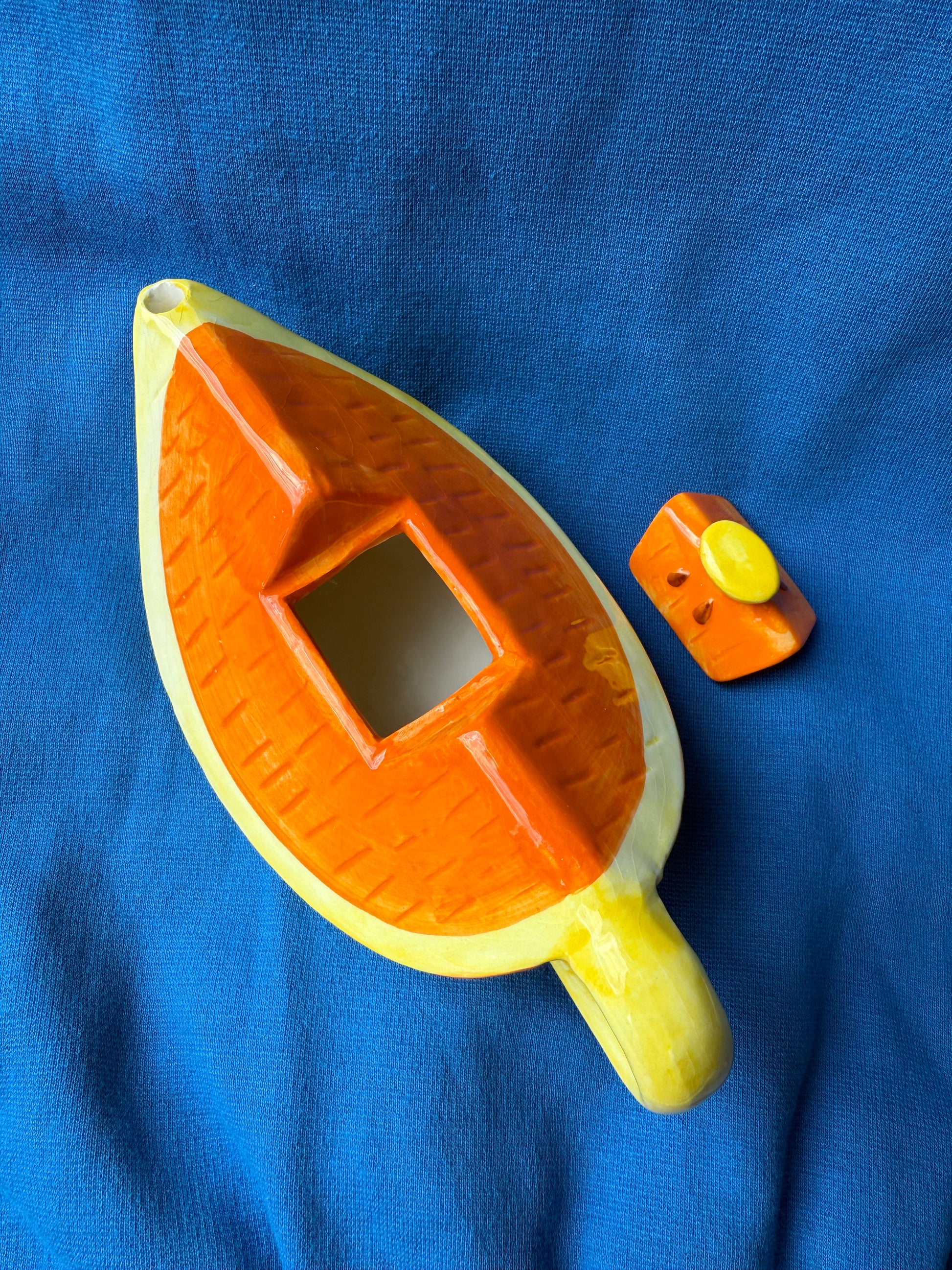 Magnifique théière originale aux couleurs intenses. Elles est en très bon état, on a rajouté quelques points de peintures et de vernis à certains endroits vers le couvercle et le bec verseur, mais ça ne se distingue que lorsque l'on se concentre sur la théière pour les chercher. La théière est en céramique.