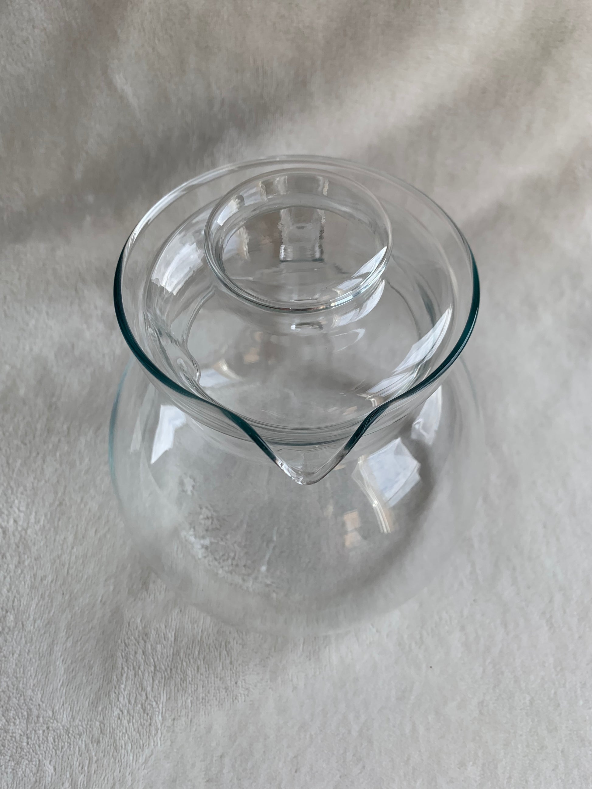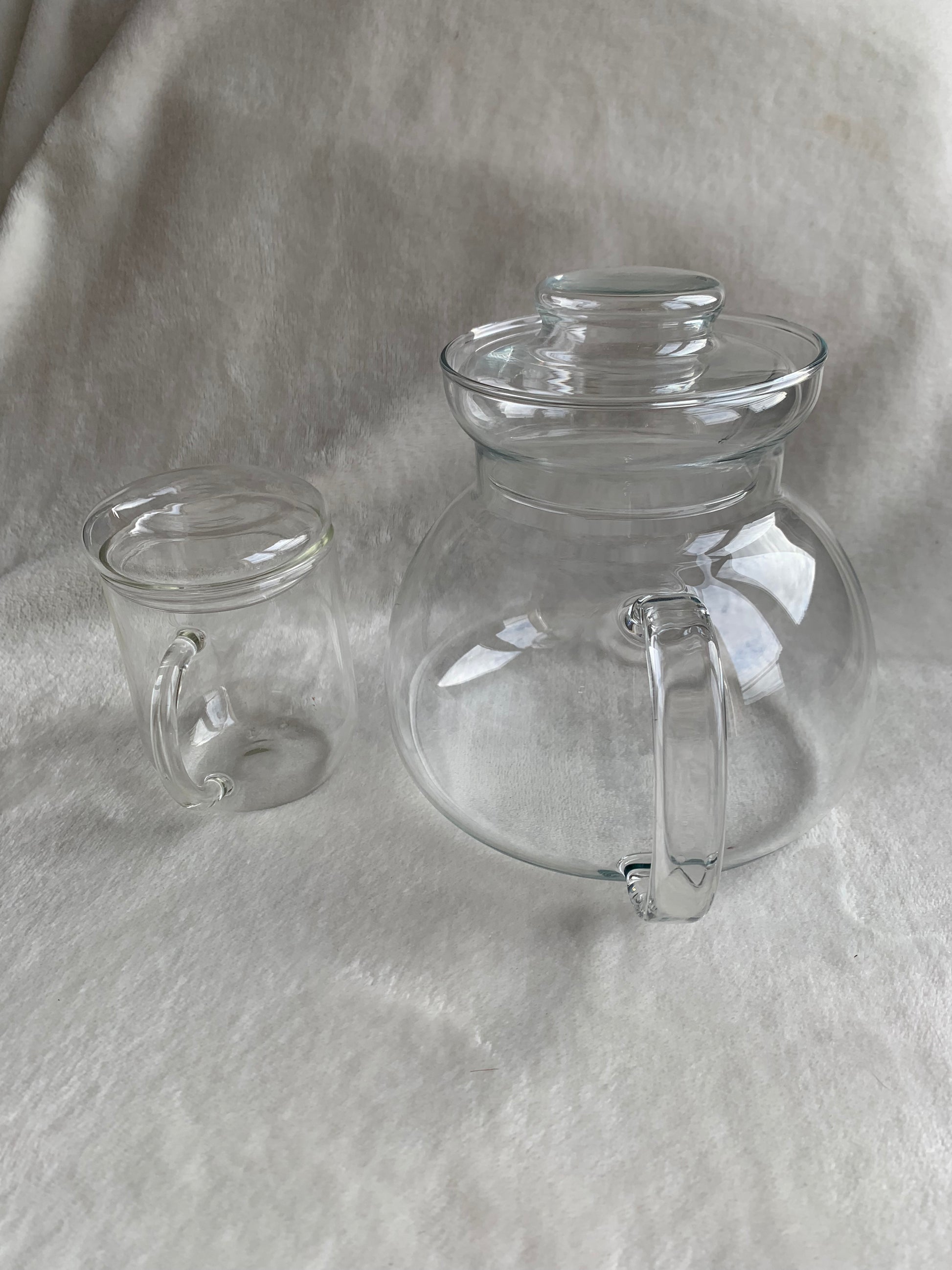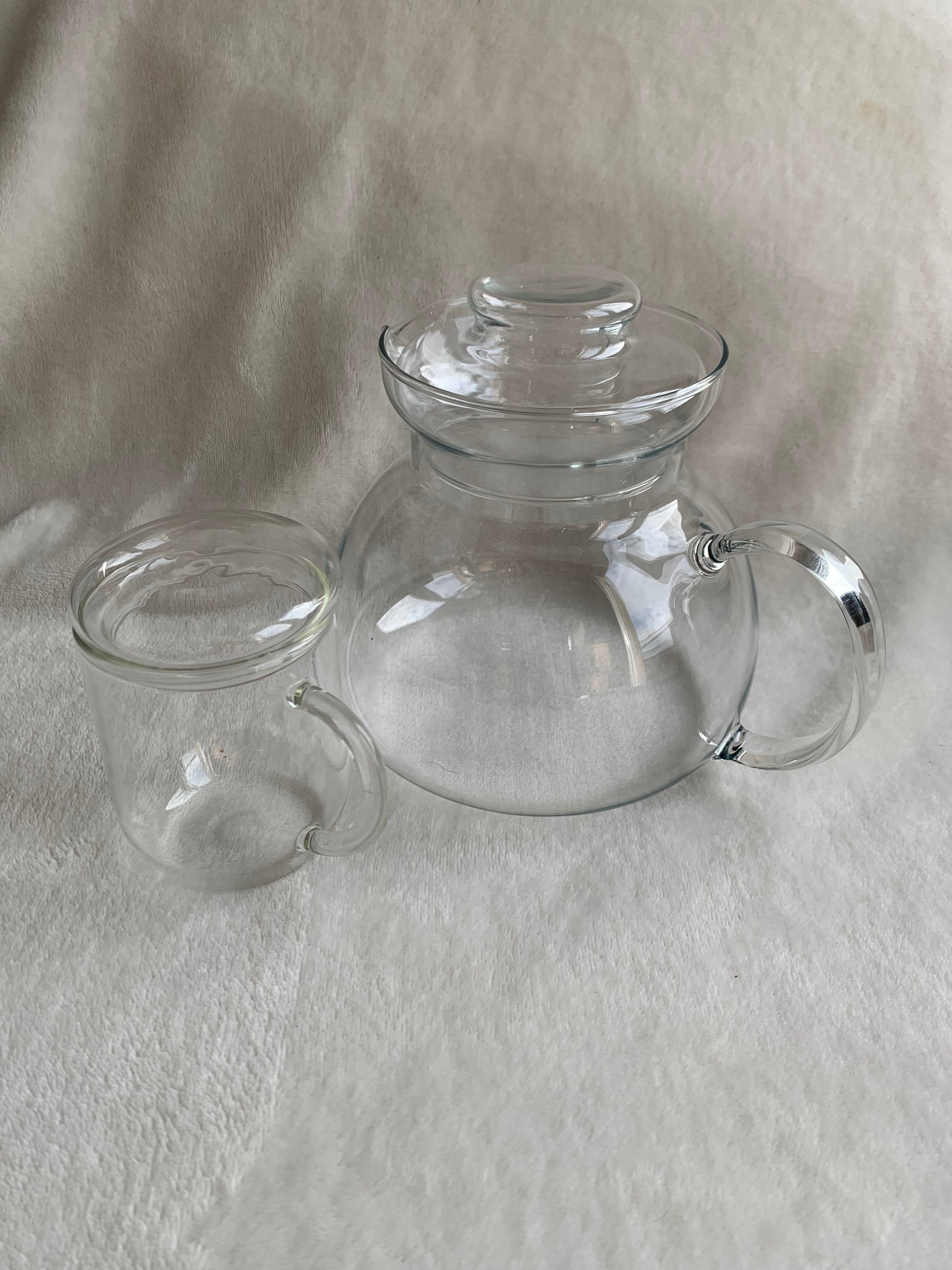 Duo théière avec petite tasse transparente et couvercle pour garder le liquide au chaud. Les deux sont en verre fin. Il y a des petites tâches sur le bas de la tasse (voir dernière photo).
