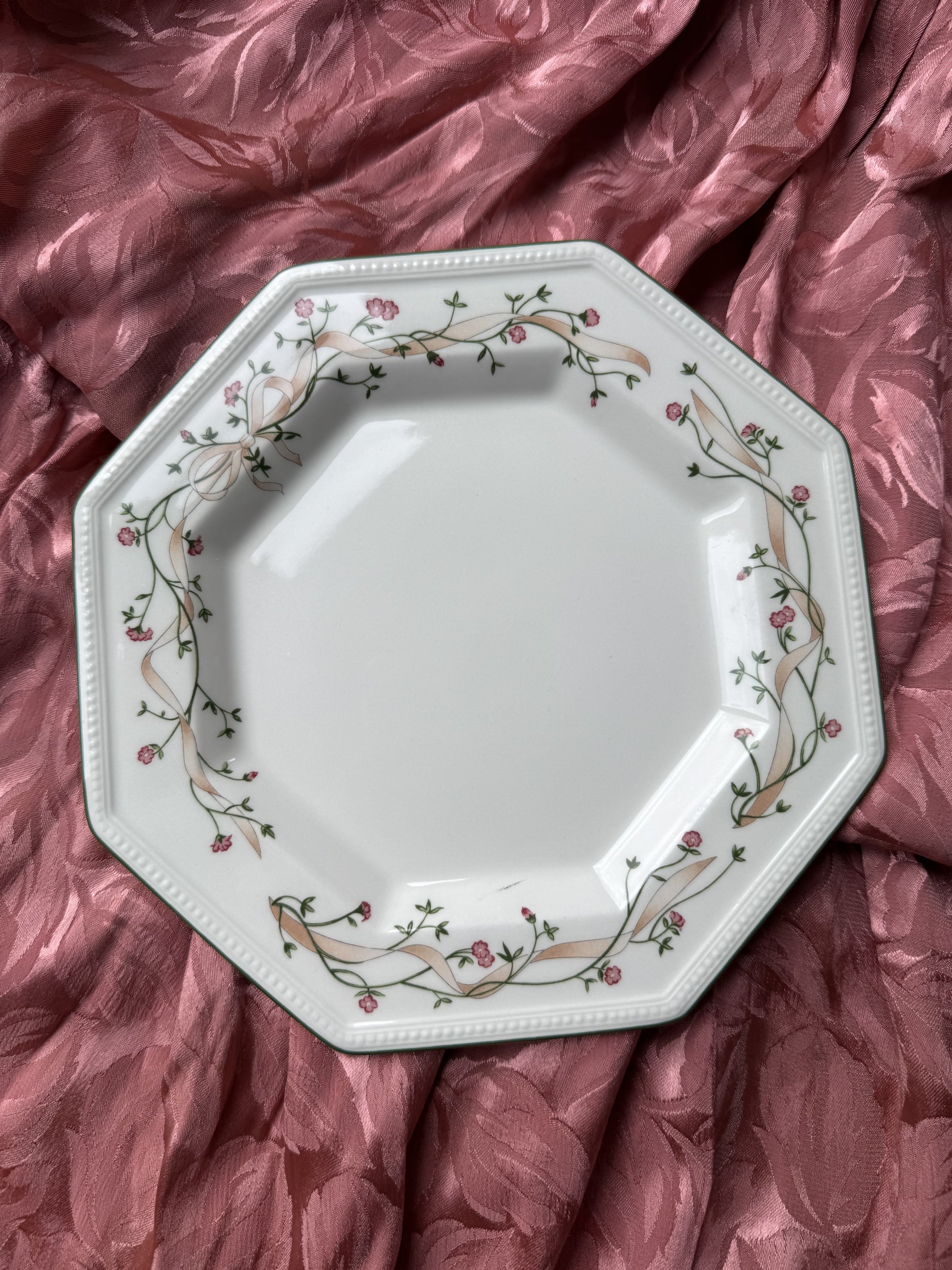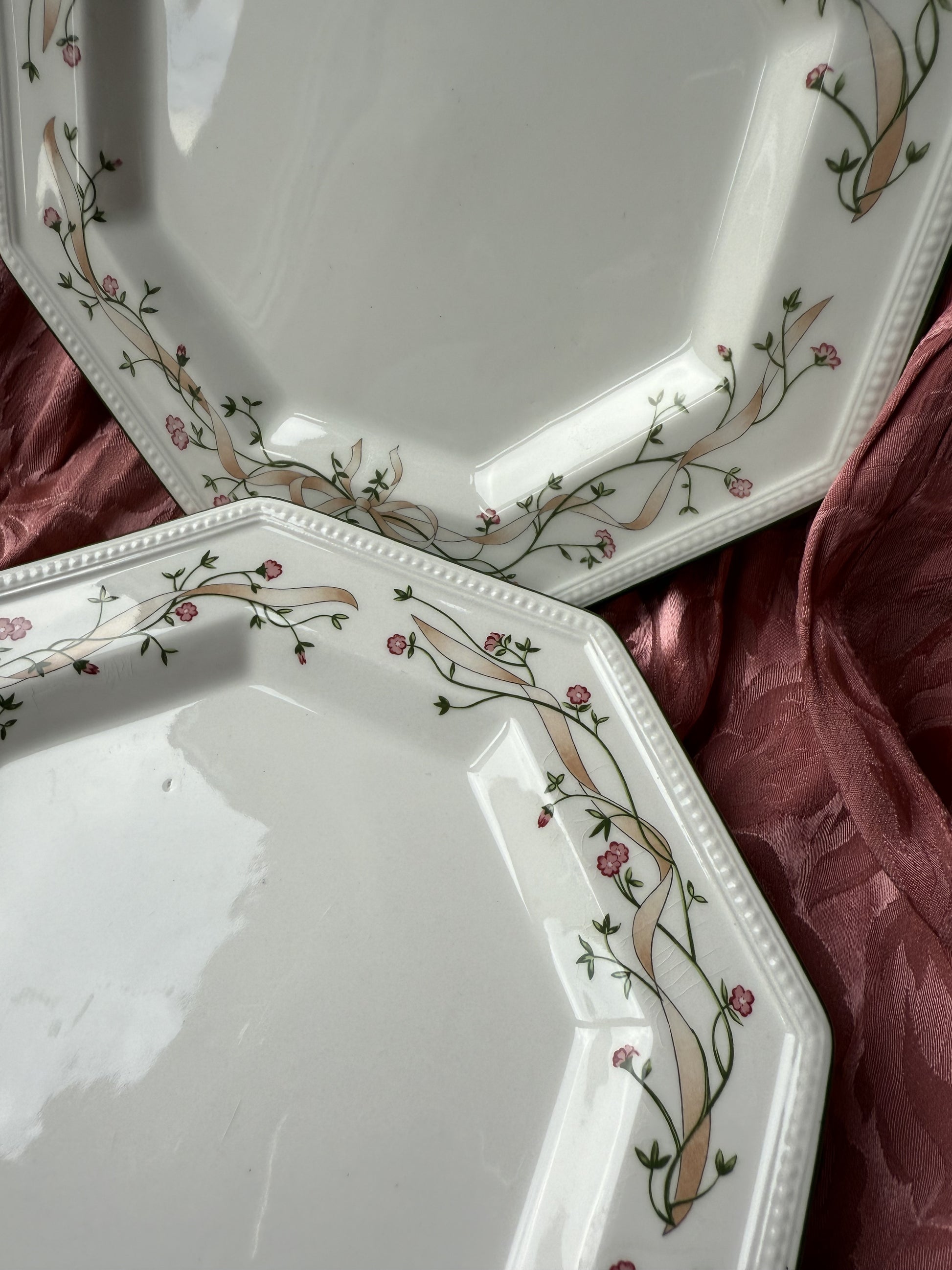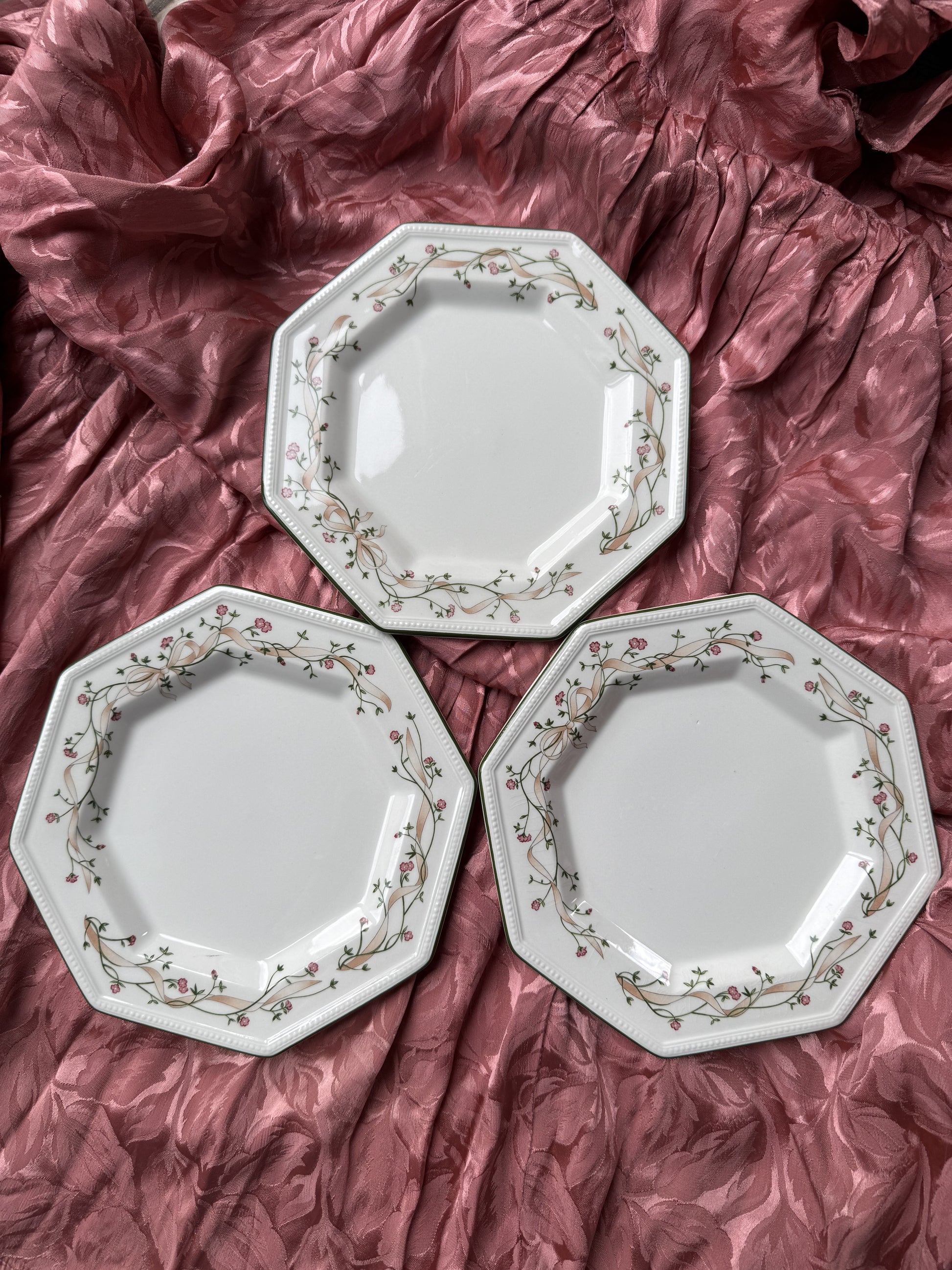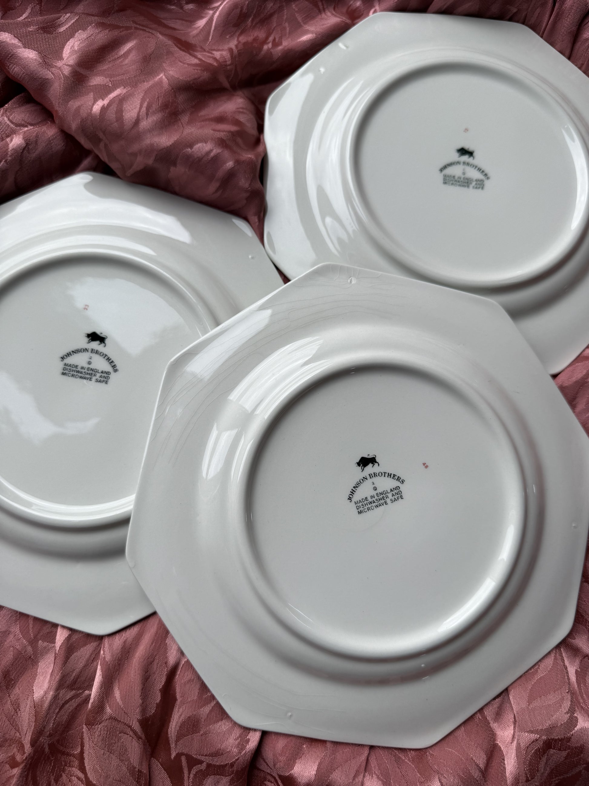 Trois sublimes assiettes en forme octogonale Johnson Brothers fabriquées en Angleterre. Elles peuvent aller au lave-vaisselle et au micro-ondes.