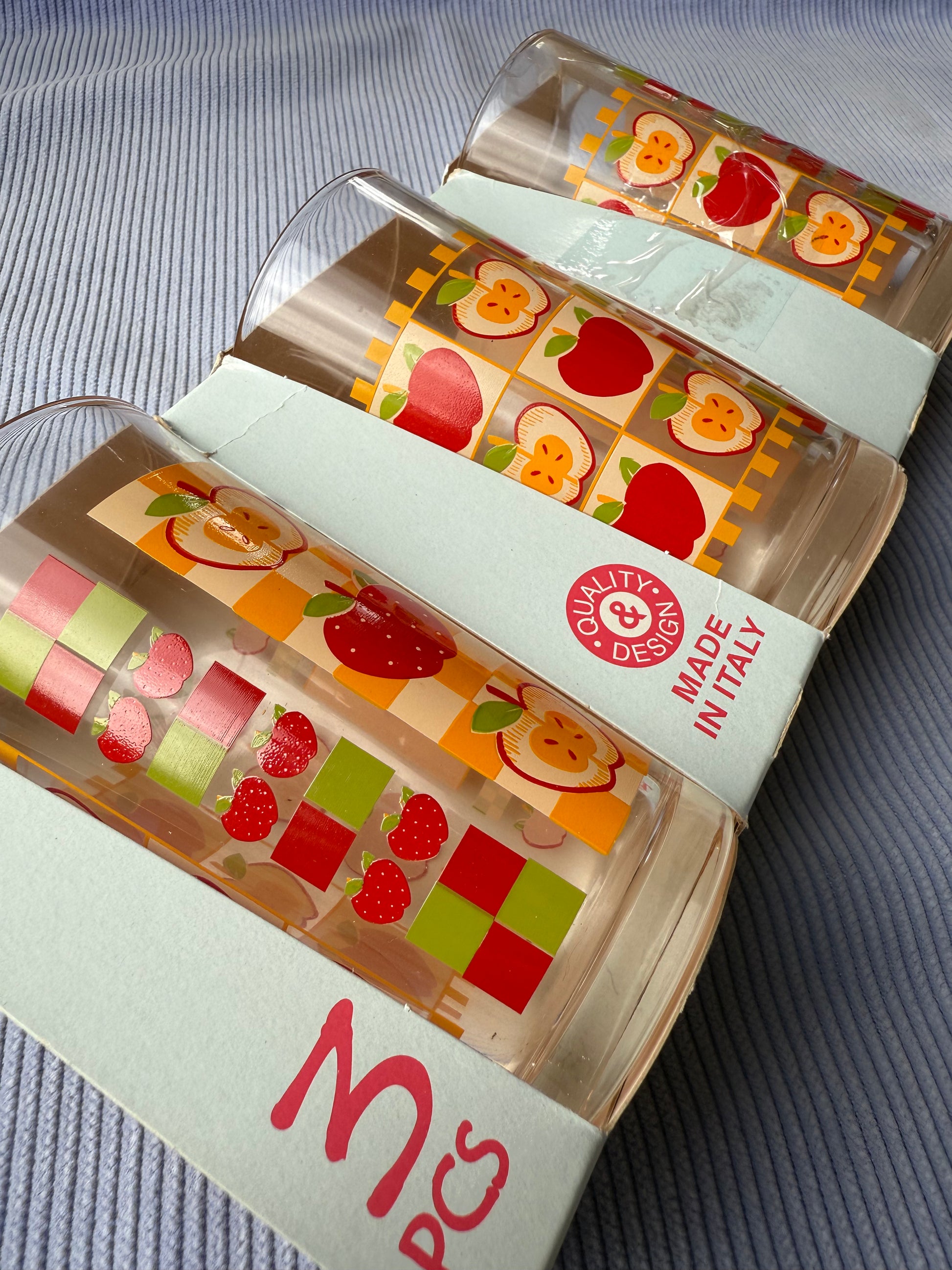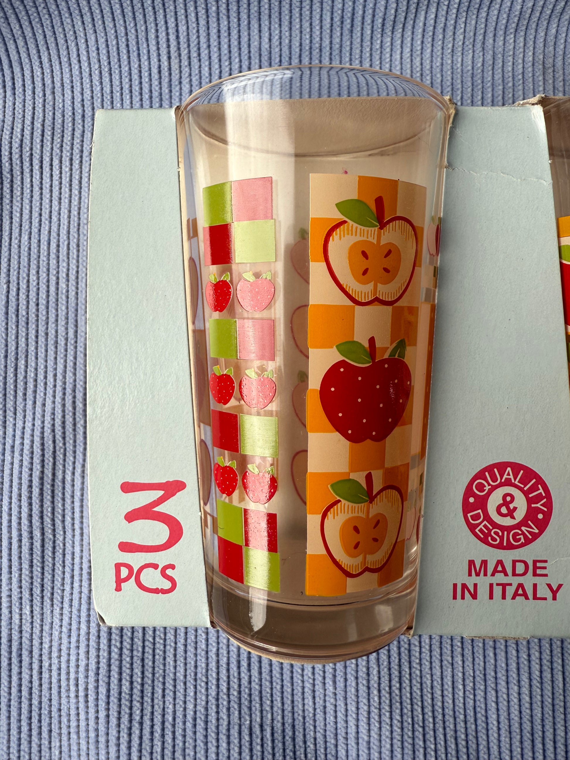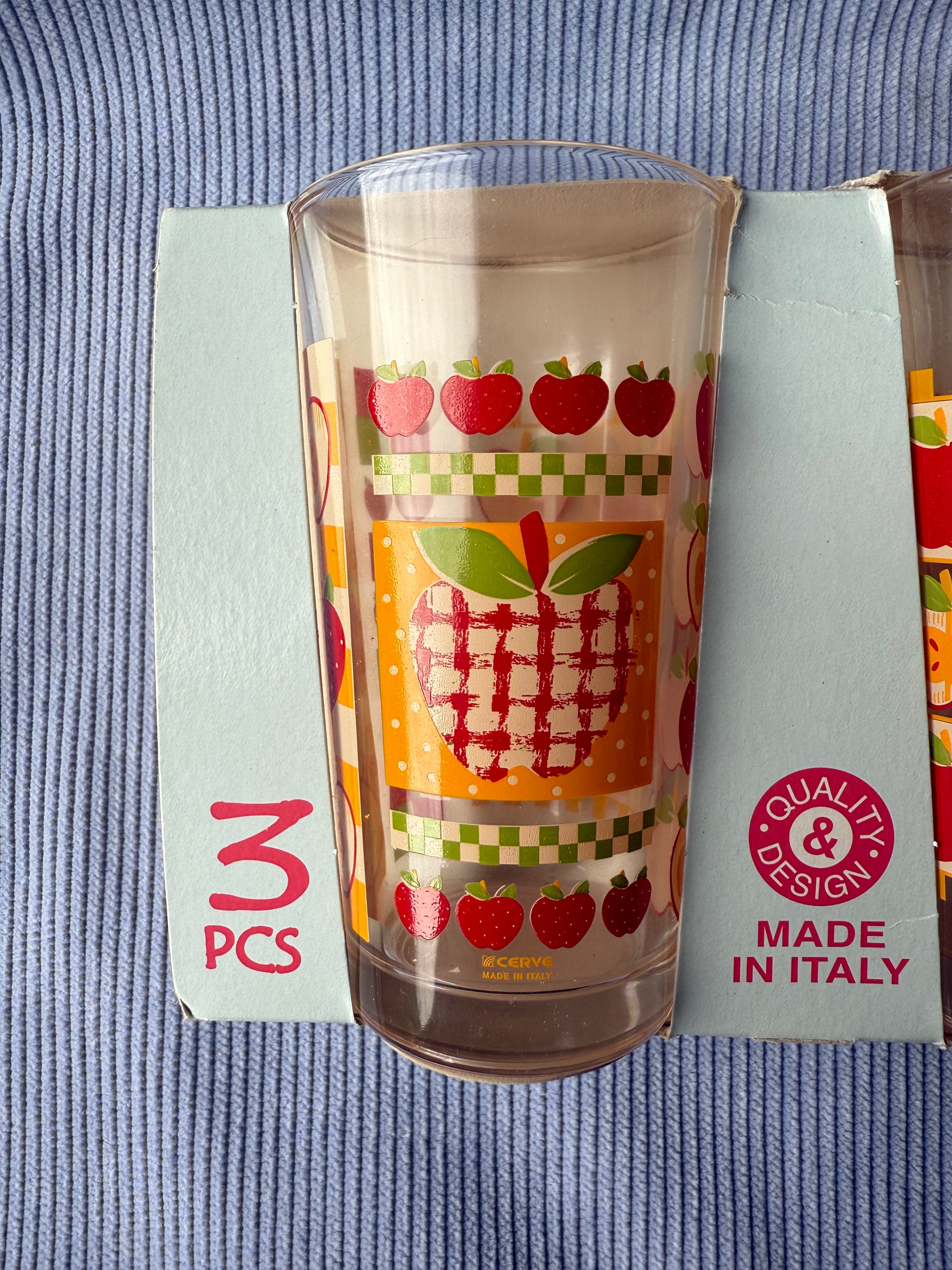 Petit voyage dans le temps avec ces trois magnifiques verres de 25 cl Linda DeValBor by Cerve, Made in Italy. Ils sont neufs, dans leur emballage d'origine. Résistants au lave vaisselle. Motifs pommes et damiers.