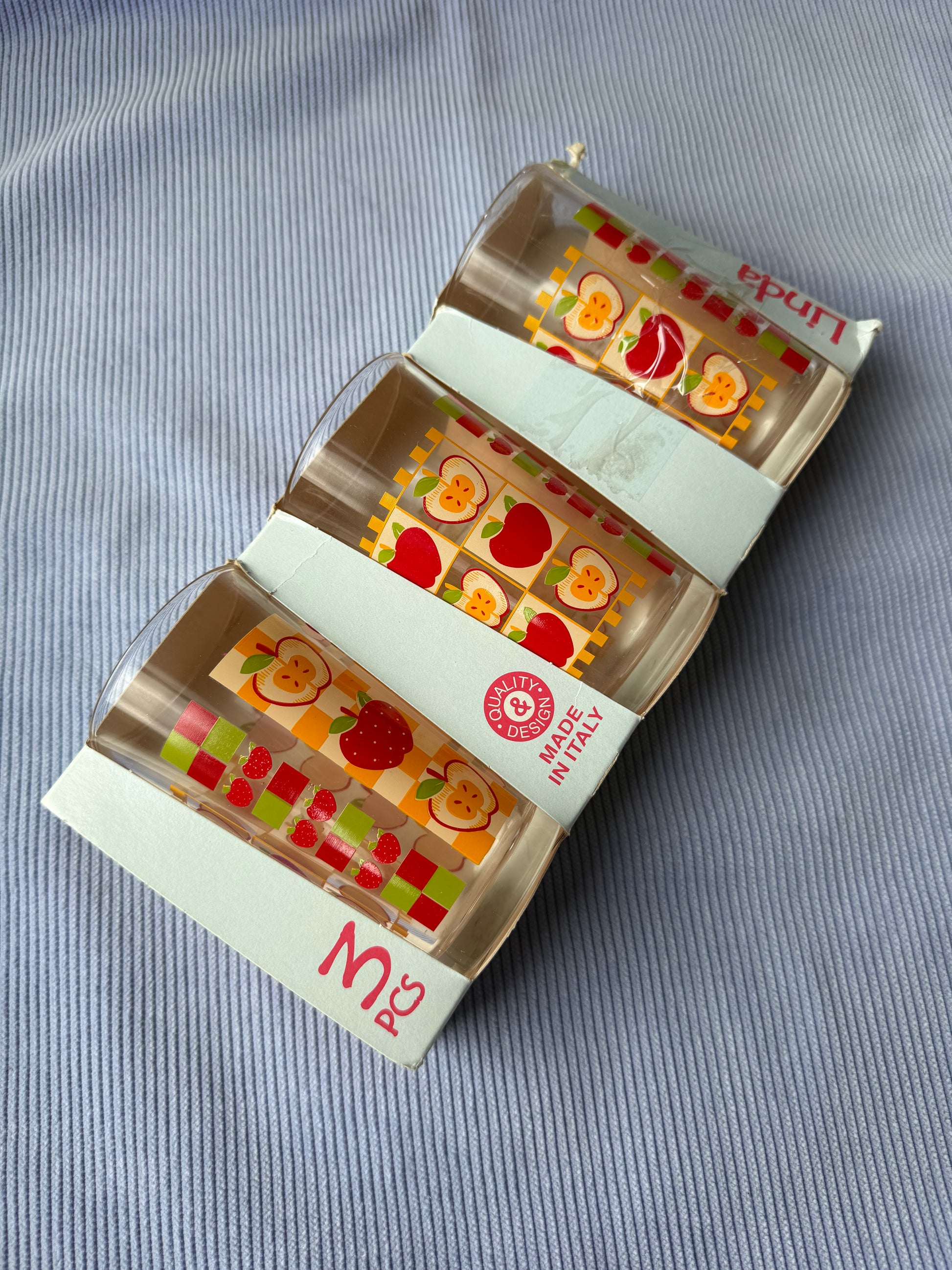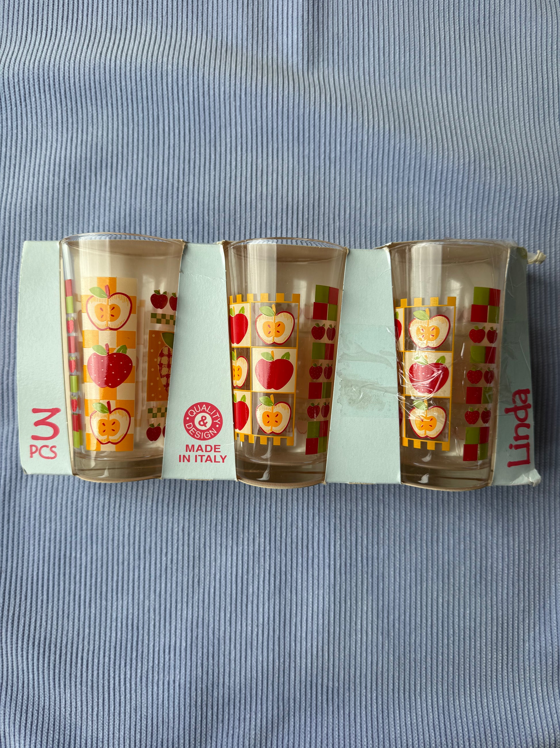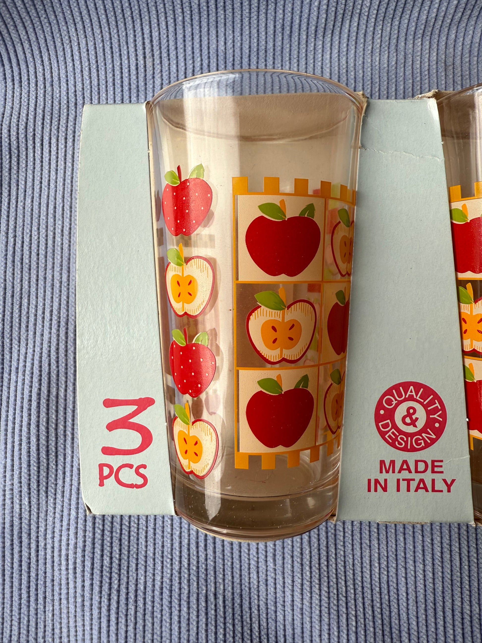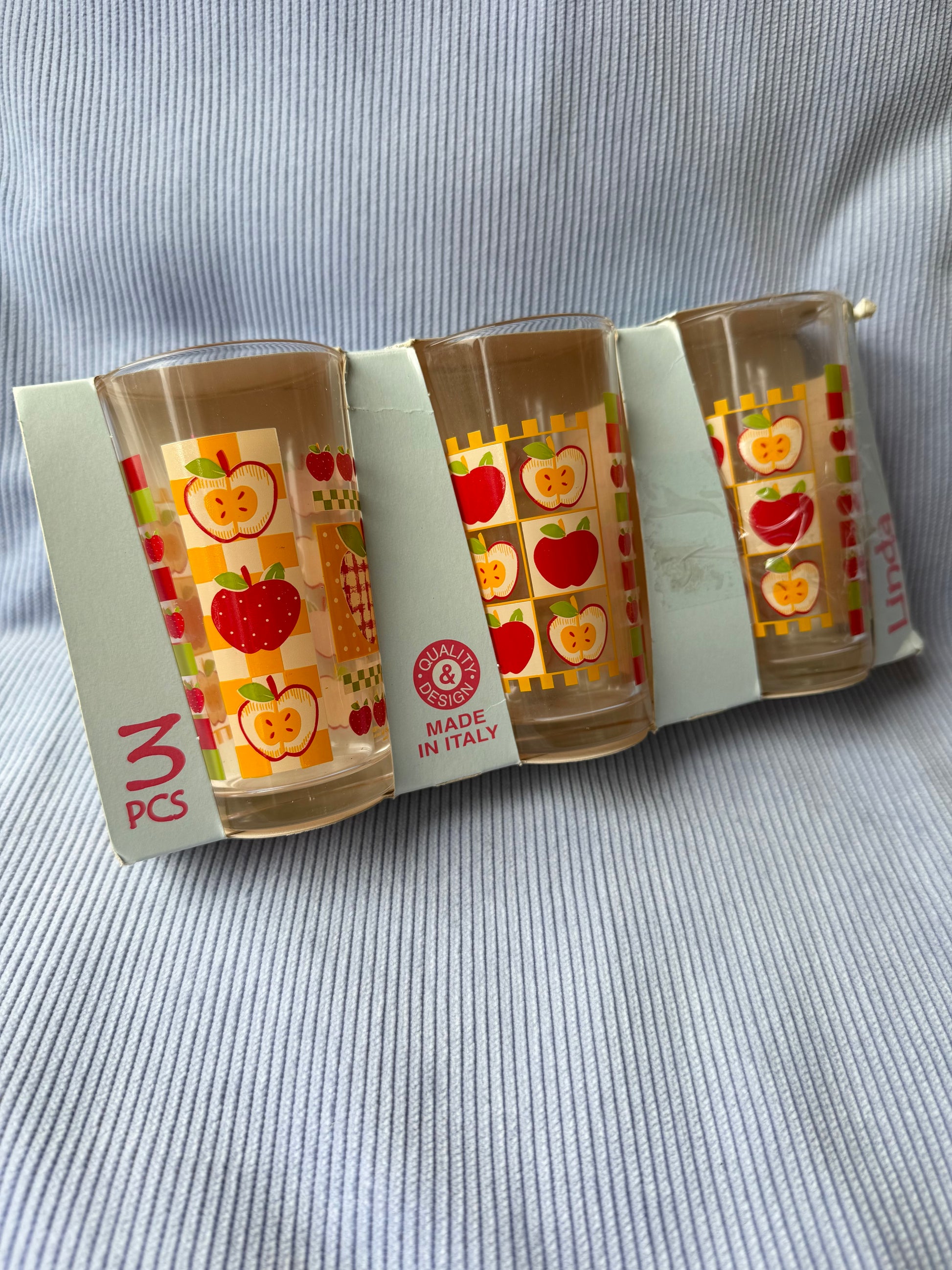 Petit voyage dans le temps avec ces trois magnifiques verres de 25 cl Linda DeValBor by Cerve, Made in Italy. Ils sont neufs, dans leur emballage d'origine. Résistants au lave vaisselle. Motifs pommes et damiers.