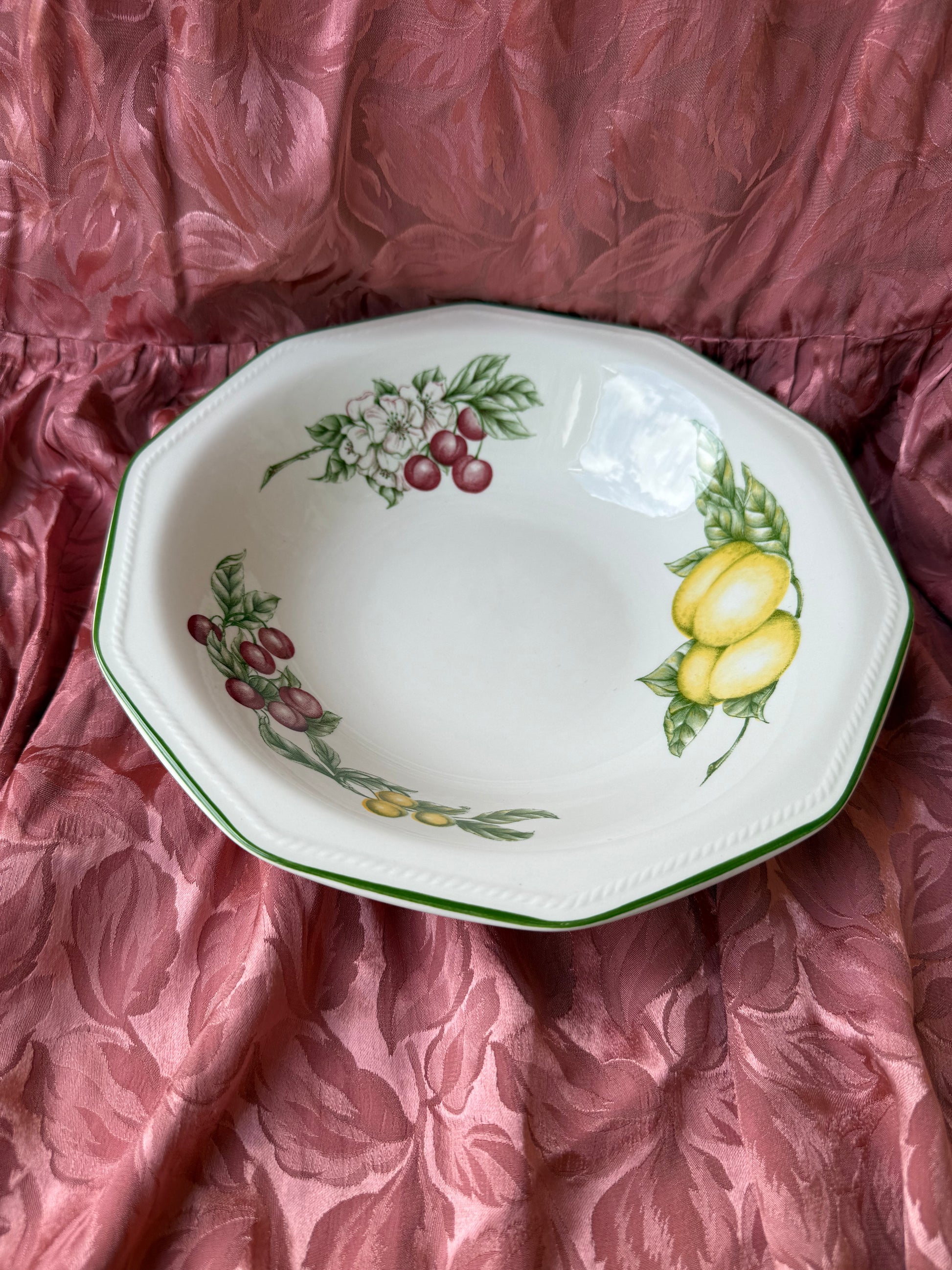 Magnifique assiette creuse / plat en forme décagonale. Motifs vintage de fruits. Elle est en porcelaine, de la marque Churchill made in England. Elle va au micro-onde et au lave vaisselle. Elle est en super état.